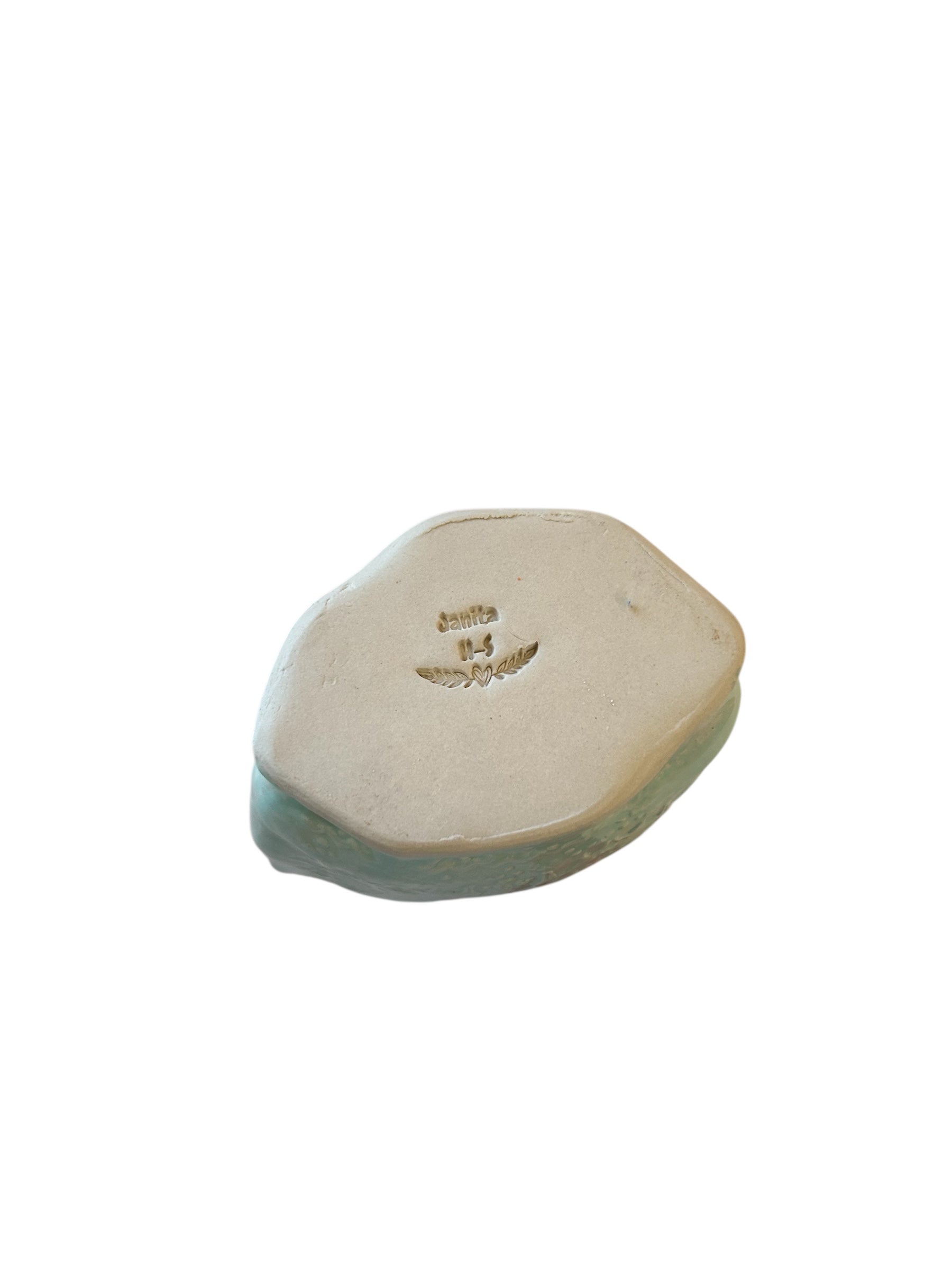 Medium textured bottle vase with a rolled deer and evergreens in aqua. Slab construction. Food, dishwasher, and microwave safe.