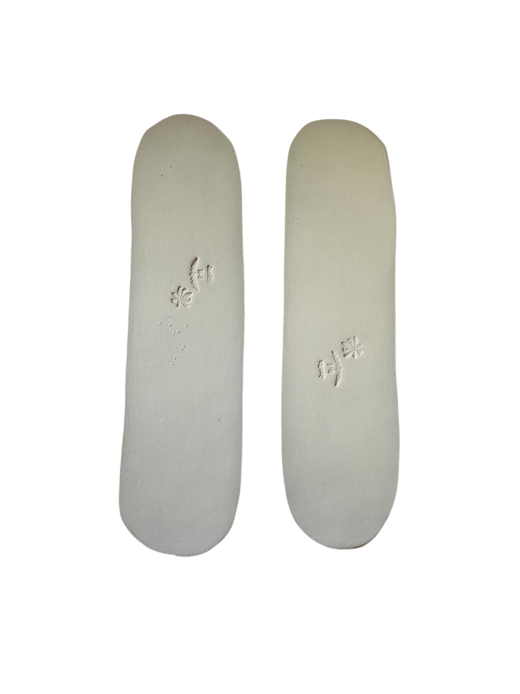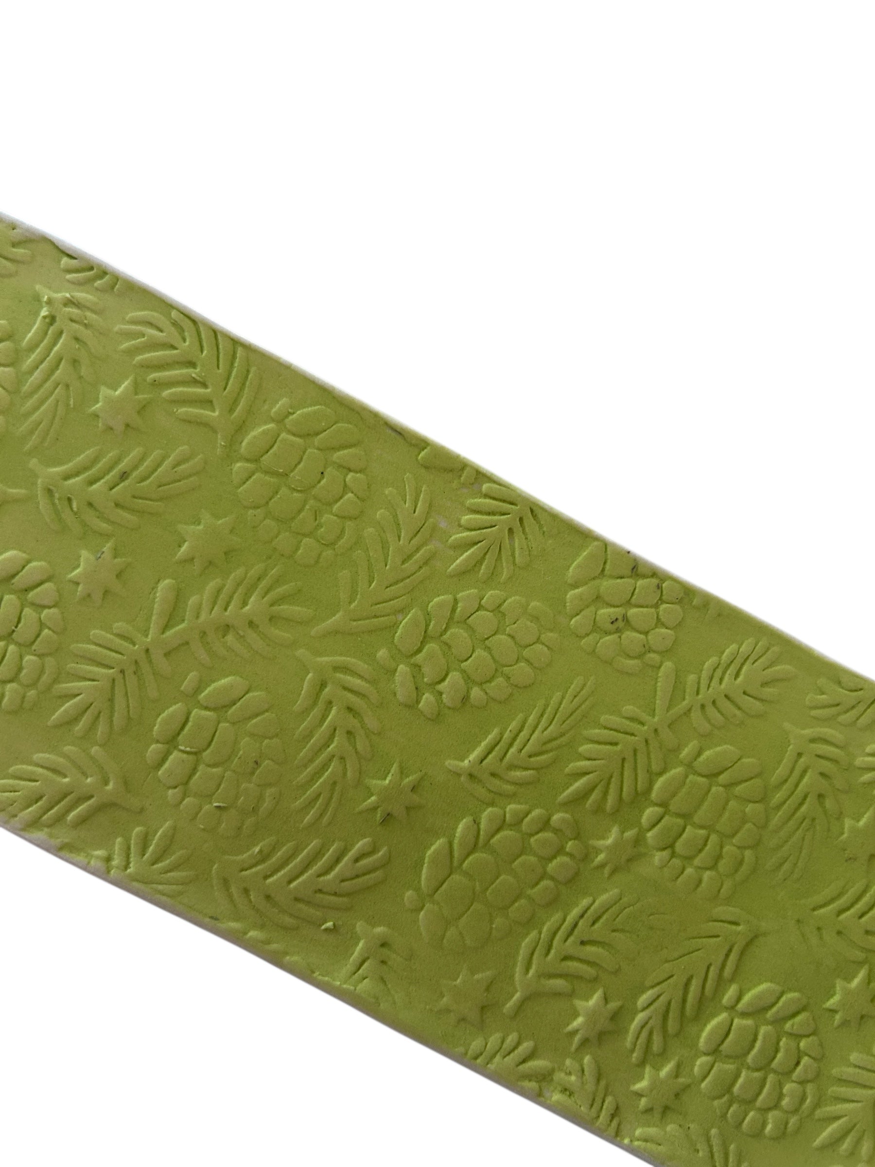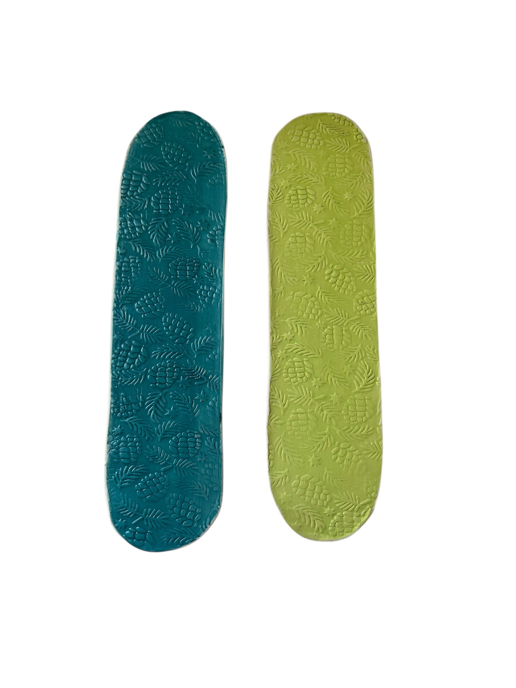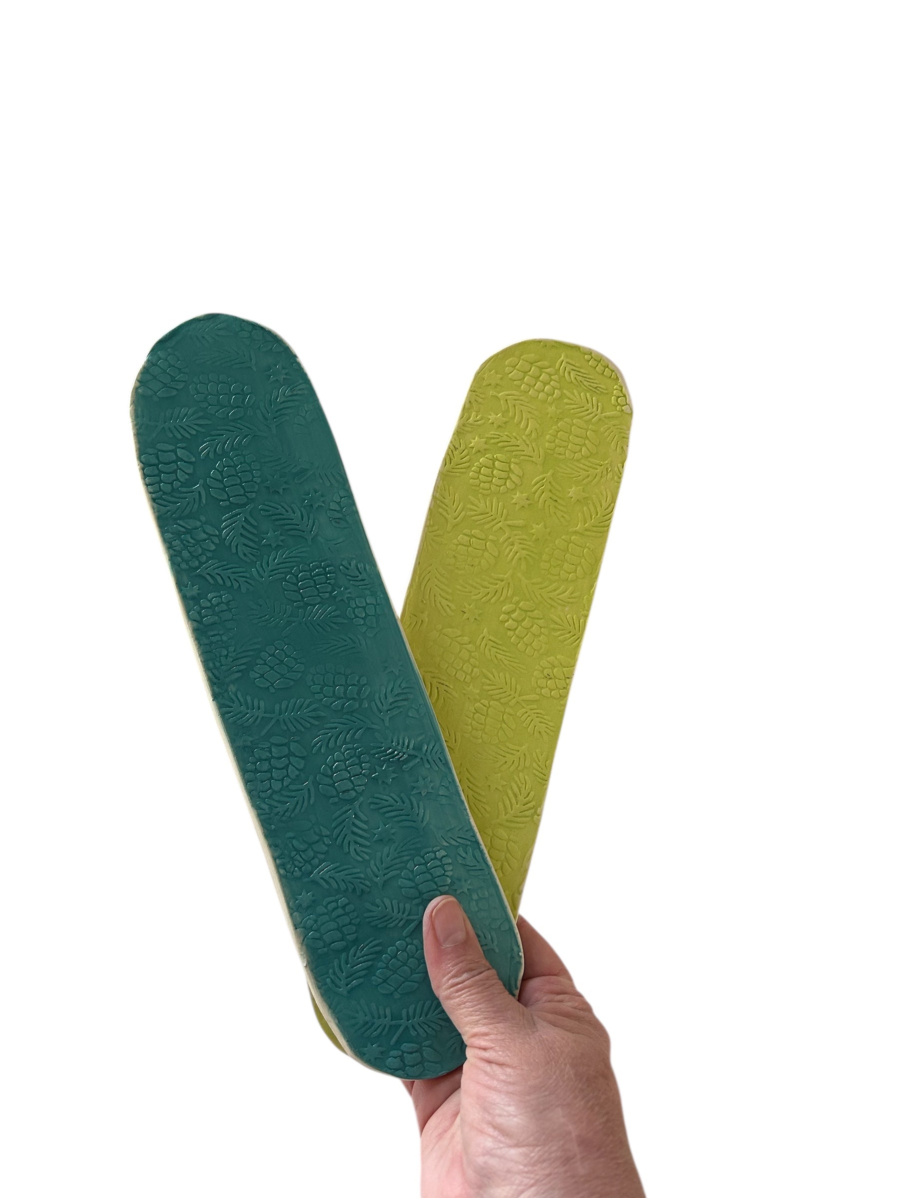 Long oval textured bread warmers in your choice of two different colors: pear green or teal blue. Long oval shape is excellent for keeping loaves of bread warm. Each is textured with pine cones and evergreens. Simply warm the bread warmers in the microwave for approximately 1 minute, wrap your baked goods in a cloth, and place your goods in or on your serving vessels, such as a basket or platter, and your breads will stay nice and warm for as long as you need. Slab construction. Food safe underglaze. Food, dishwasher, and microwave safe.