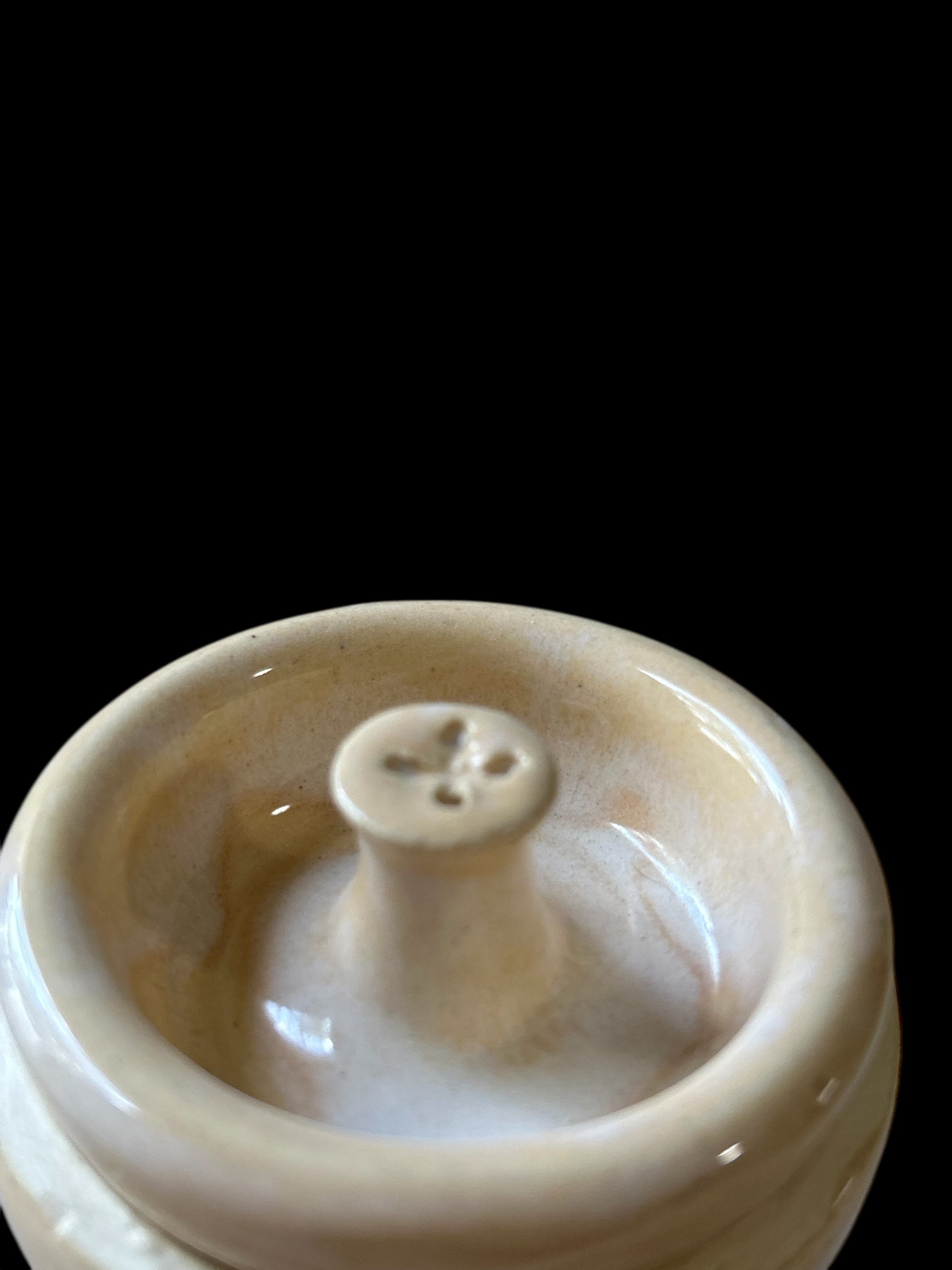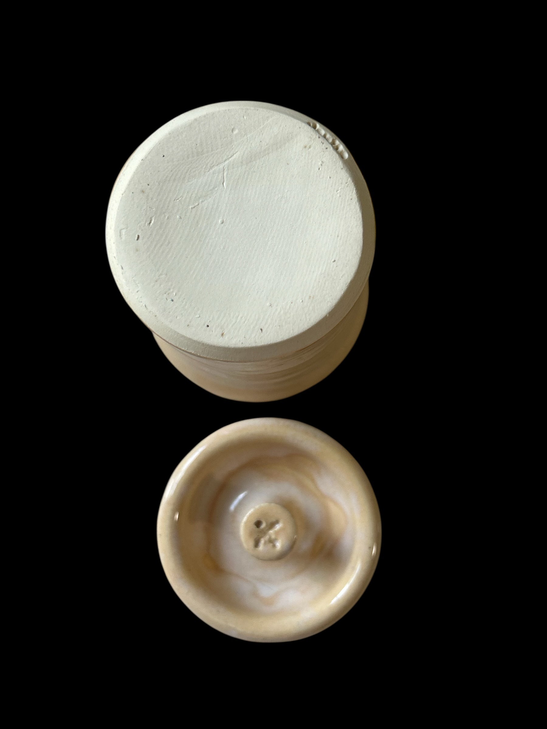One-of-a-kind jar specifically made to hold all your missing buttons. Has a drop-in lid with a button-shaped topper. Both jar and lid were shaped on the wheel and off the hump. Glazed in a pale yellow outside and white liner glaze on the inside.
