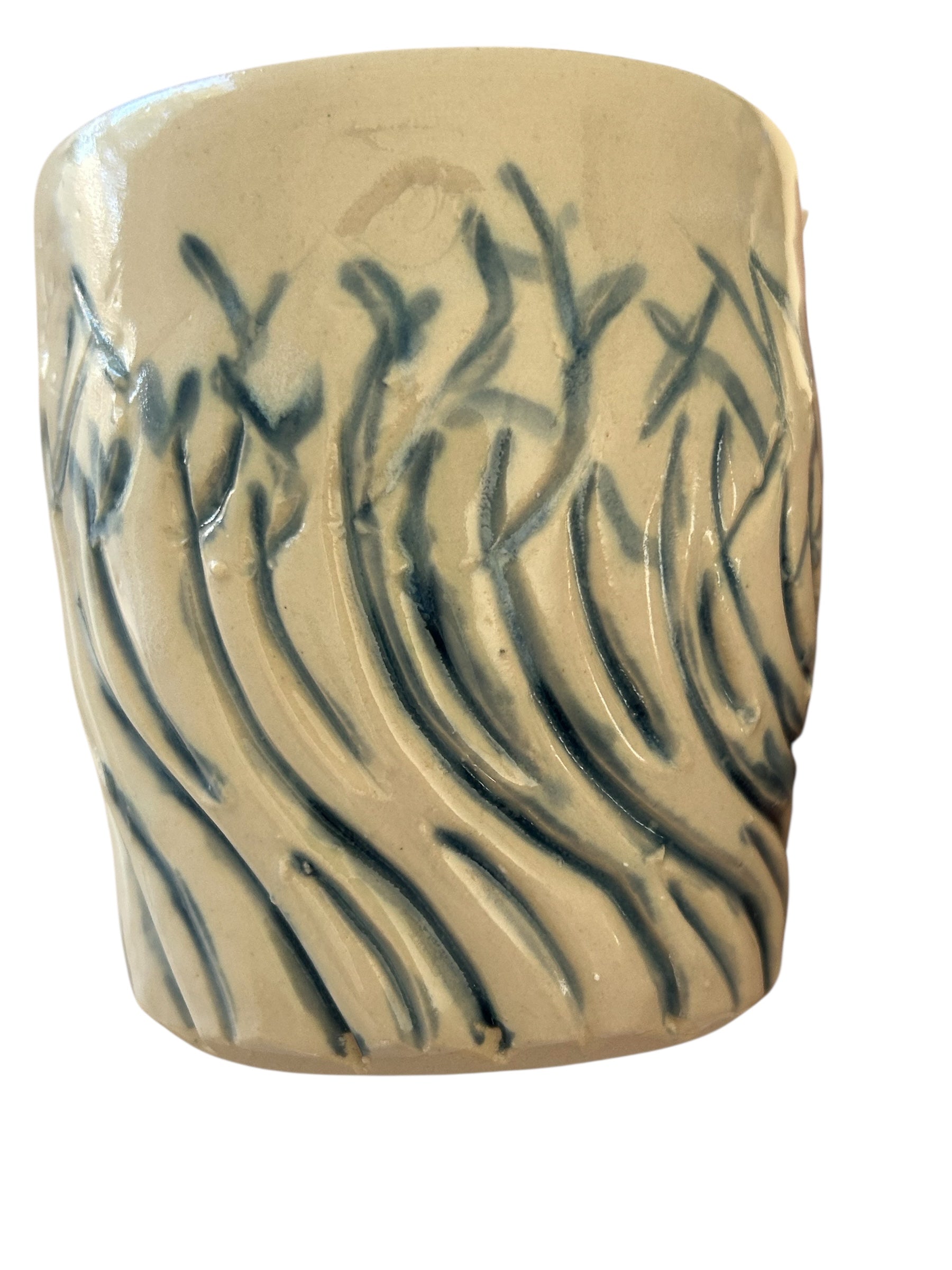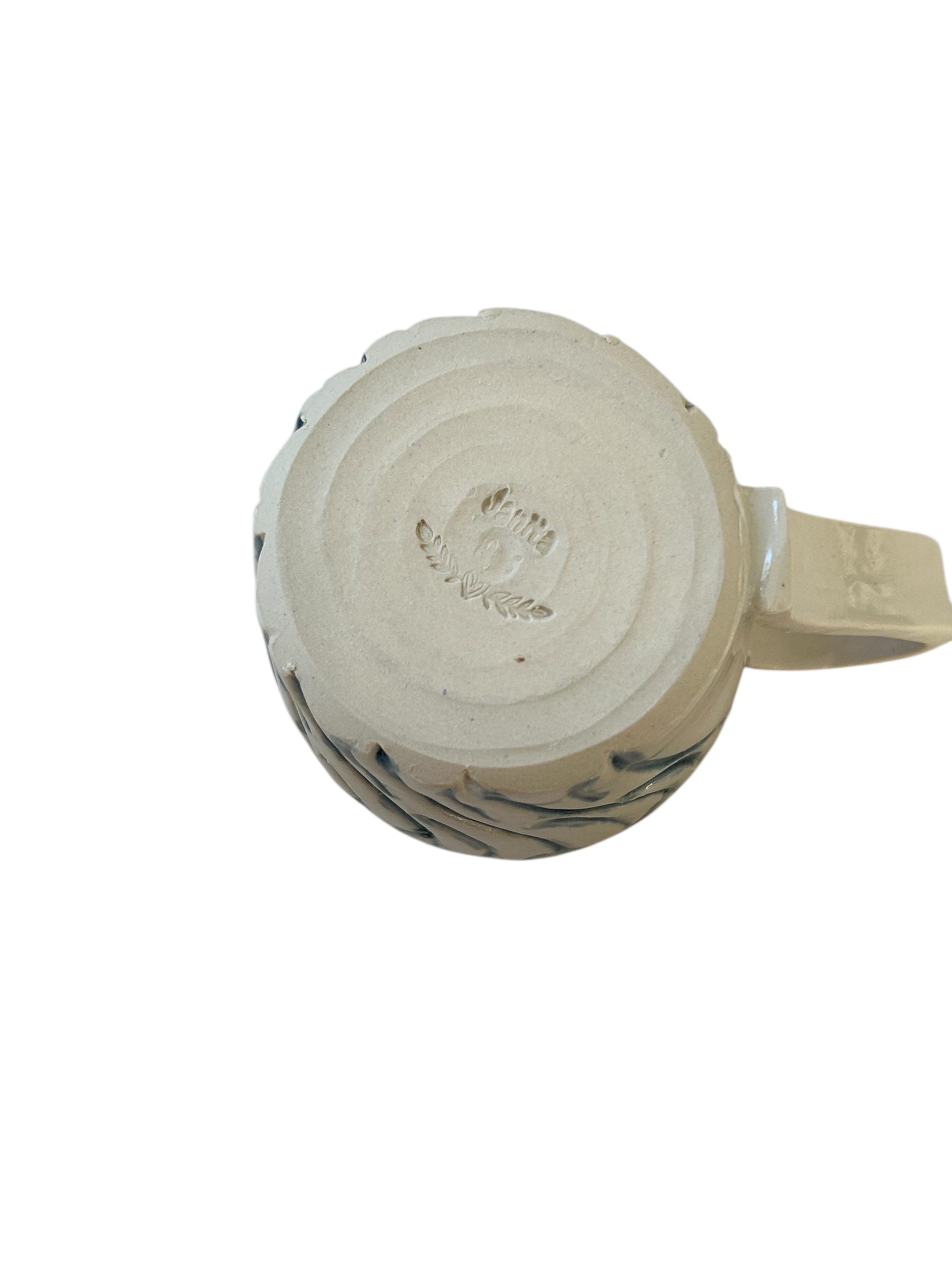 Wheel-thrown mug with hand carved abstract bare winter trees designs on a white background. Minimalism aesthetic. Food, microwave, and dishwasher safe.