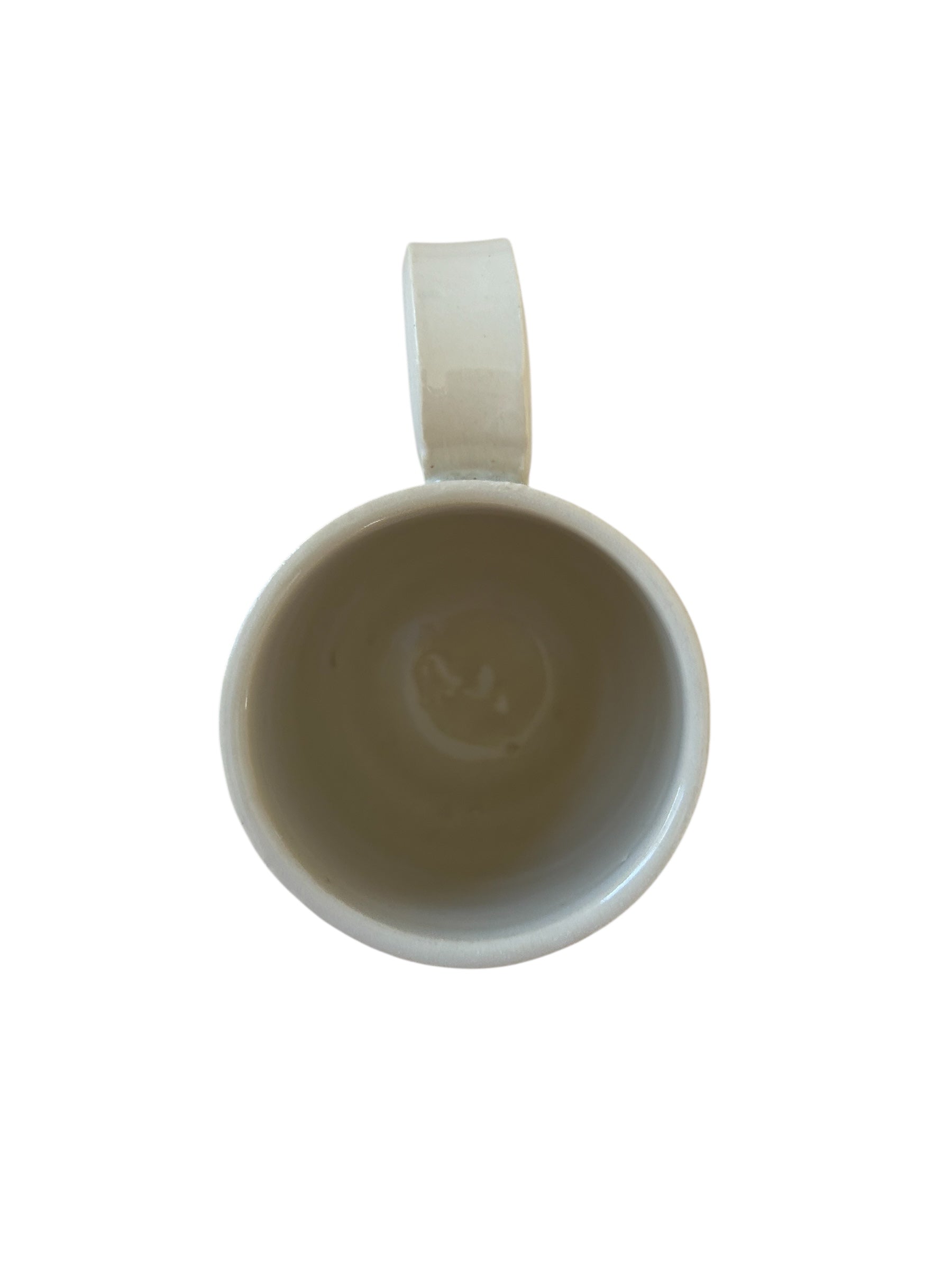Wheel-thrown mug with hand-carved Santa's belt buckle designs on a white background. Minimalism aesthetic. Food, microwave, and dishwasher safe.