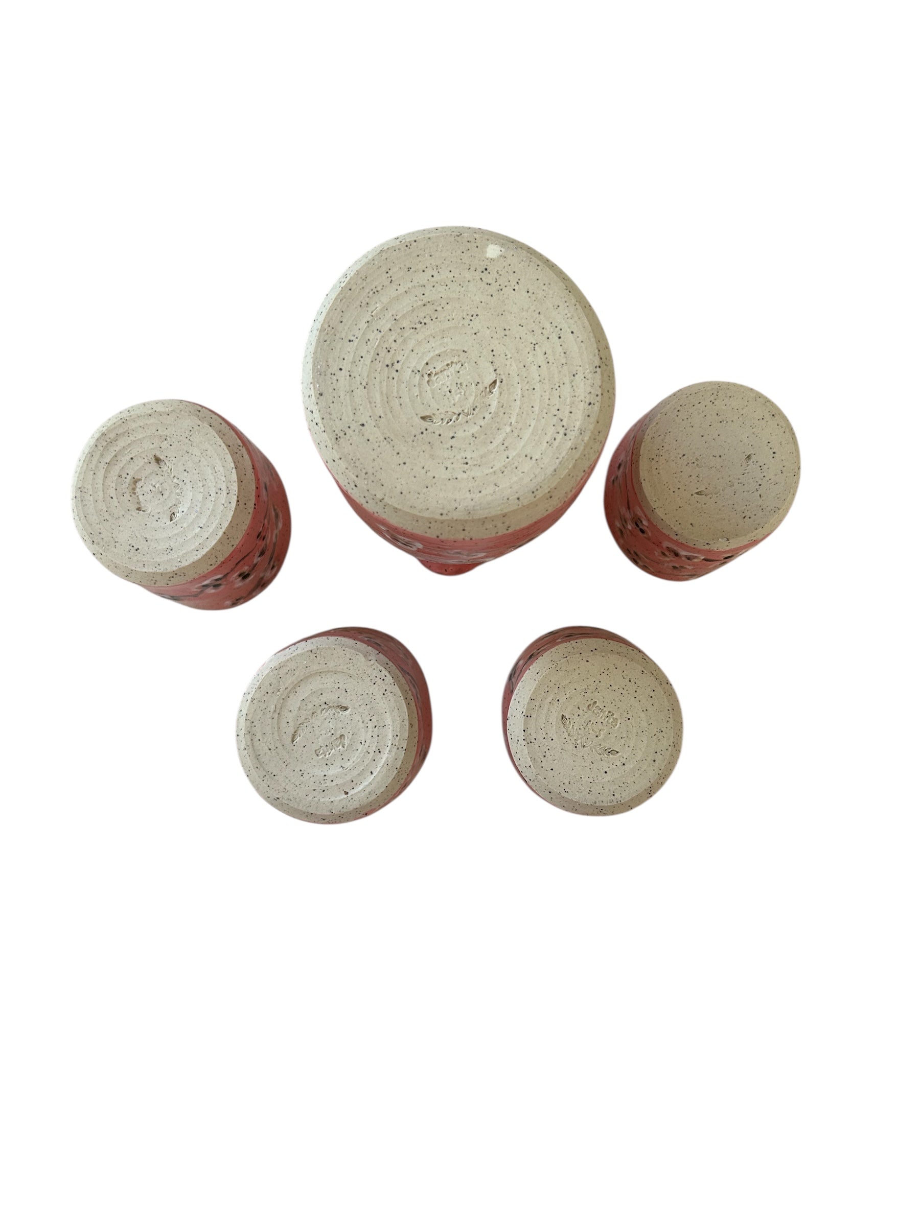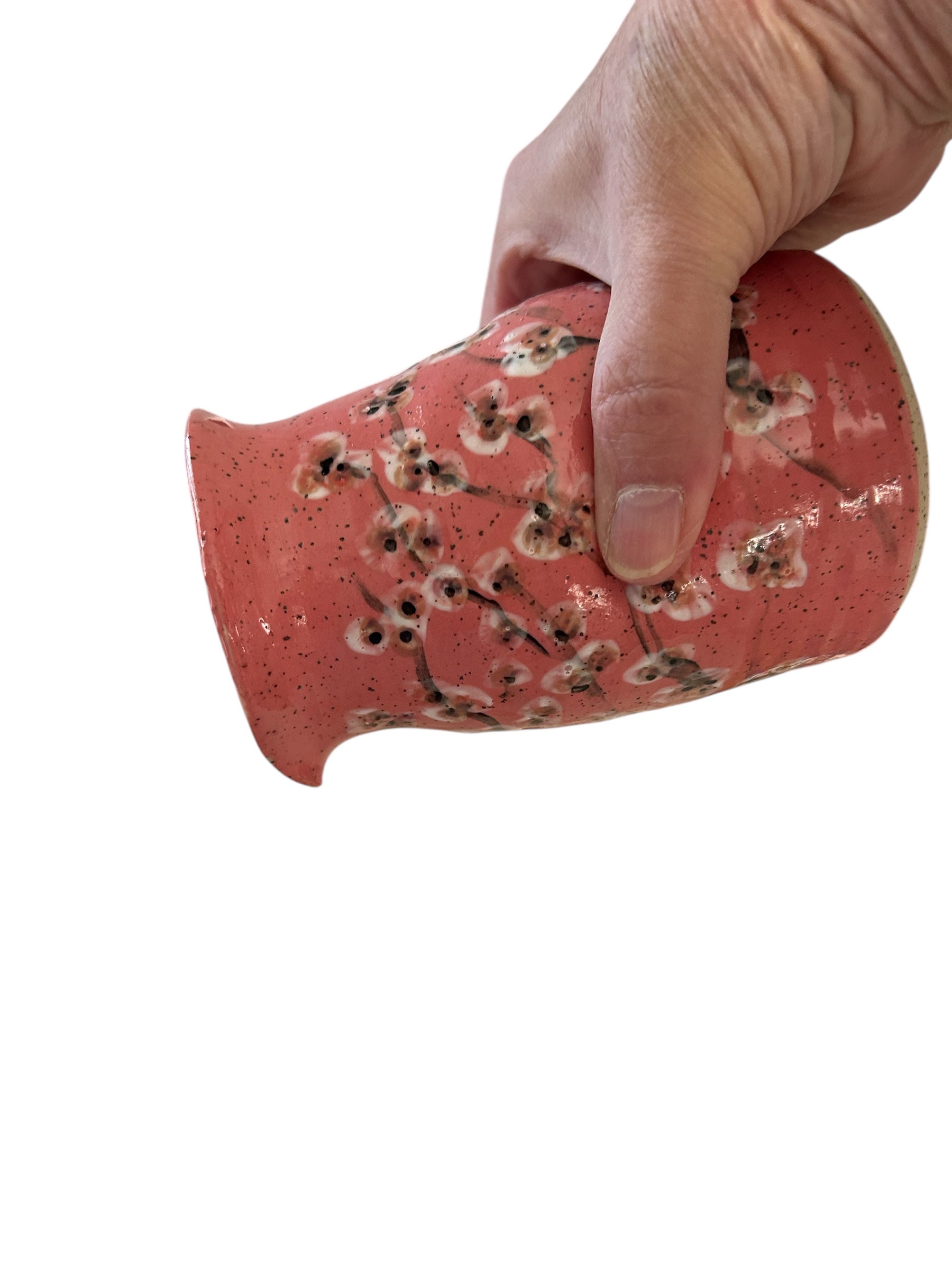Complete 5-piece sake set, including a sake bottle with spout and 4 sake cups. Each each is handpainted with cherry blossoms upon a bright pink glazed surface. Bottle and four cups have squeeze side handles for a firm grip. Food, dishwasher, and microwave safe.