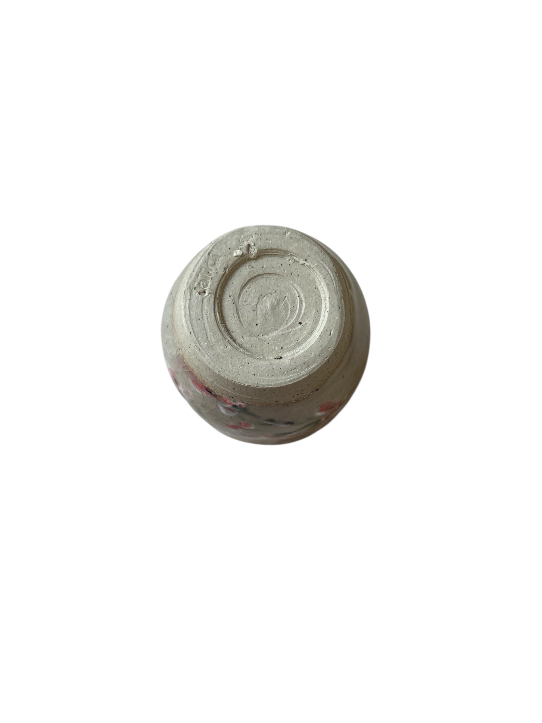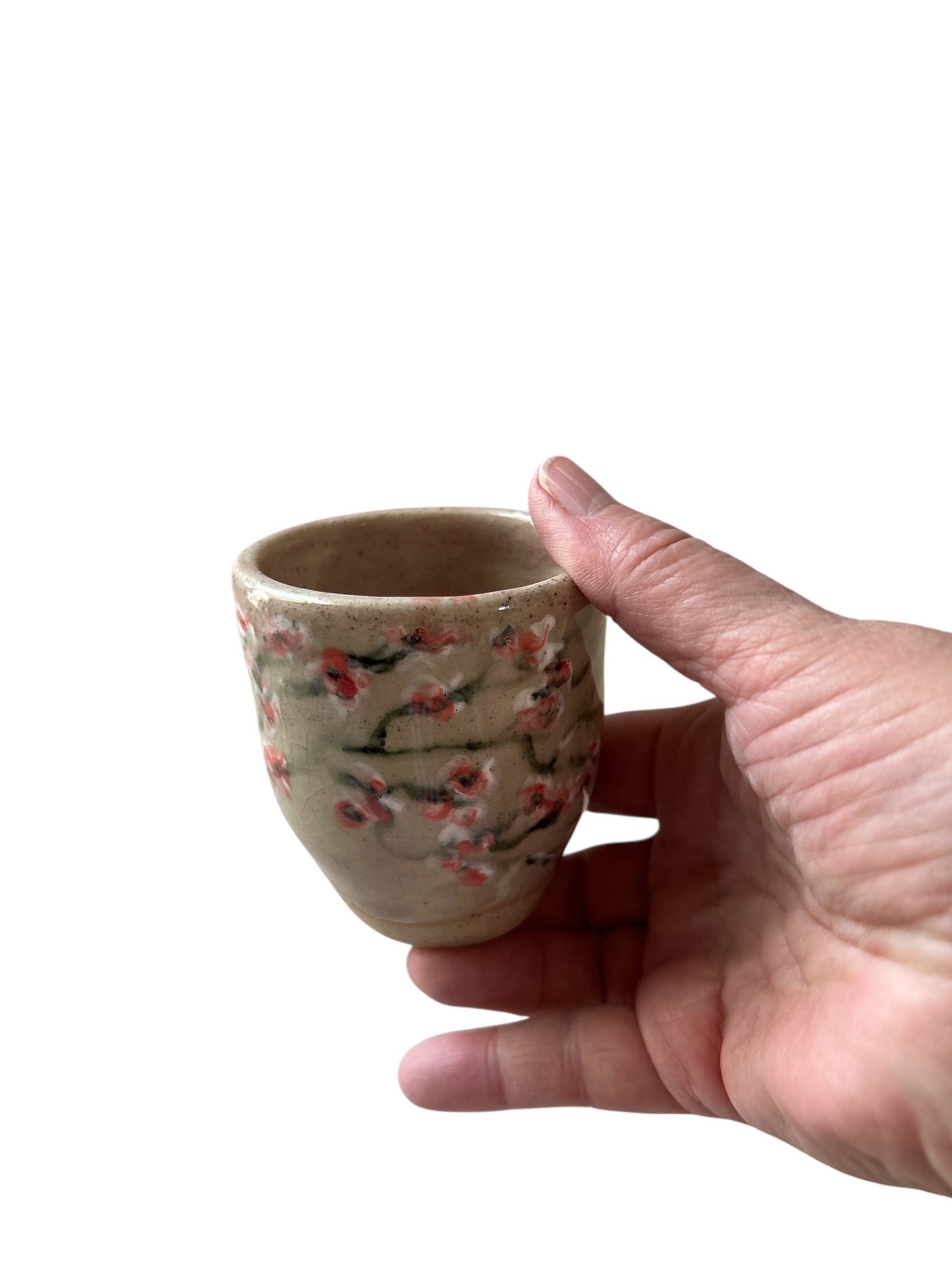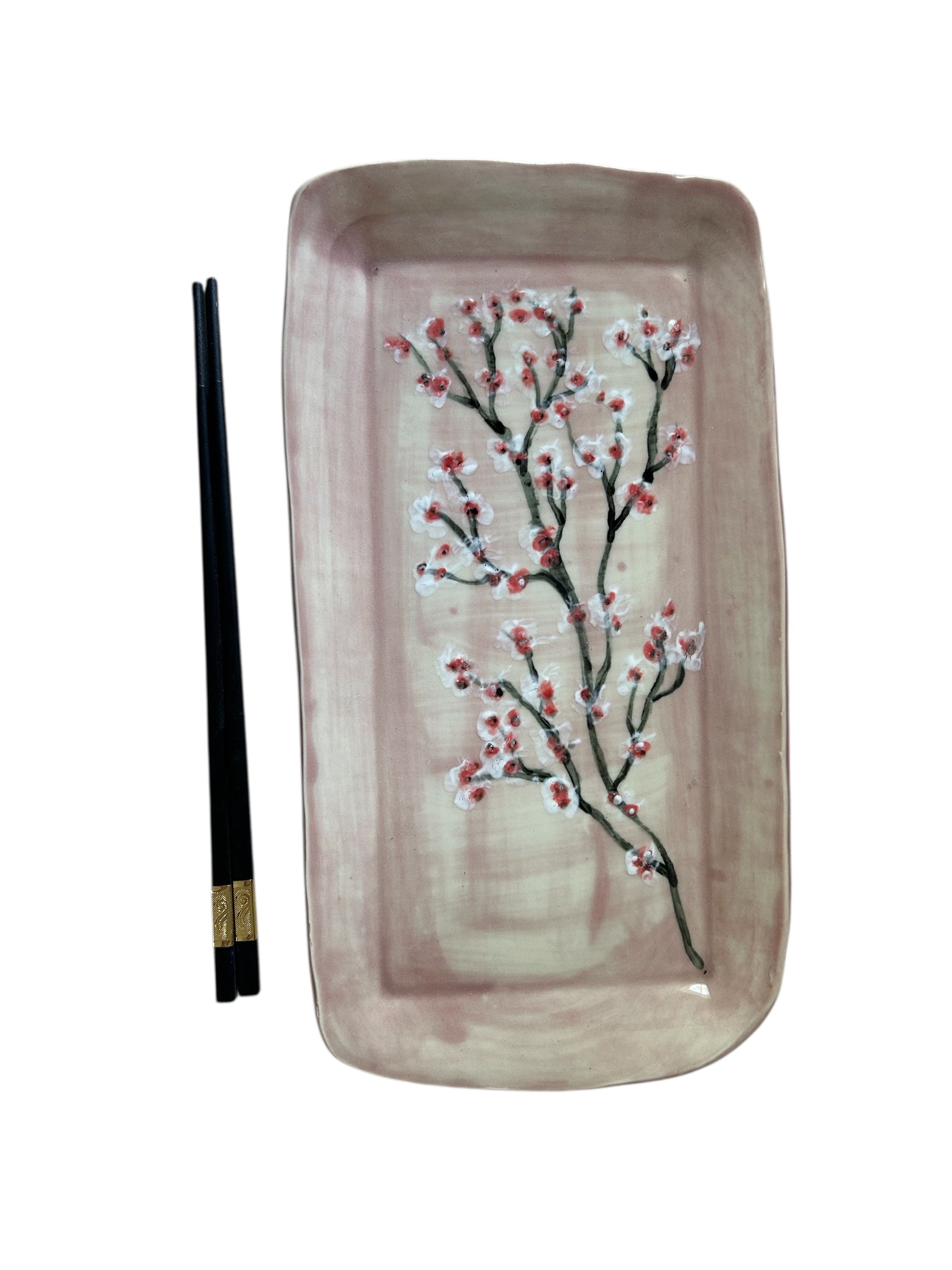 Complete Japanese-style dinnerware set with handpainted cherry blossoms, including sushi/sashimi plate, sauce cup, noodle/ramen bowl with built-in chopstick holder, sake cup, and beverage cup. Chopsticks are included.