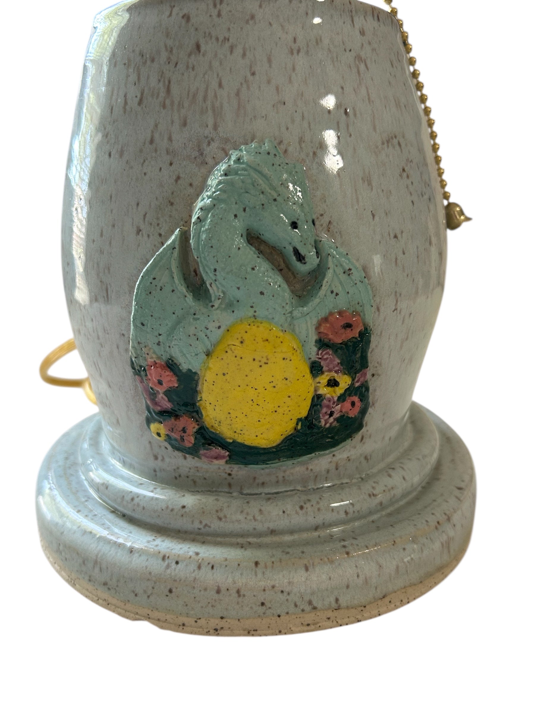 Lamp base is wheel-thrown and adorned with a sprigged and applique dragon holding a golden dragon egg. The lampshade was printed on my Prusa MK4 3D printer with iridescent multicolor filament, and its exterior is bumpy, much like the texture of the dragon egg on the applique. Lamp has a pull-string switch. All hardware is made of polished brass in a golden finish. 80-inch lamp cord allows for extended reach to nearest outlet.