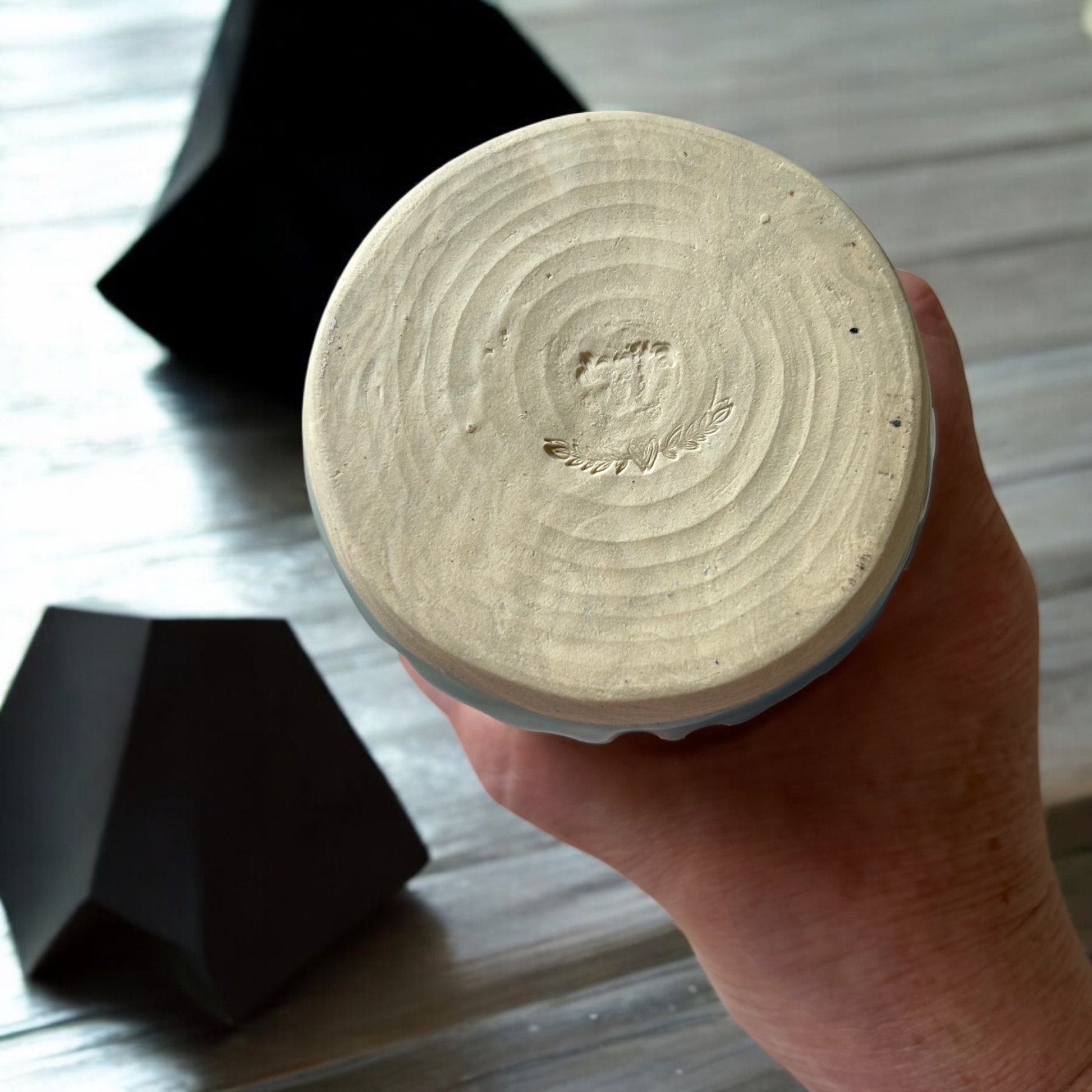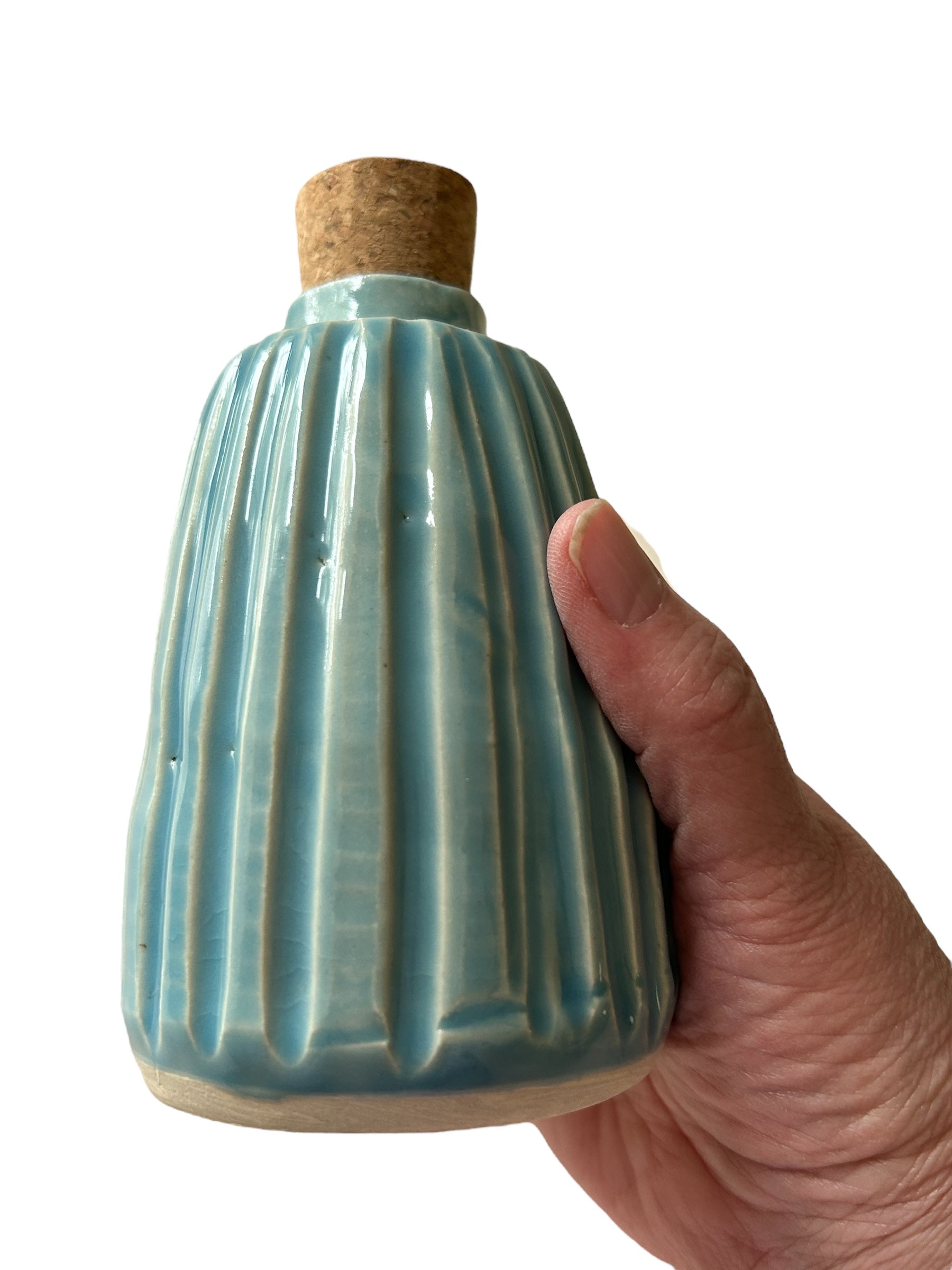 Medium-size wheel-thrown bottle with carved flutes down the sides. Topped with natural cork. Glazed with food-safe glaze in translucent blue lagoon celadon. Bottle can be used for holding any liquid, as it is food safe and water tight. I use mine to store maple syrup. It can be put in the microwave (with cork removed) to warm up the contents. Fluting makes gripping more secure, so there is no need for a handle. It can also be used as a small vase.
