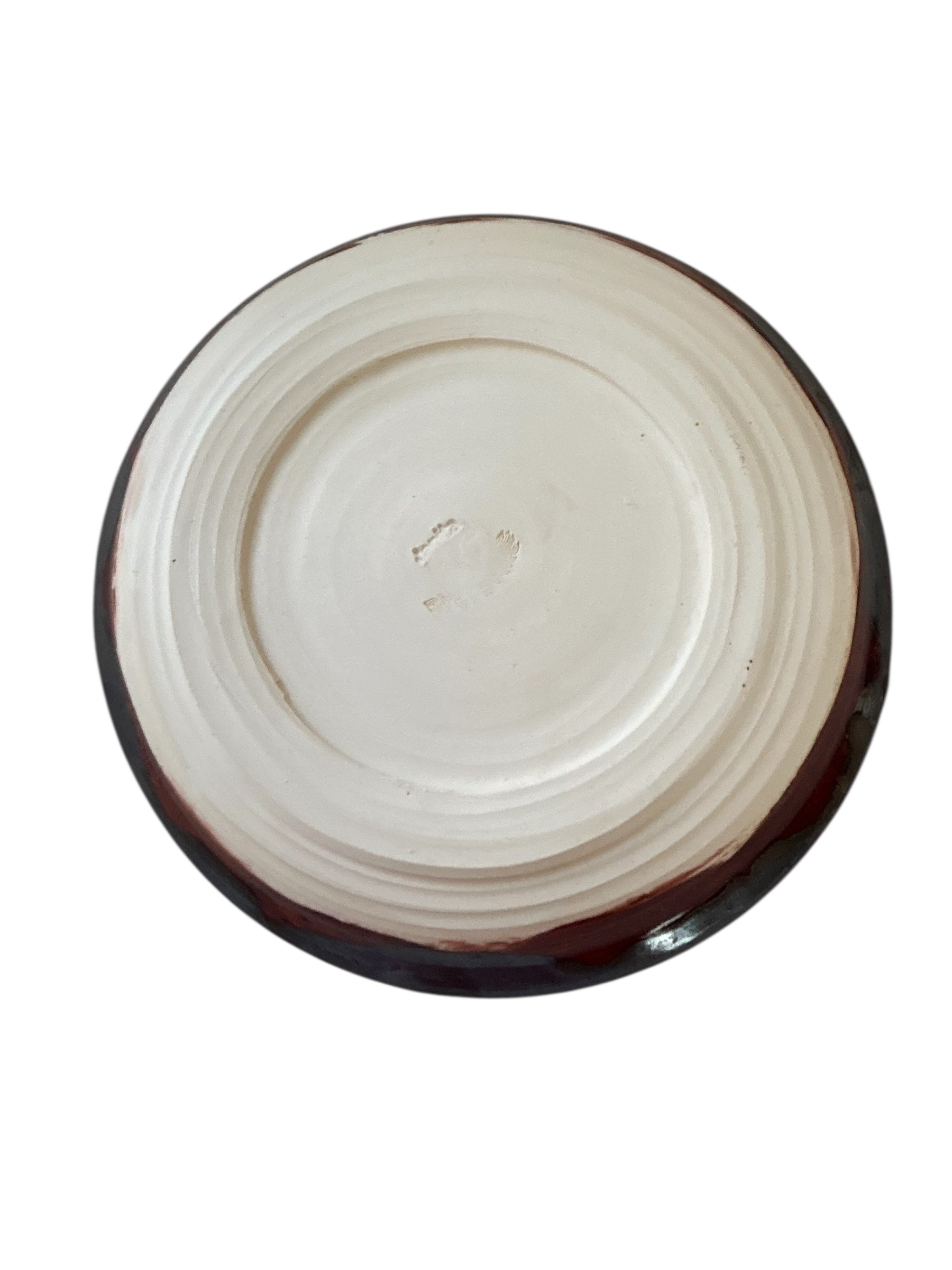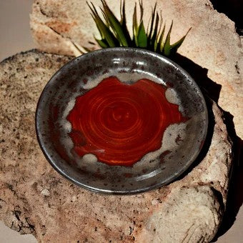 General-purpose side plate in fiery red with saturation gold glaze dripping from rim. Shaping method is wheel-thrown. Plate is footed. Can also be used as a dessert plate.
