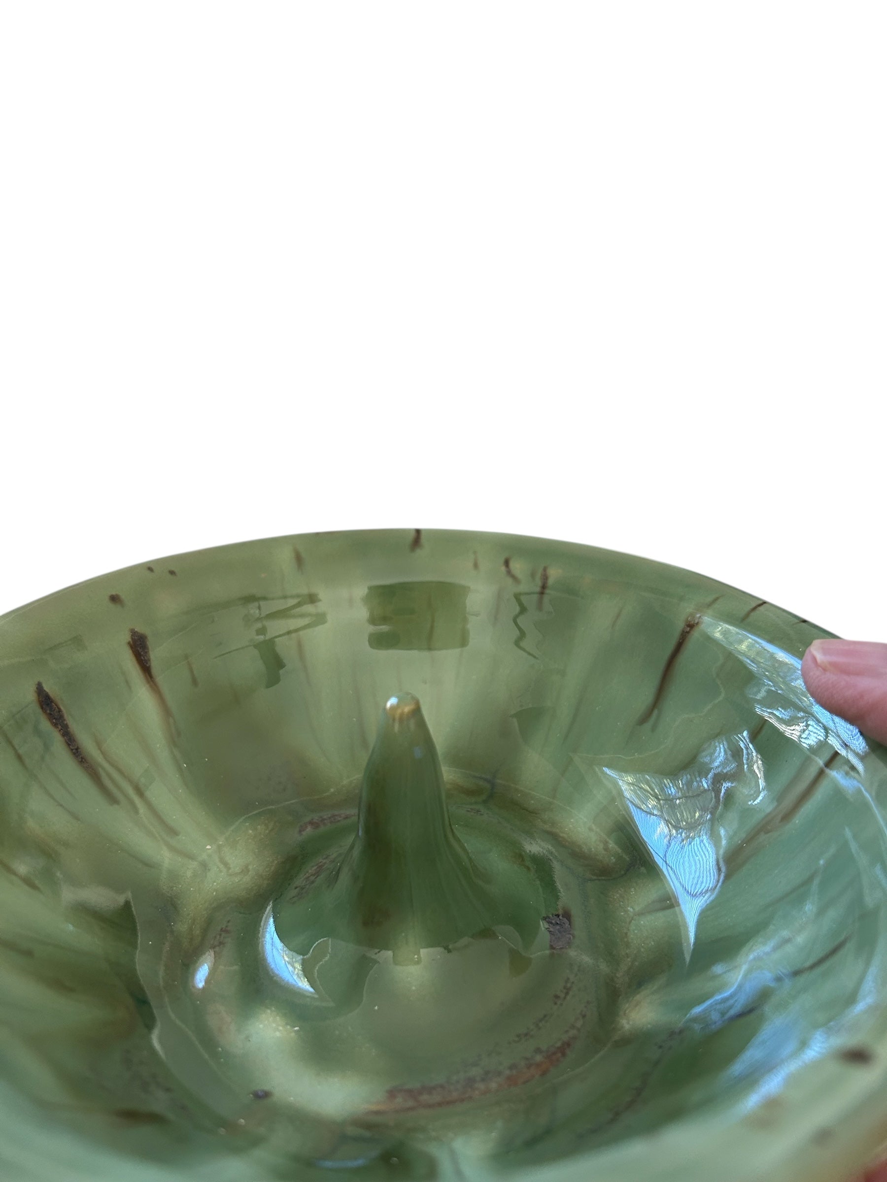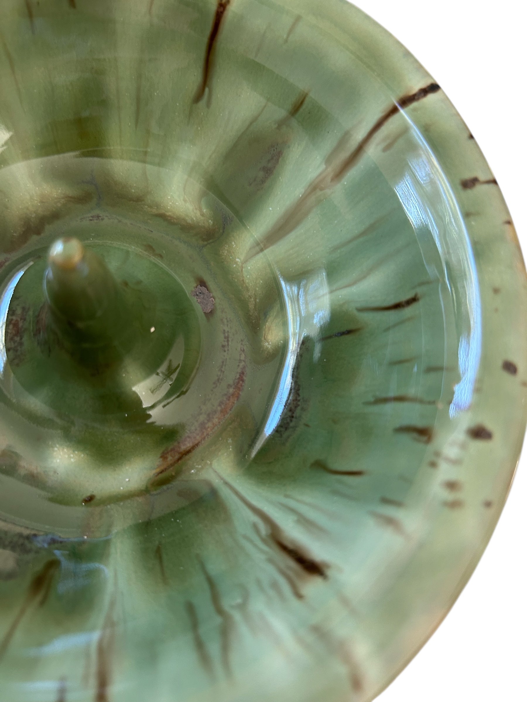German apple baker in Aspen green. Wheel-thrown construction. Cone in the center helps the apple cook from the inside out. Great for a quick dessert made from ingredients you already have on hand. Food, dishwasher, and microwave safe. Oven safe up to 400 deg. F.