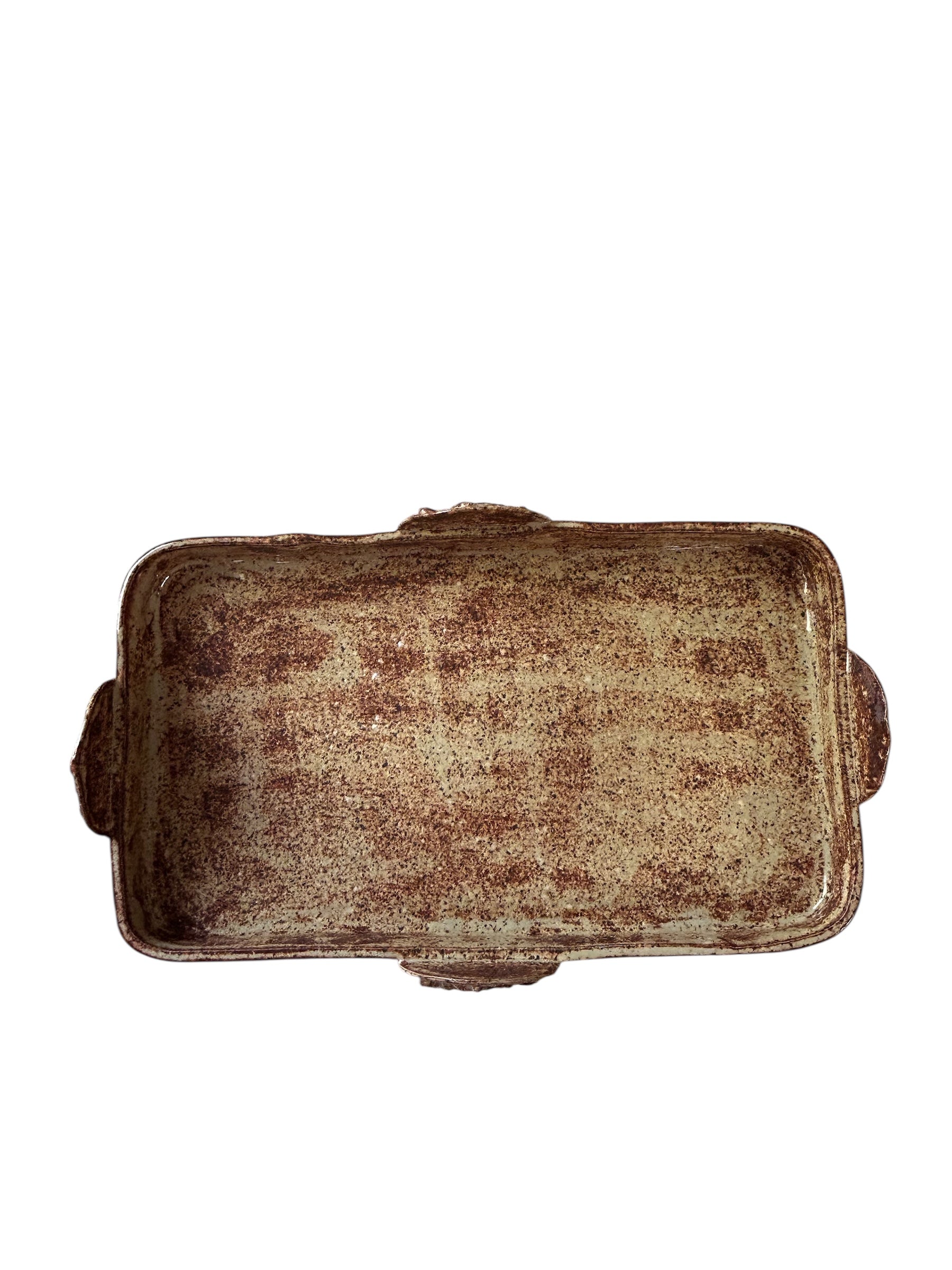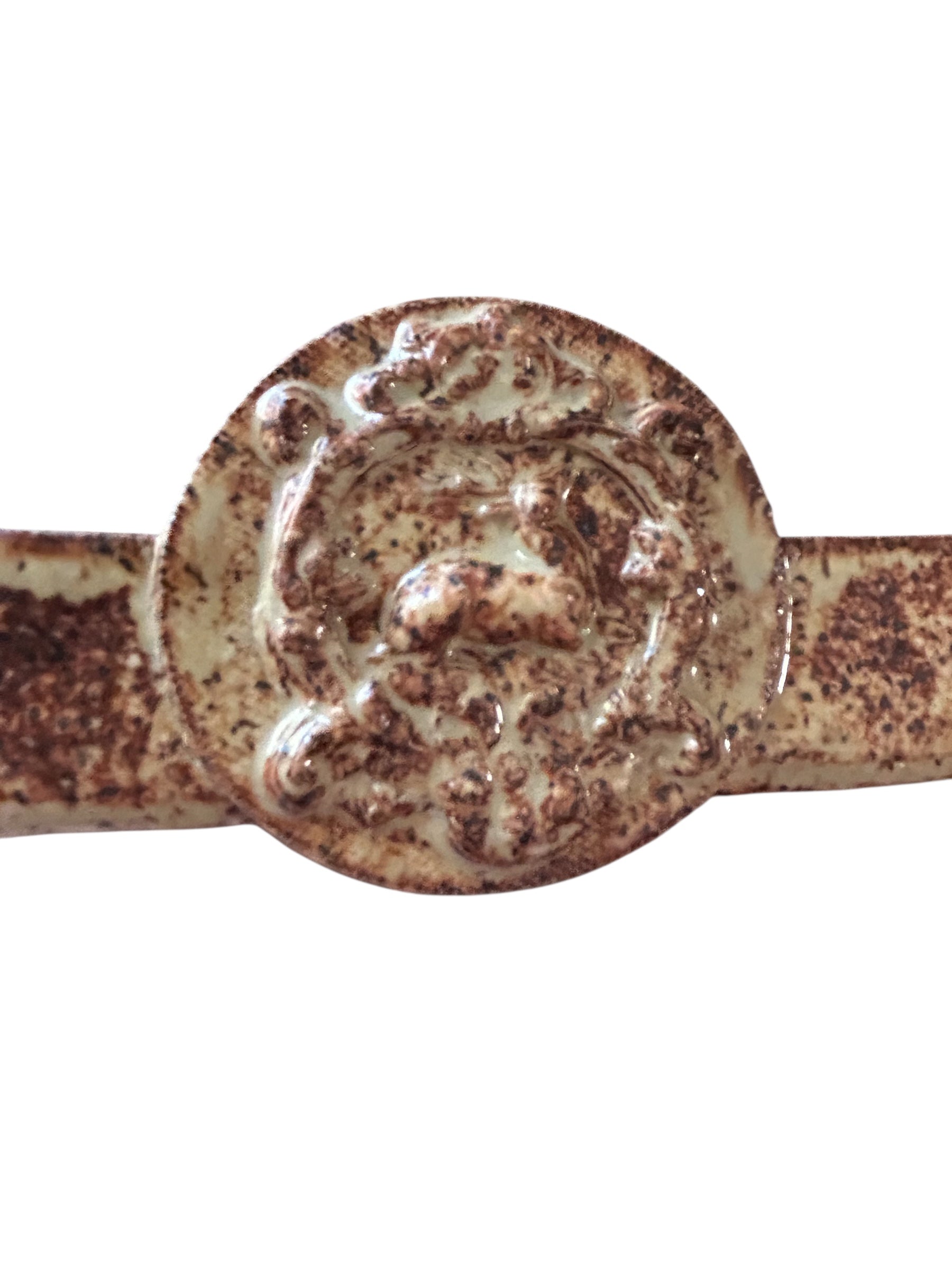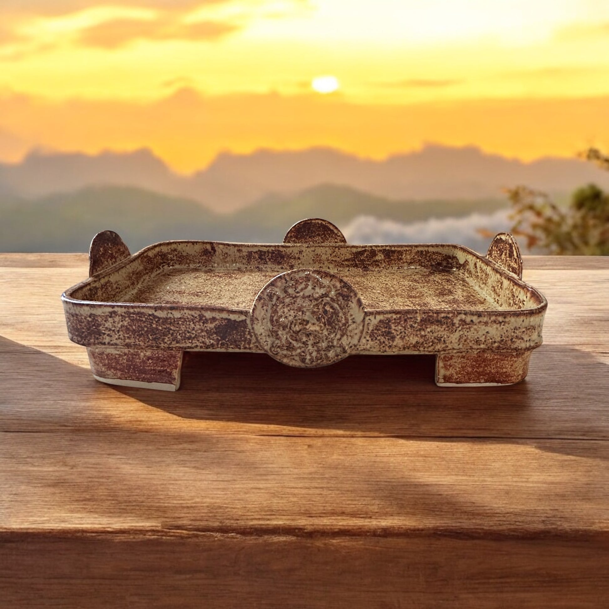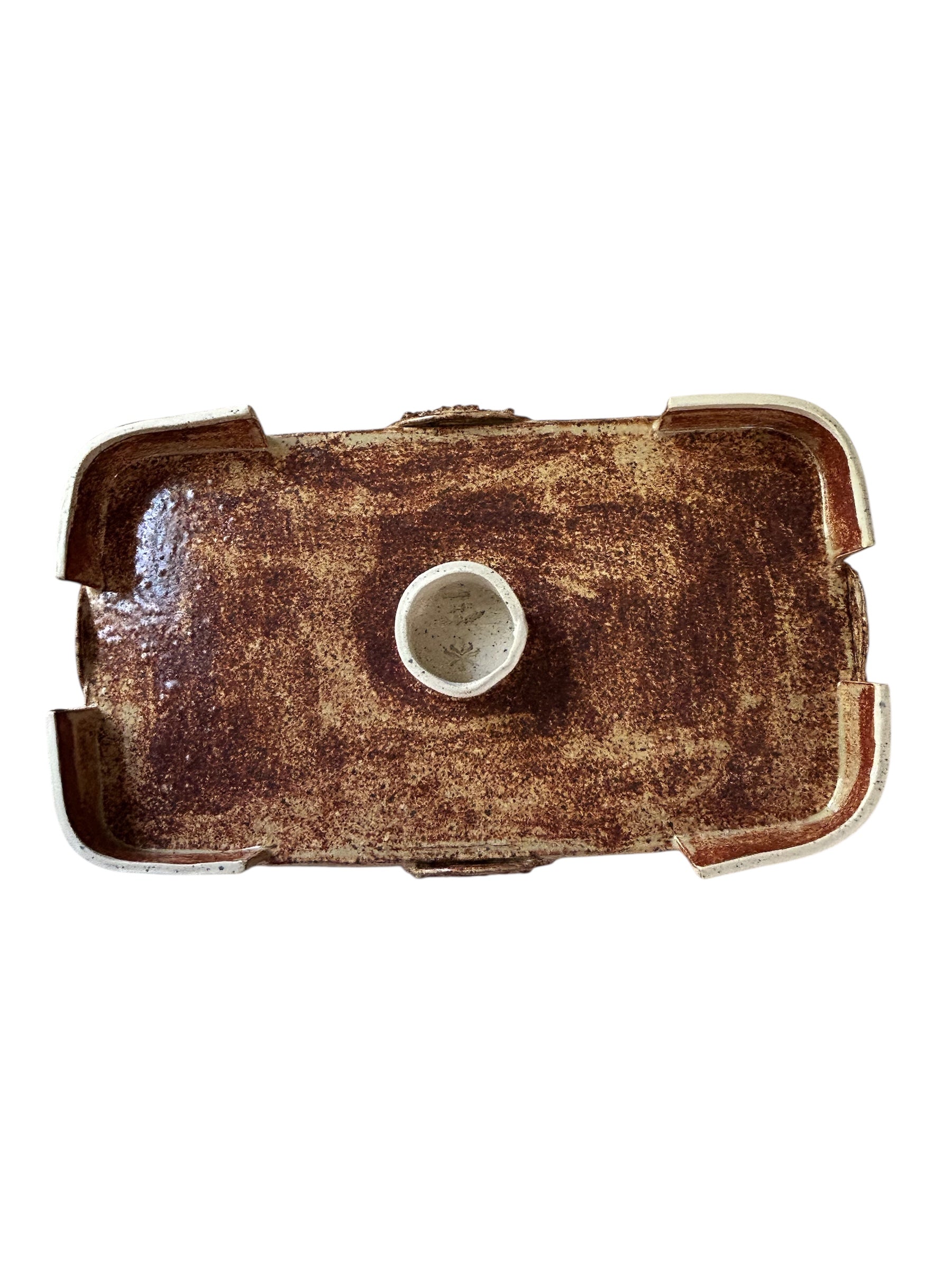 Handbuilt Cake or Cupcake Stand. Rectangular shape. Can hold a 10" x 8" sheet cake or a dozen cupcakes. Each side has a round medallion with a carved deer in relief. Covered with an Albany slip brown glaze (my favorite glaze). Food and dishwasher safe.