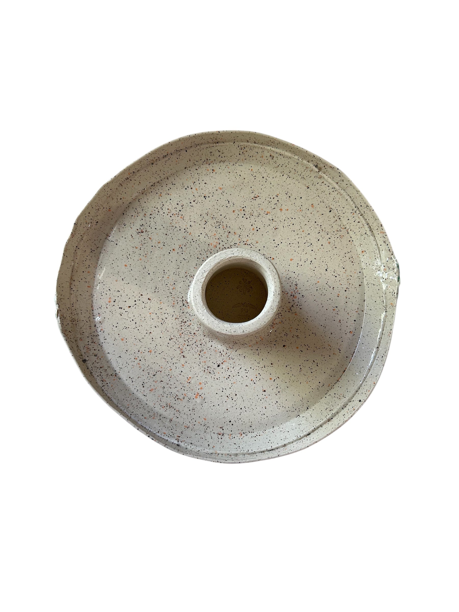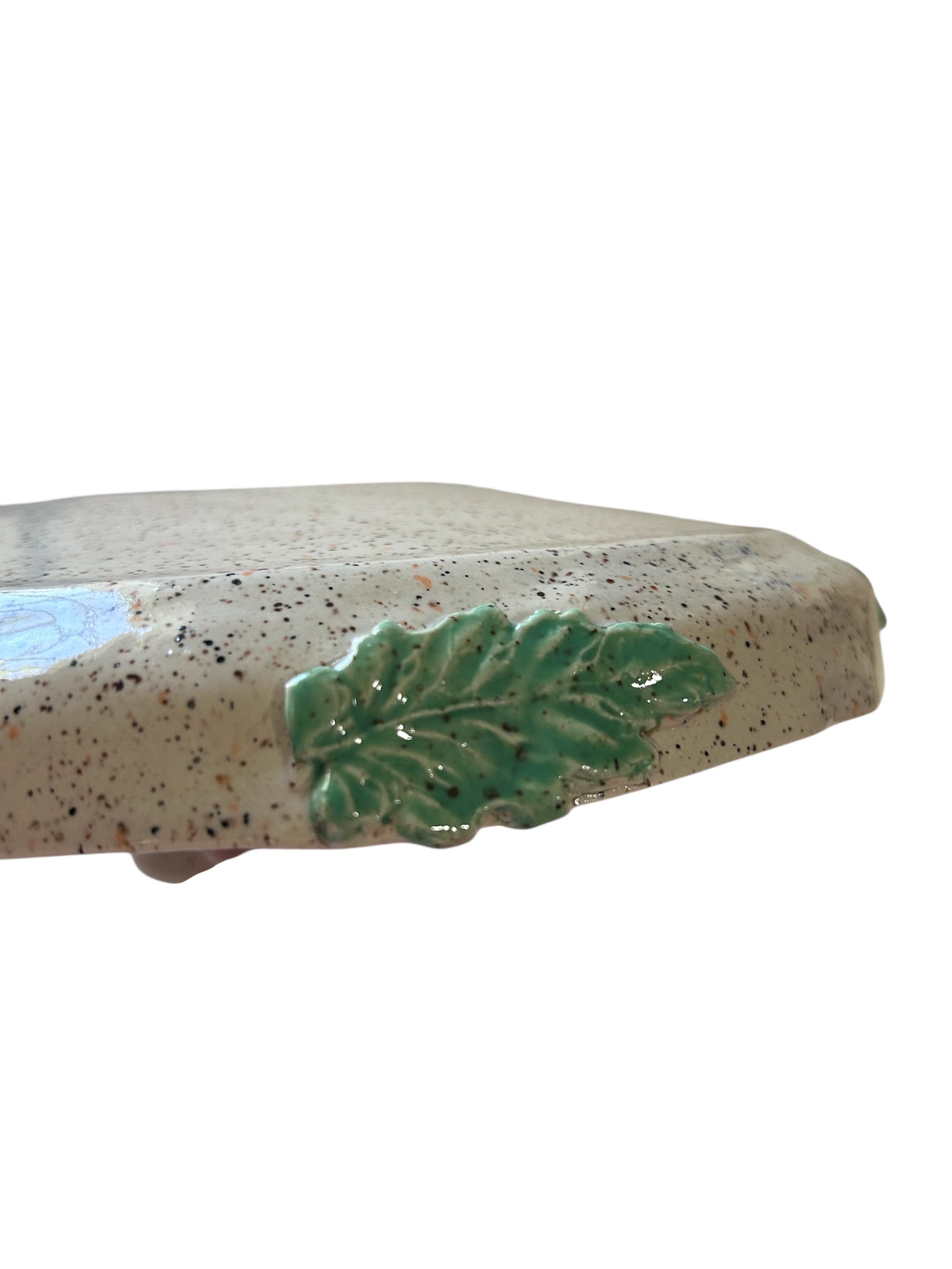 Handbuilt cake stand with sprigged leaves set upon a speckled white glaze. Leaves are handpainted. Easily holds up to a 10-inch cake fully decorated. All glazes are food and dishwasher safe. Perfect for the upcoming baking season.