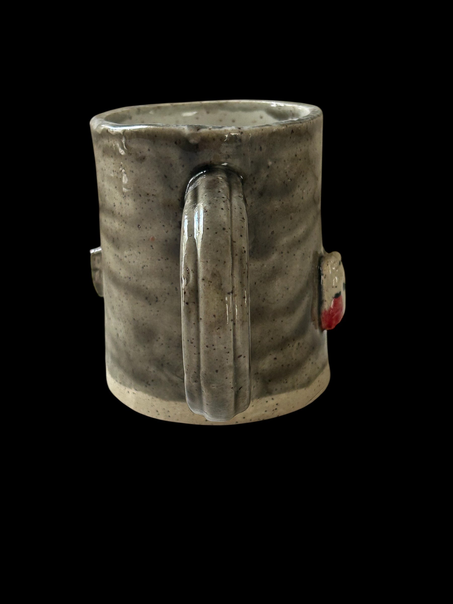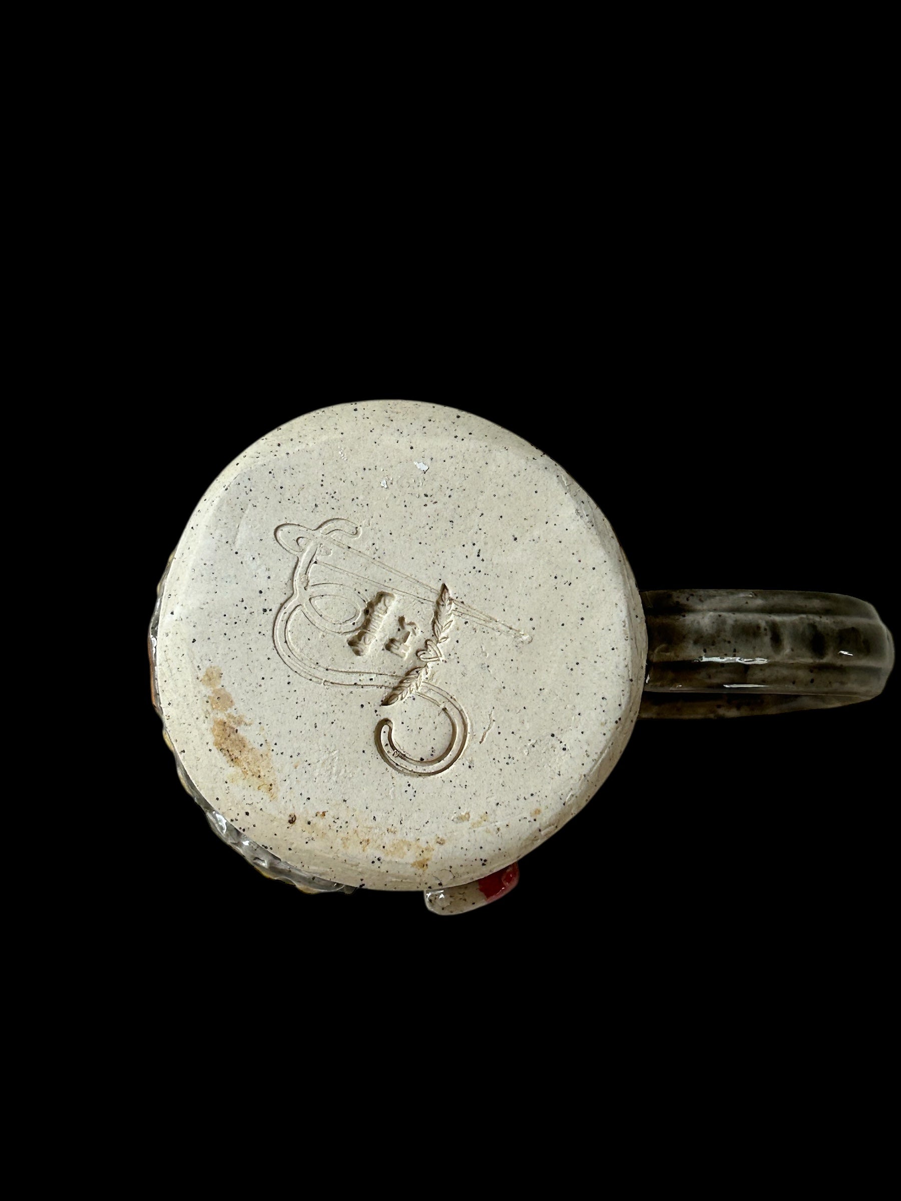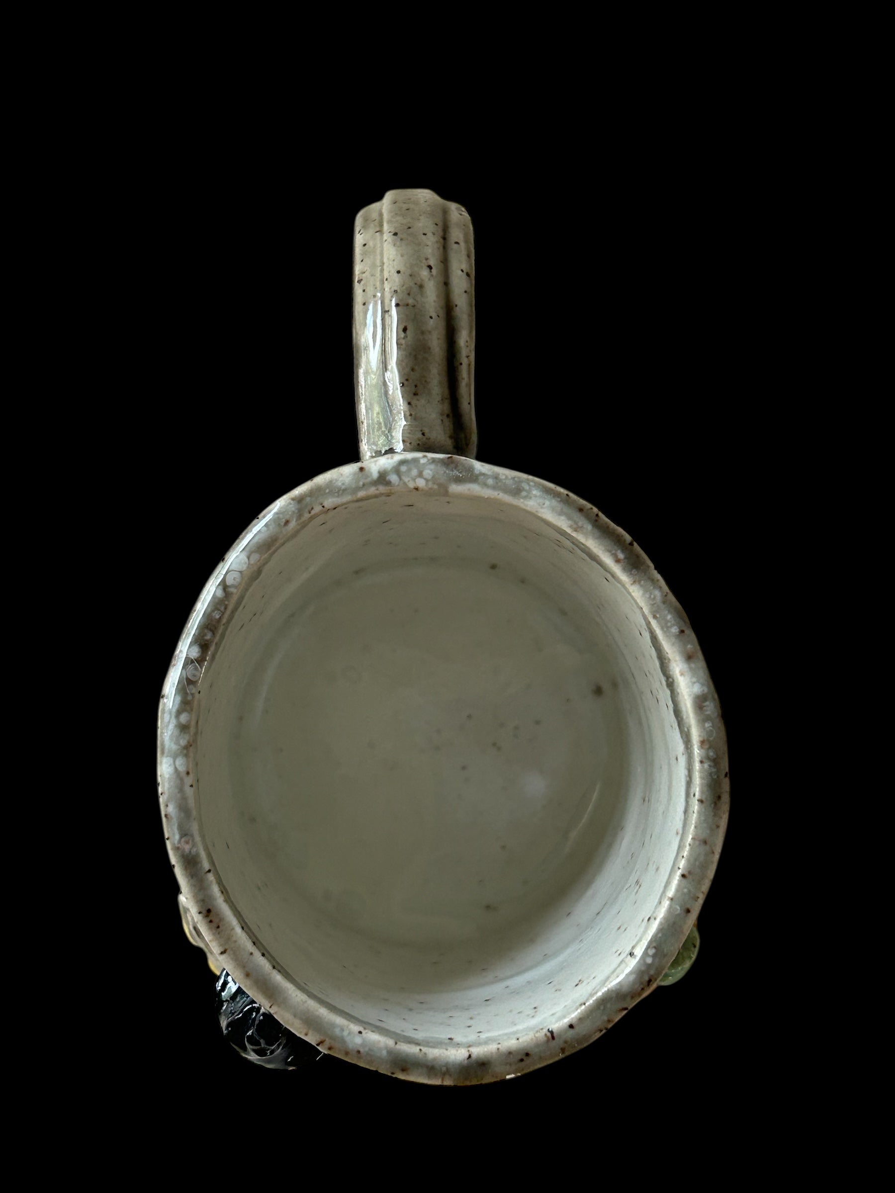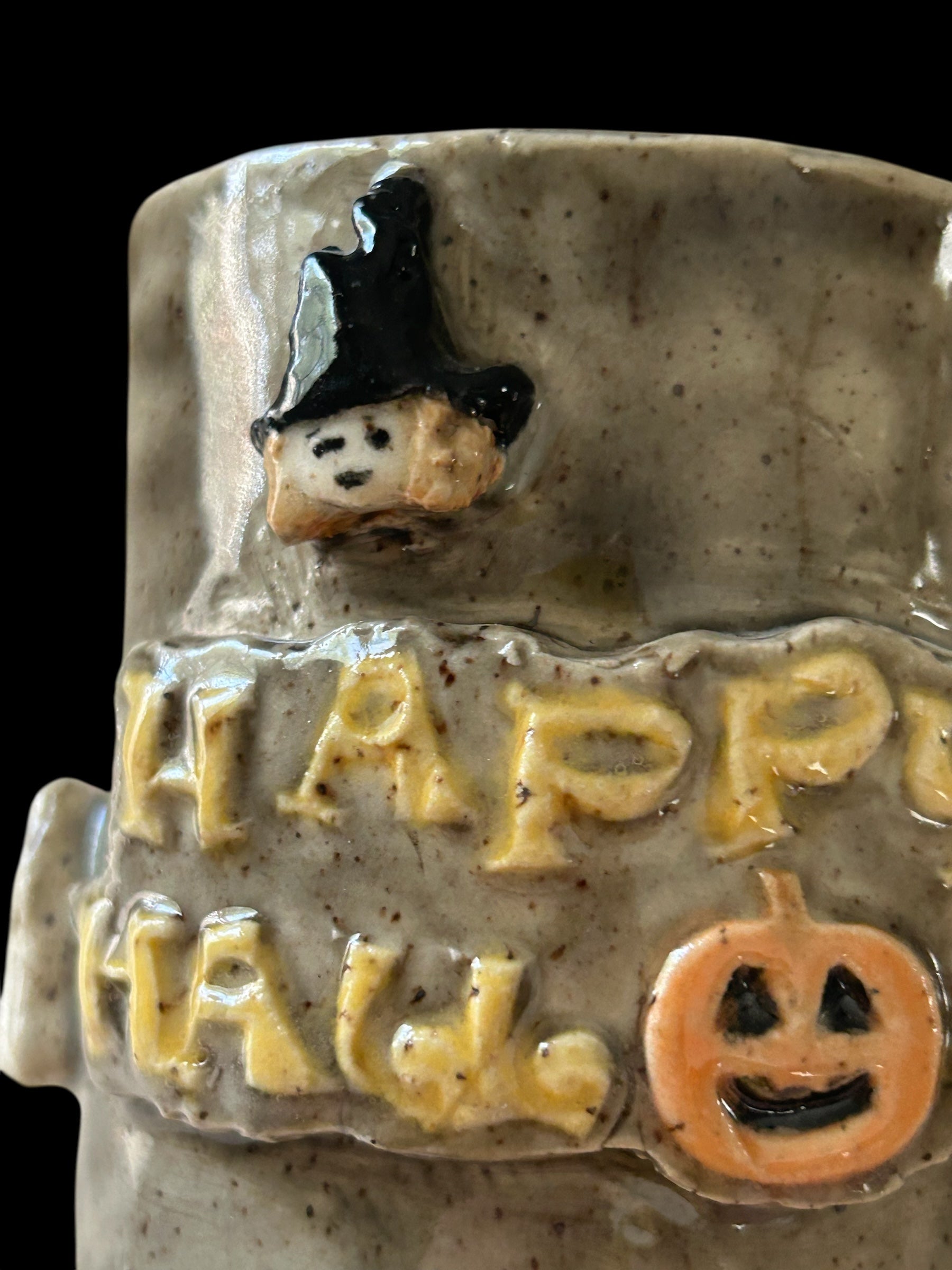 Spooky Halloween mug with sculpted witch, ghost, and jack-o'-lantern and a "Happy Halloween" message, set upon speckled stoneware clay. Handpainted designs covered in a translucent glaze. Food and dishwasher safe. Holds approximately 10 ounces of liquid.