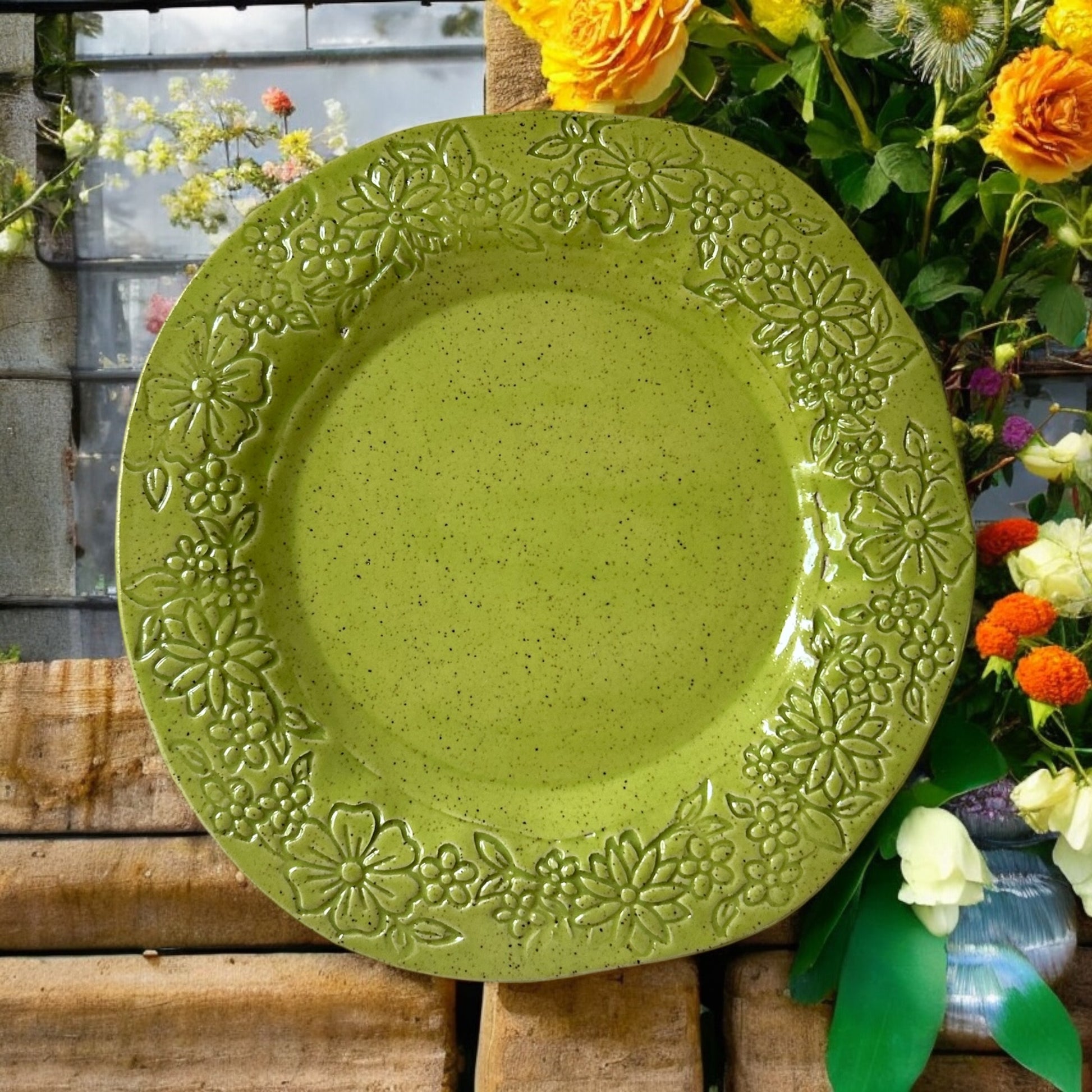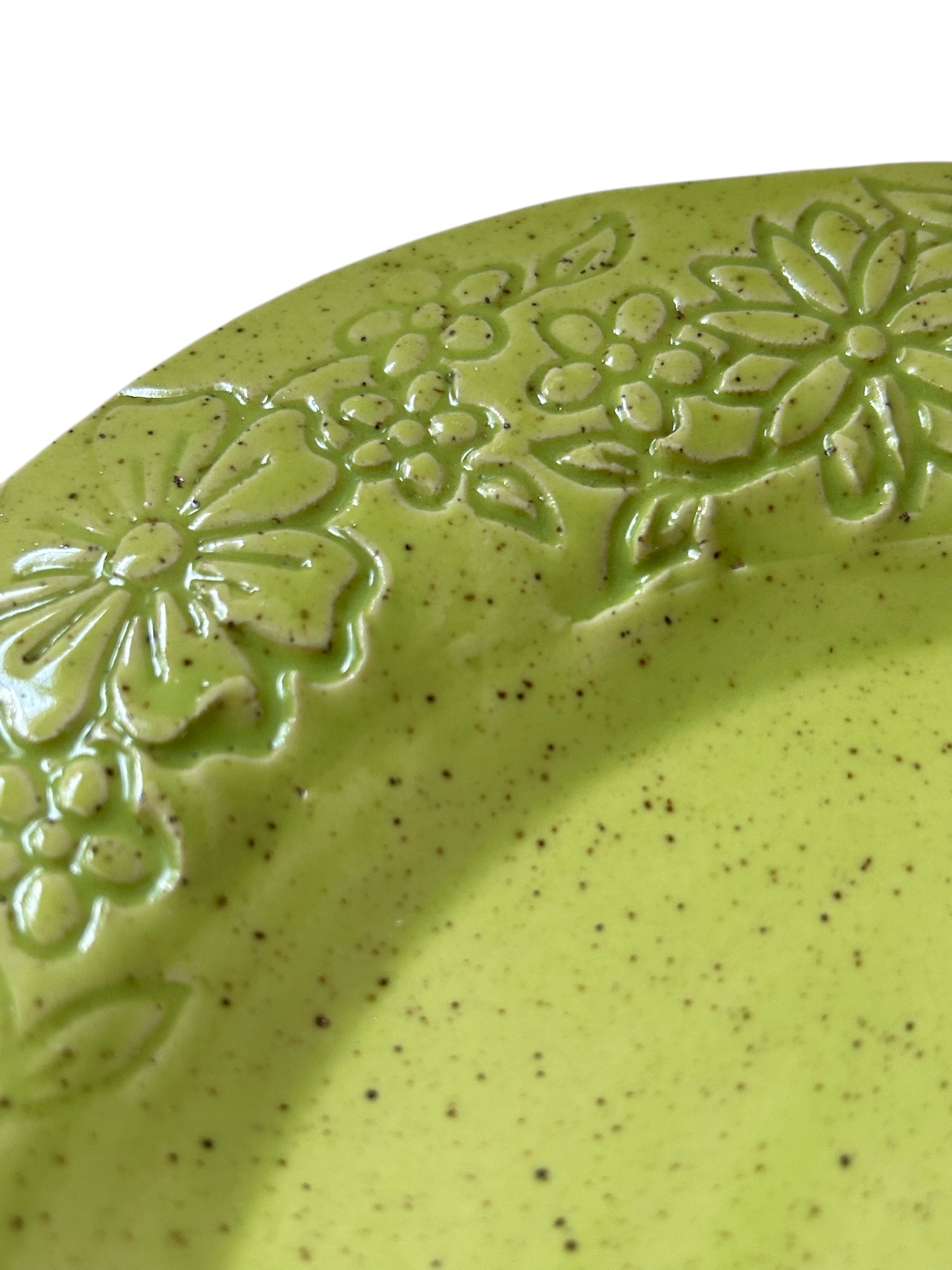 Medium Handbuilt Slab Textured Treat Tray #13 with Floral Designs in Pear Green