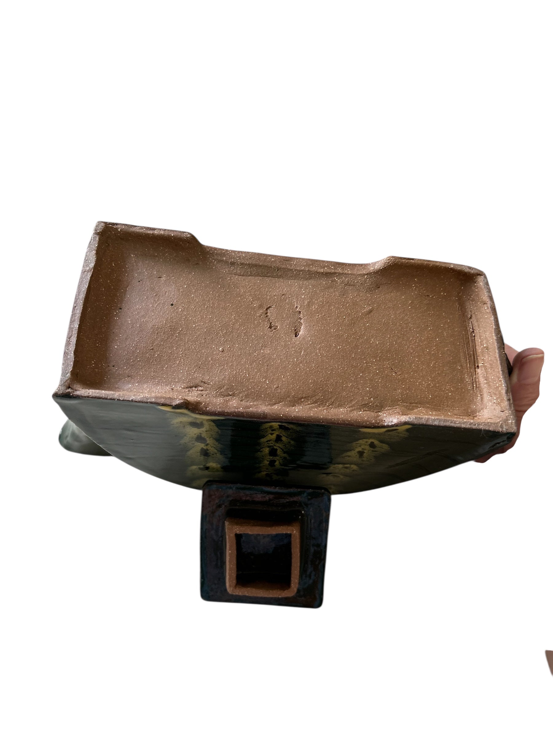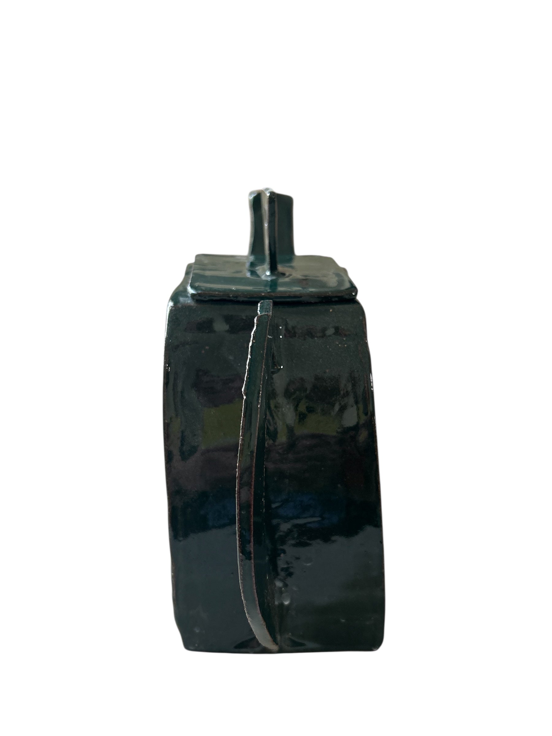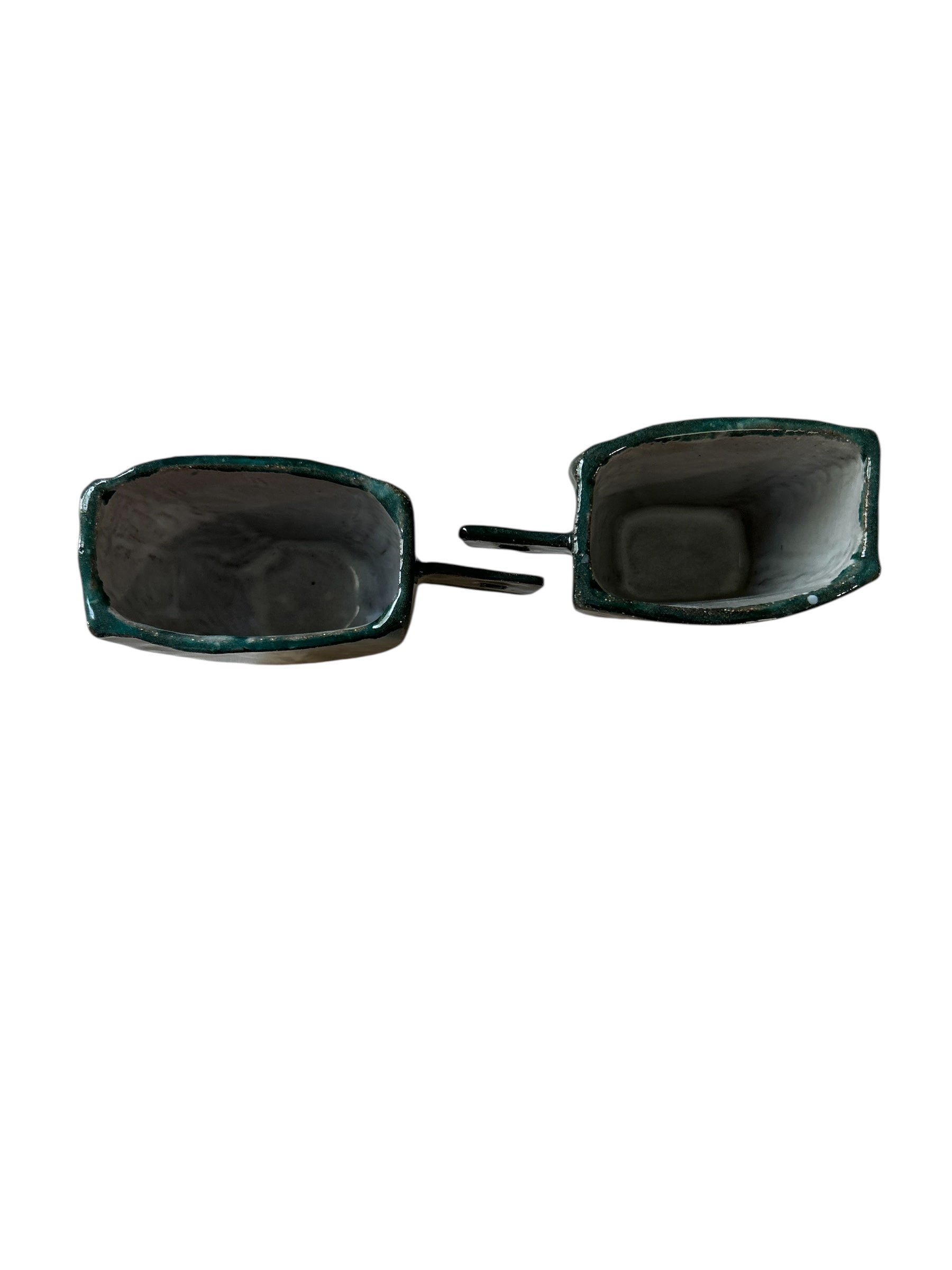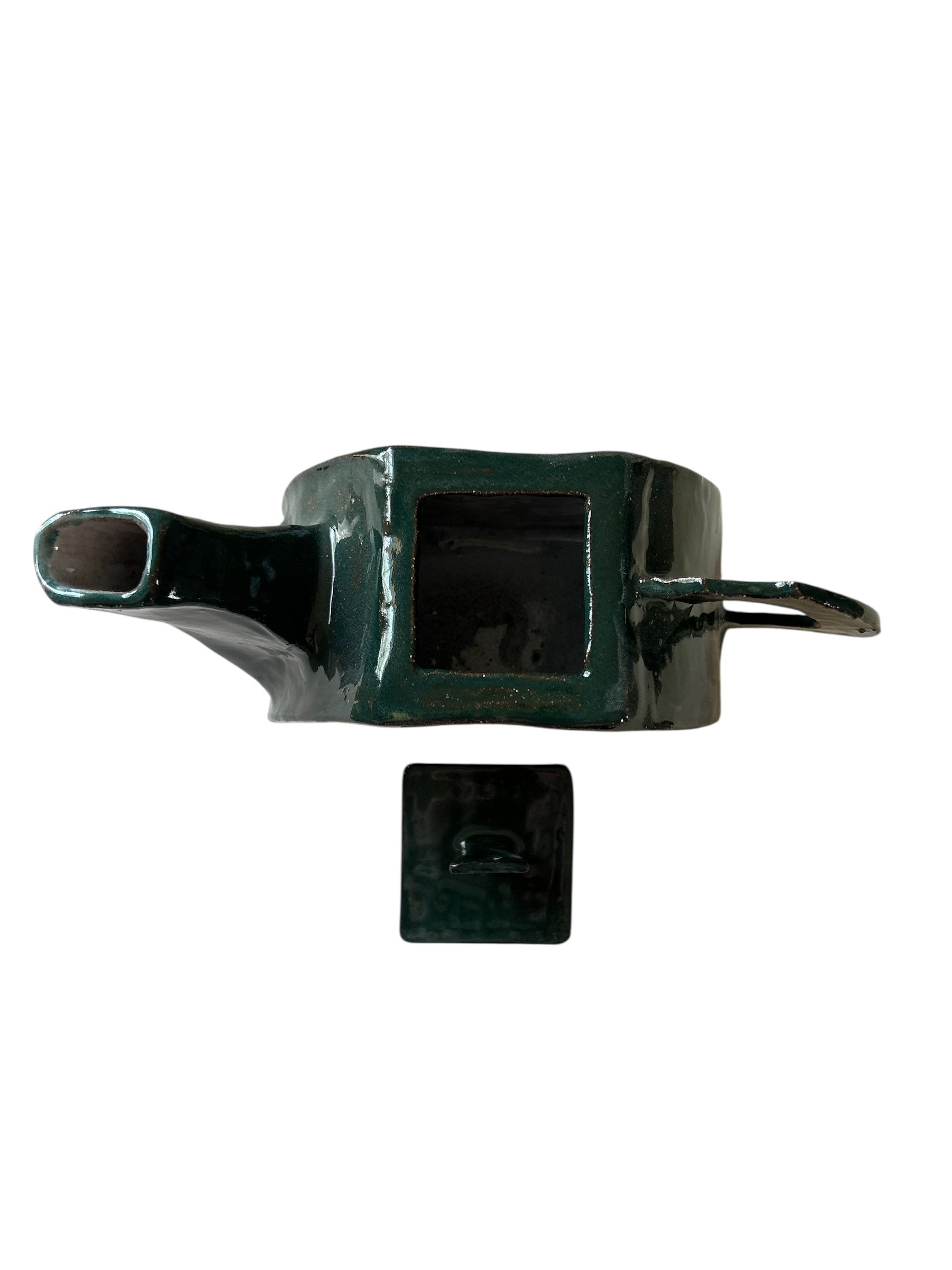 Tea set including teapot and two squared tea mugs. Handpainted with stylized peacock feathers and covered with teal green glaze on exterior and white linter glaze inside. Shaping method is handbuilding from a large slab of dark stoneware clay.