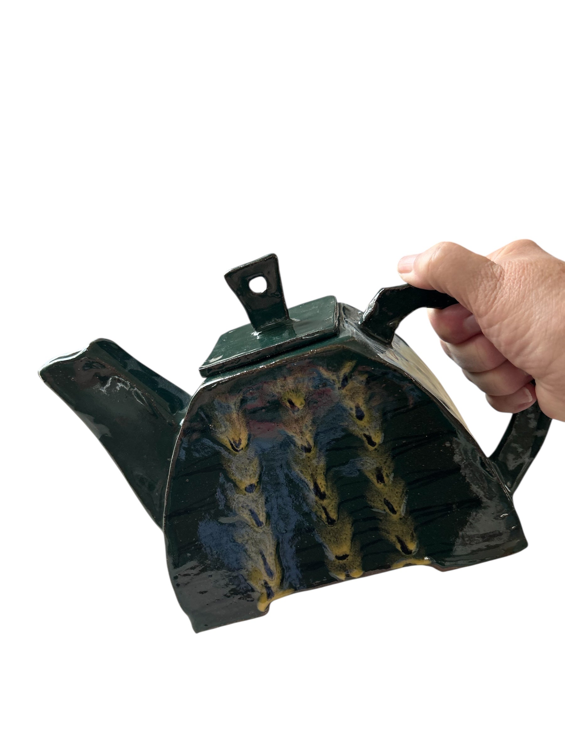 Handbuilt Teapot and Squared Tea Mugs Set #60 with Handpainted Peacock Feathers in Teal Green