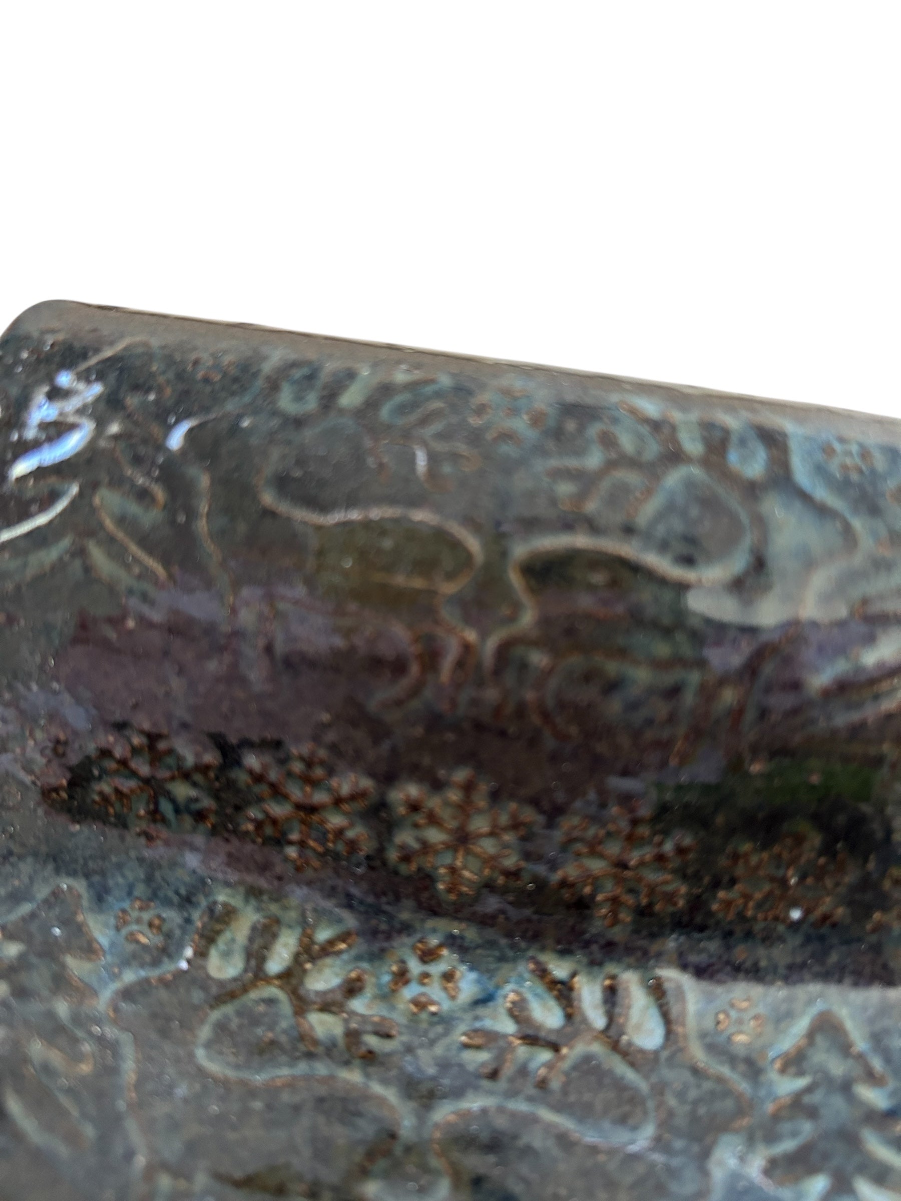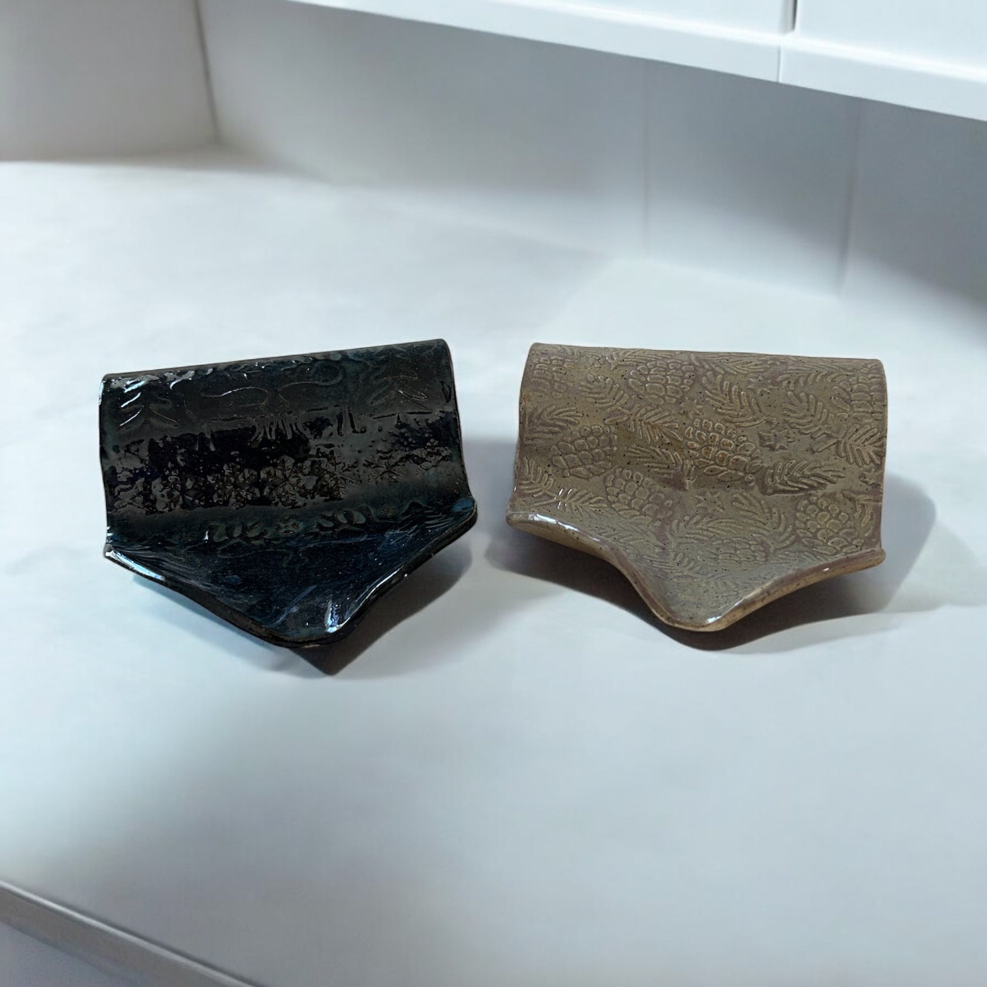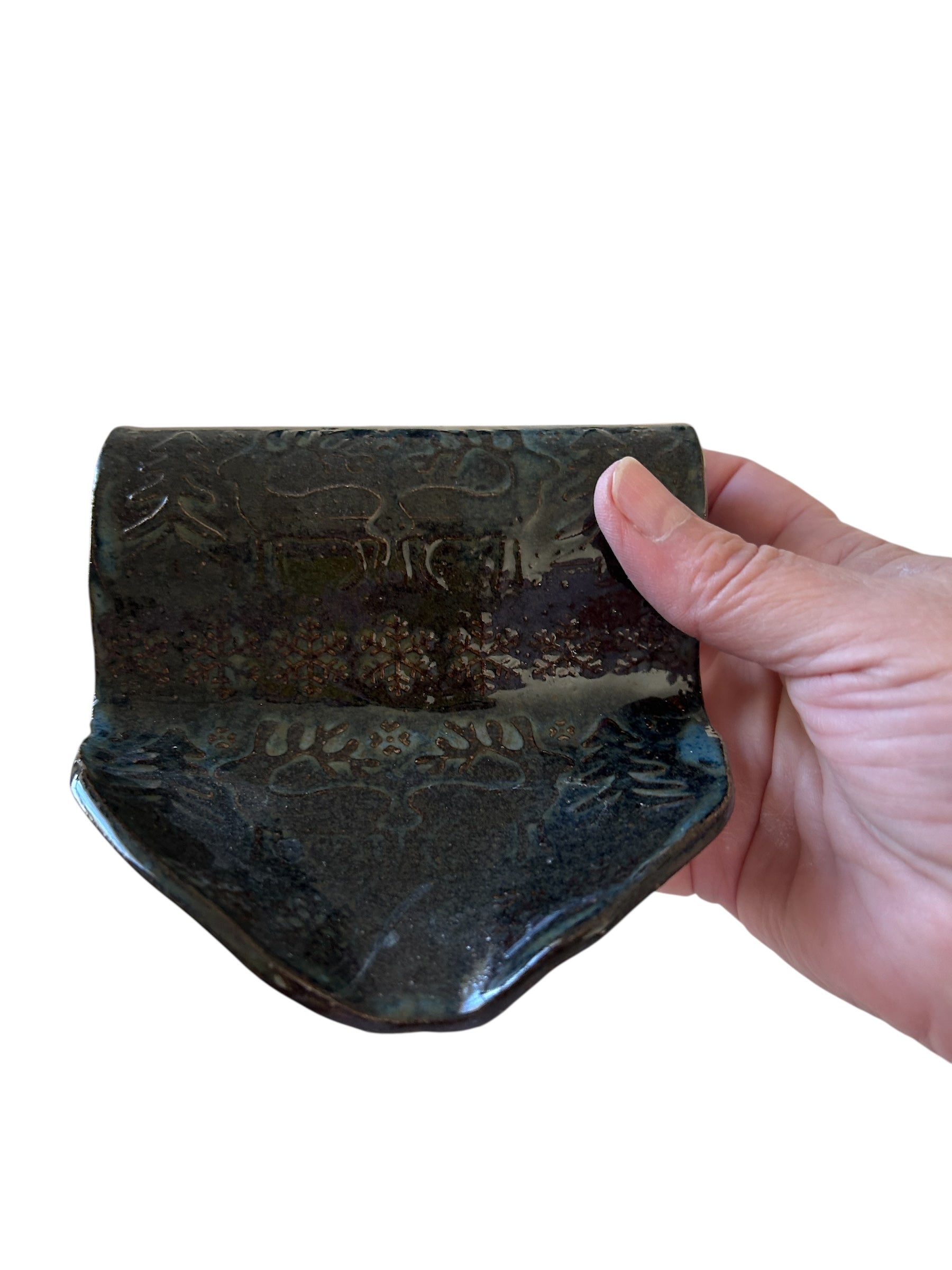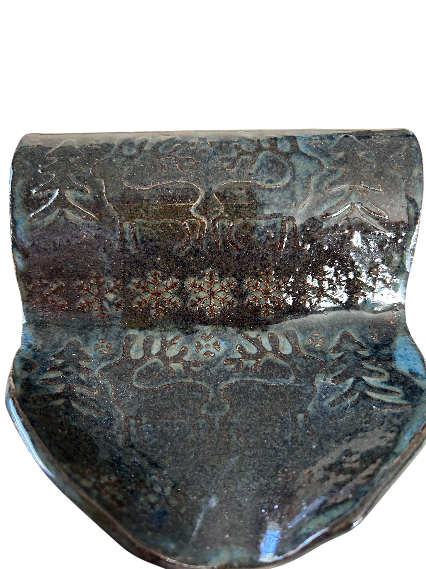 Textured sponge holders with your choice of evergreen and pinecones (in a toasted sage) or deer and winter trees (in storm blue) designs on a chocolate brown clay. This unique shape holds even your largest kitchen sponge or even a large decorative soap. Each of the sponge holders has a spout, which aids in draining after use, and only when you decide to drain it. Slab construction. Food, dishwasher, and microwave safe.