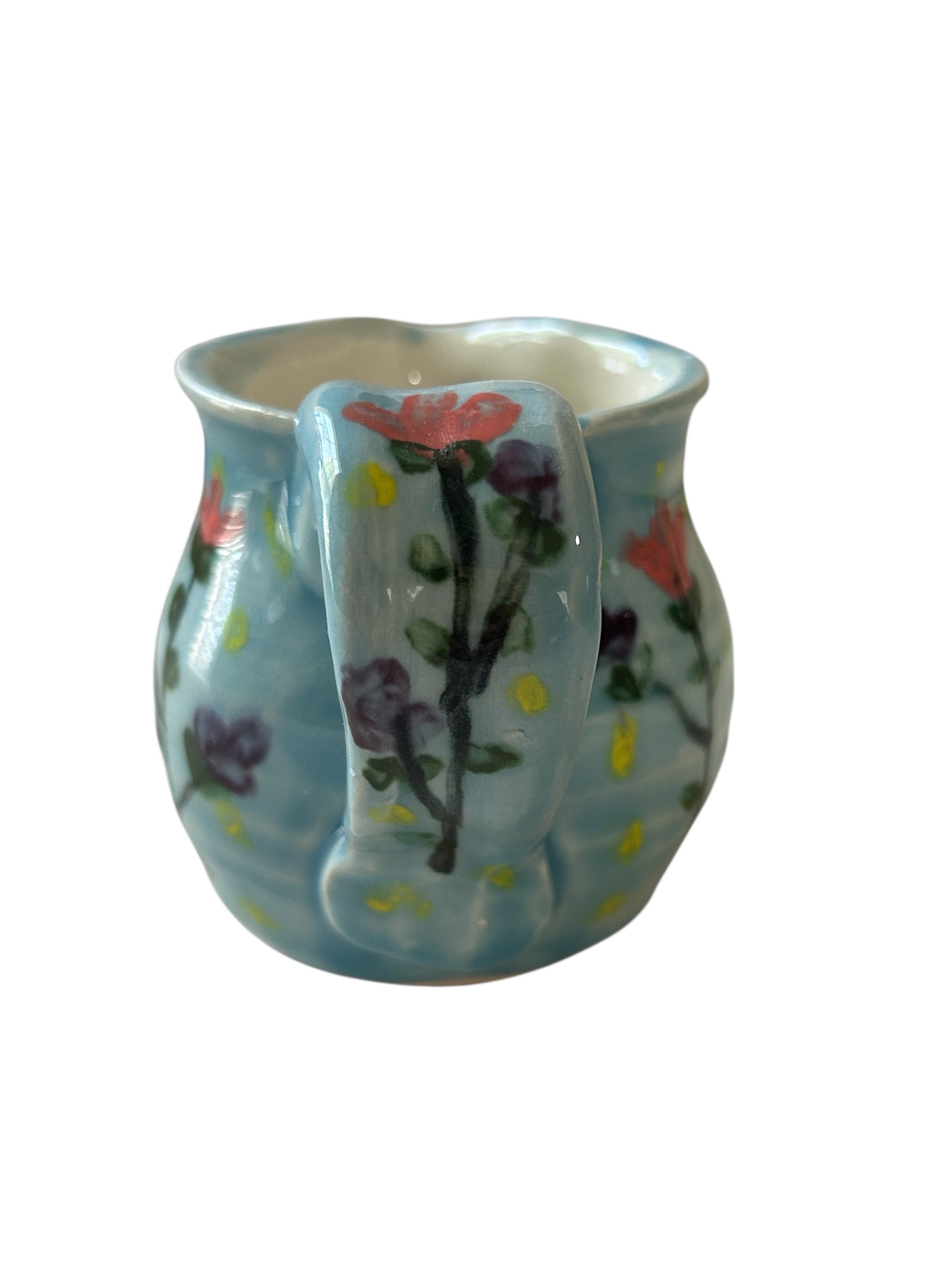 Wheel-thrown creamer handpainted with stylized flowers upon a robin's egg blue.