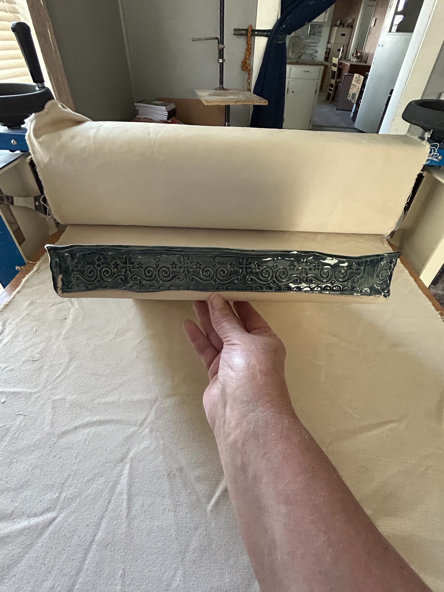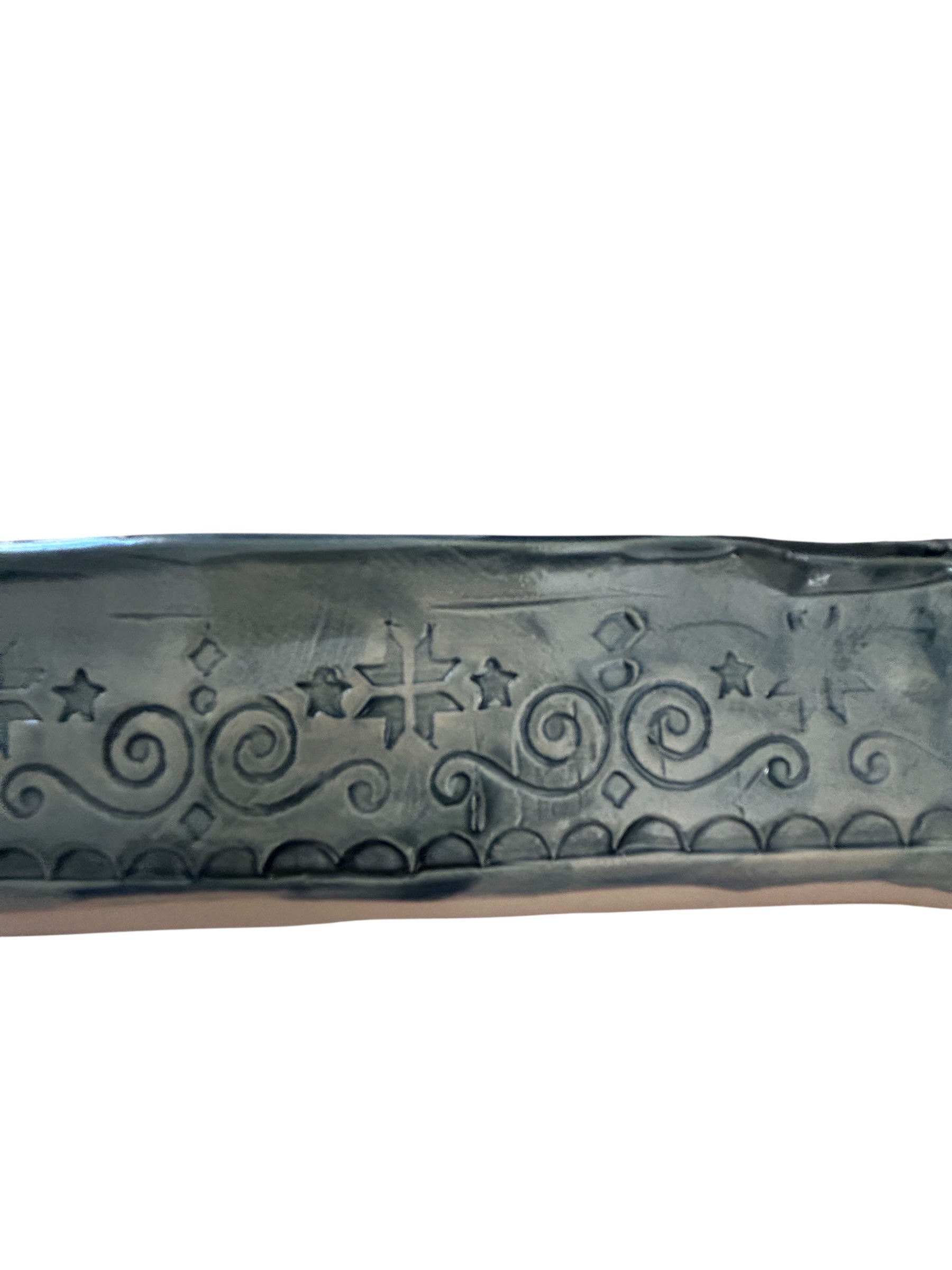 Large baking pan perfect for baking a large sheet cake or casserole. Decorated with rolled Scandinavian scrolls and covered with winter blue glaze on the outside and arctic blue on the inside. Food and dishwasher safe. Oven safe up to 400 deg. F.