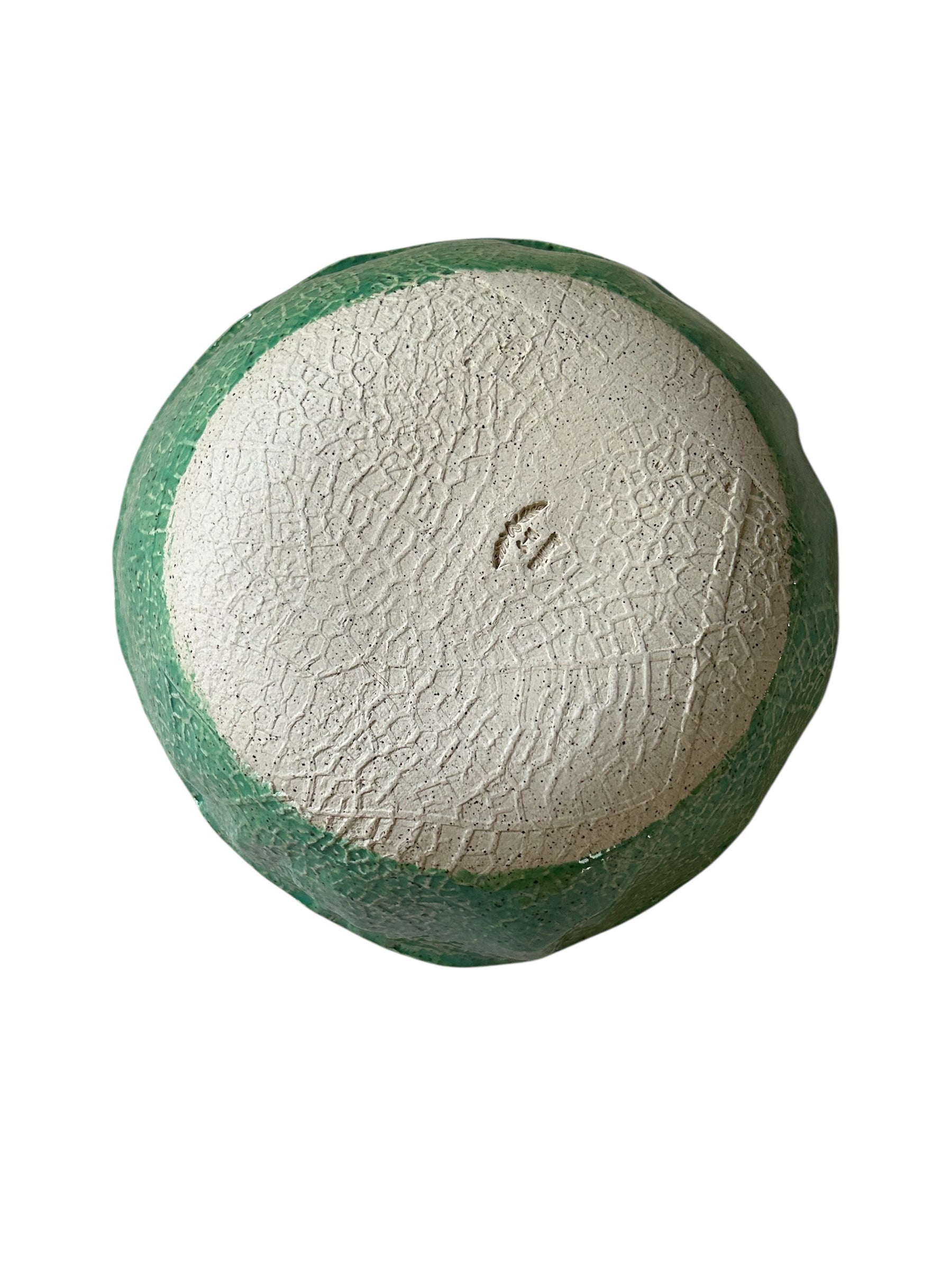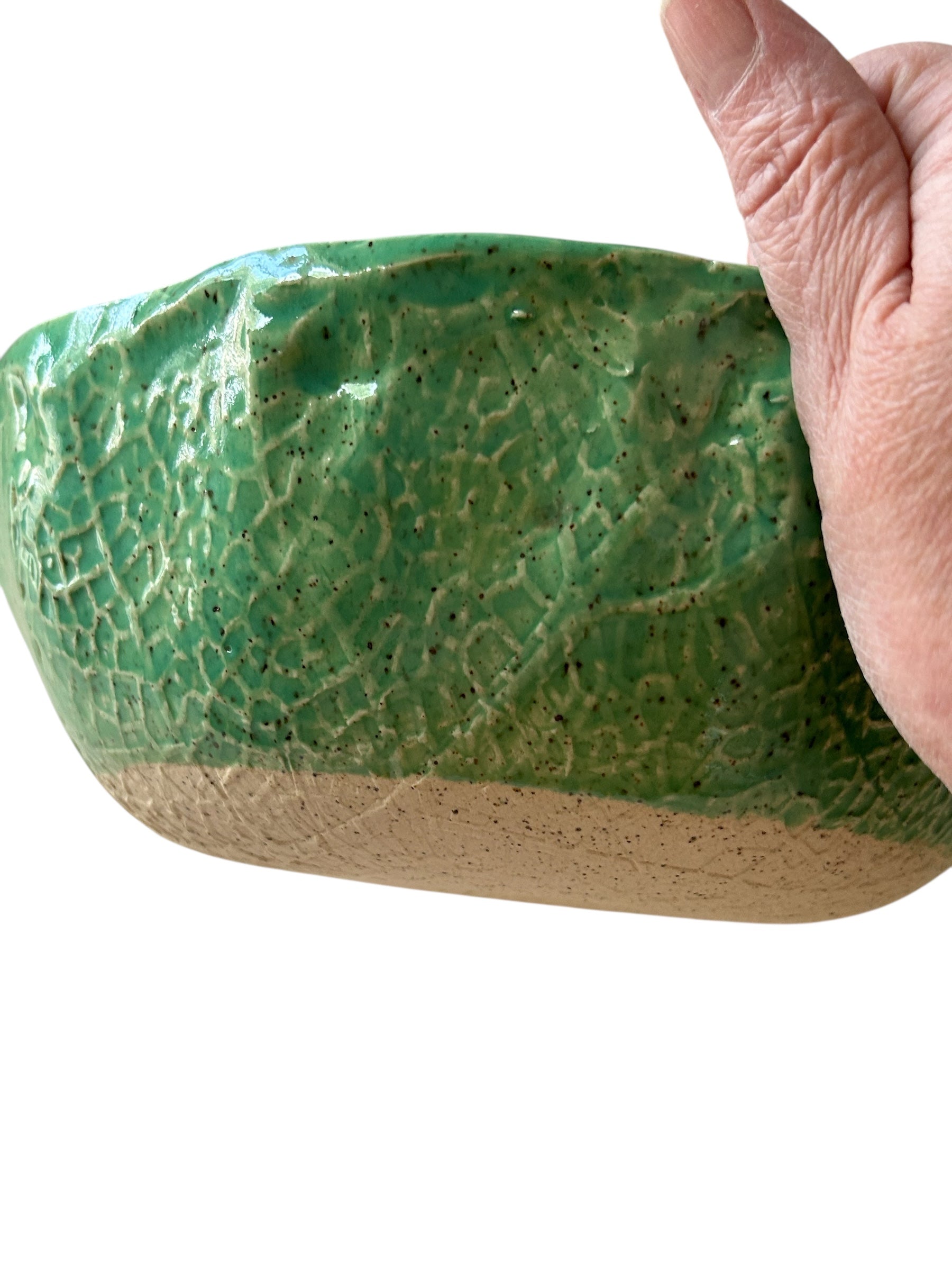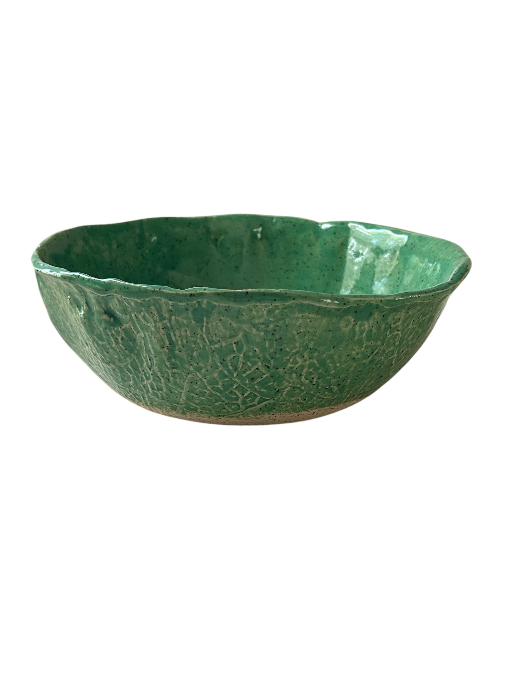 Large textured salad bowl with a broadleaf design imprinted on the exterior. The speckled clay is covered in a trendy fall green glaze that is sure to please. The bowl has ample space to display a large, family-size salad bowl to hold an entire bag of mixed salad greens with all the fixings. Handbuilt slab construction. Food, dishwasher, and microwave safe.