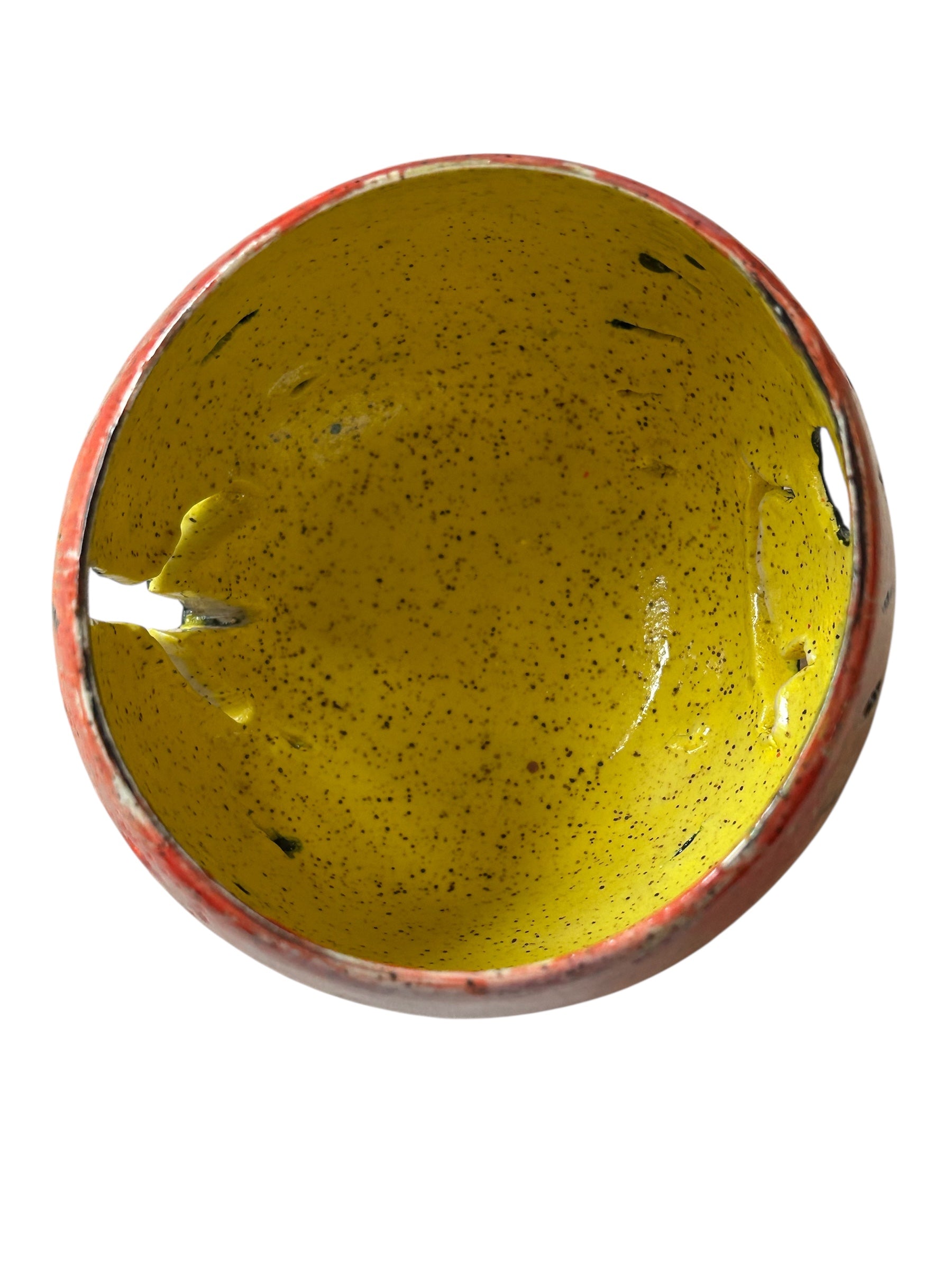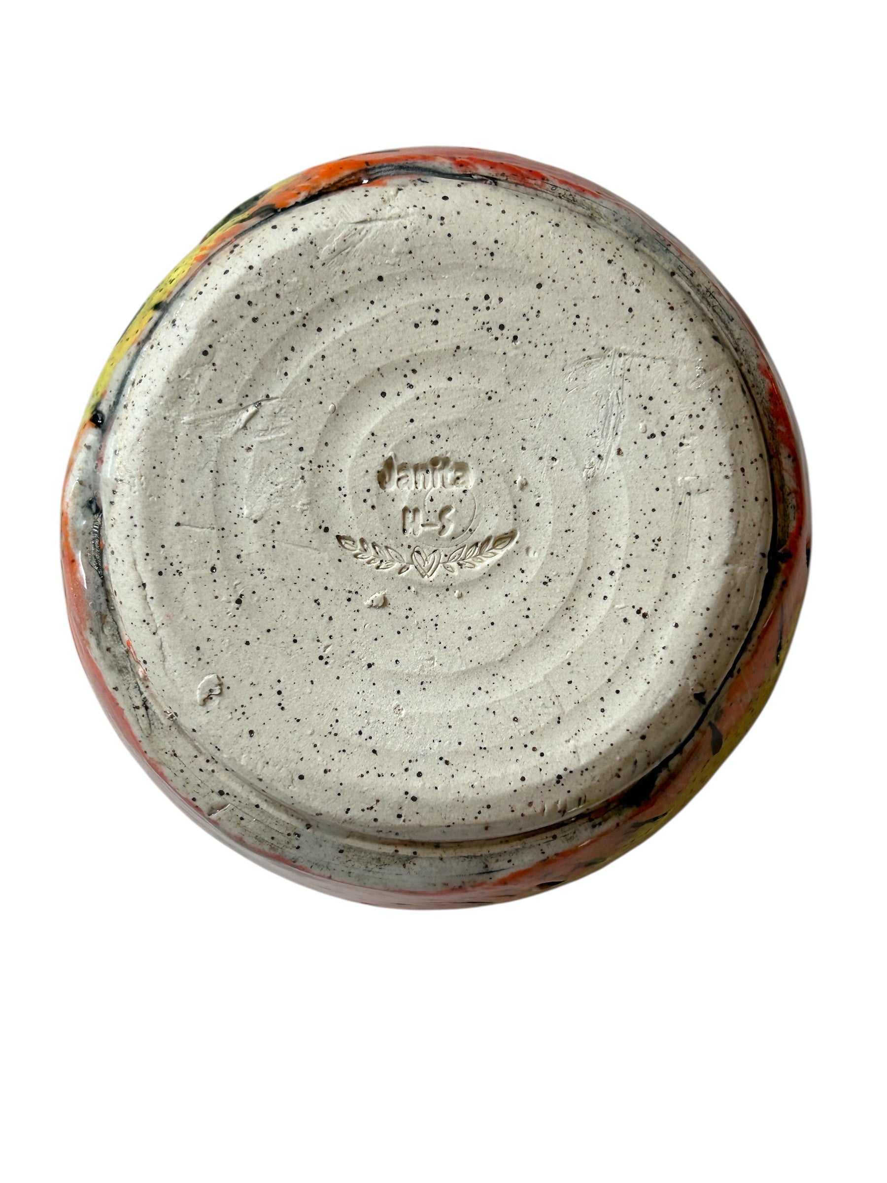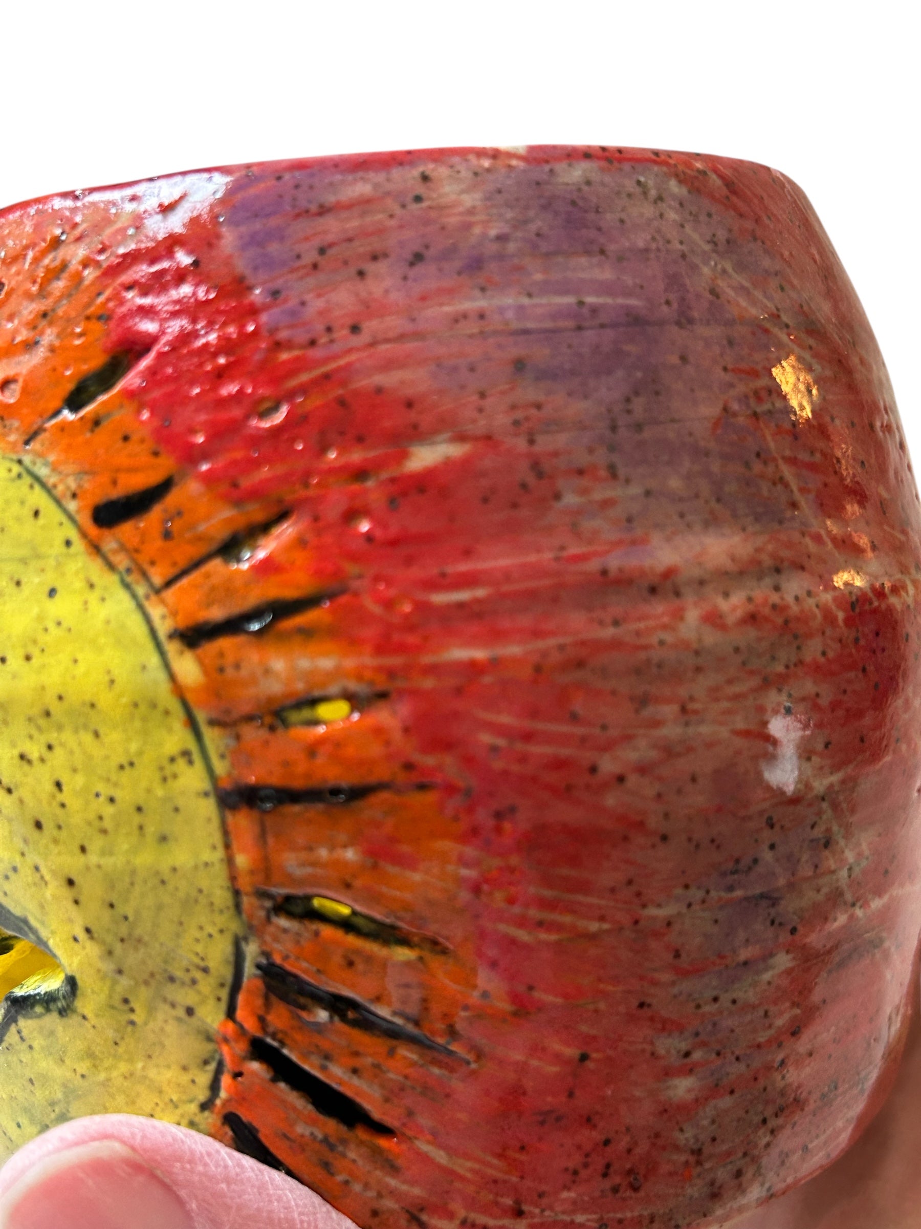 Luminary candle holder with carved retro designs. For use with flameless, battery-powered candle or scented votive candle in glass container (not included). Wheel-thrown construction with speckled clay. Surface is stressed with various markings and covered with rainbow glazes. It is a blast from the past: the 1960s and 1970s, when the smiley face and peace symbols were popular.