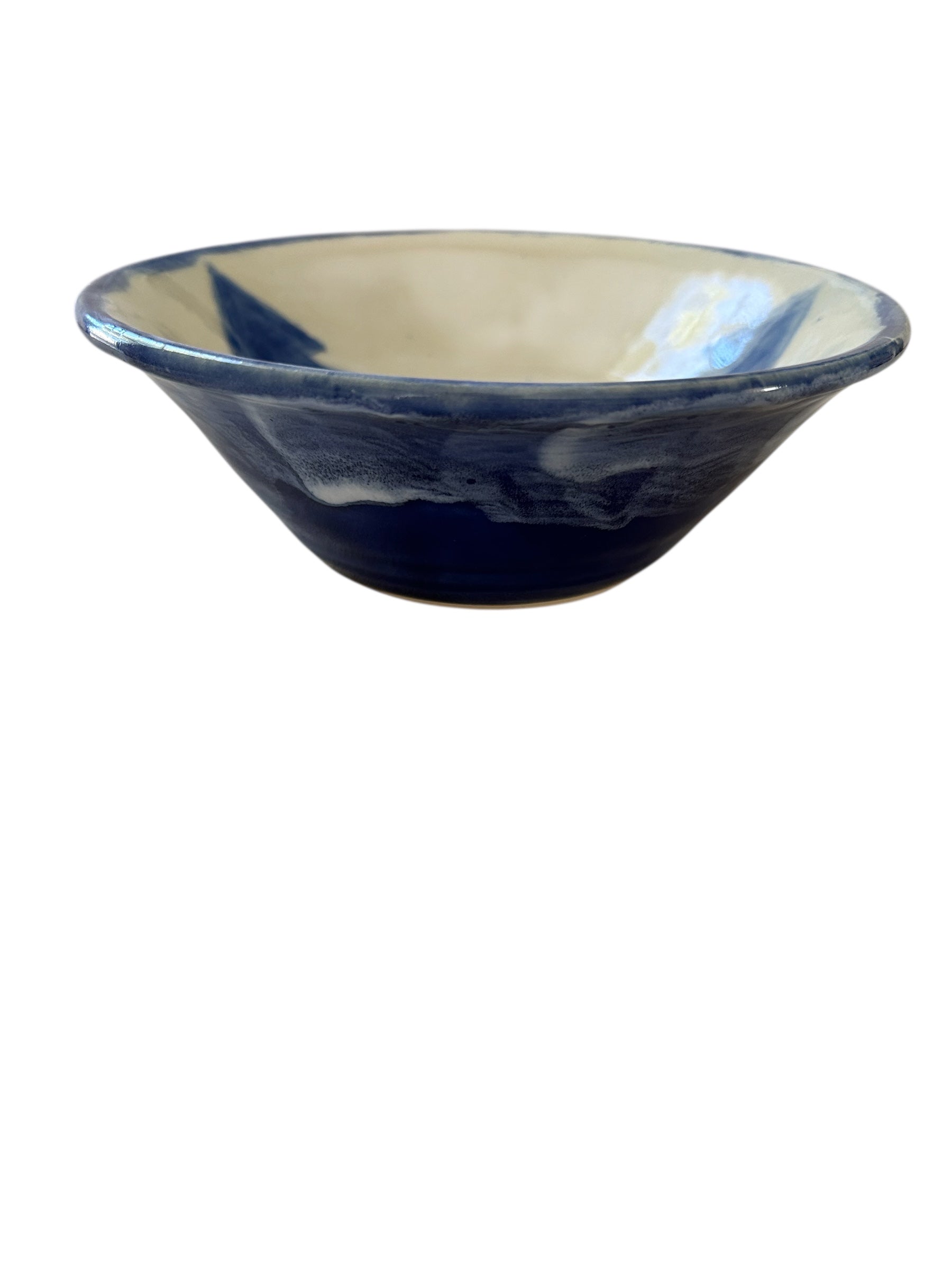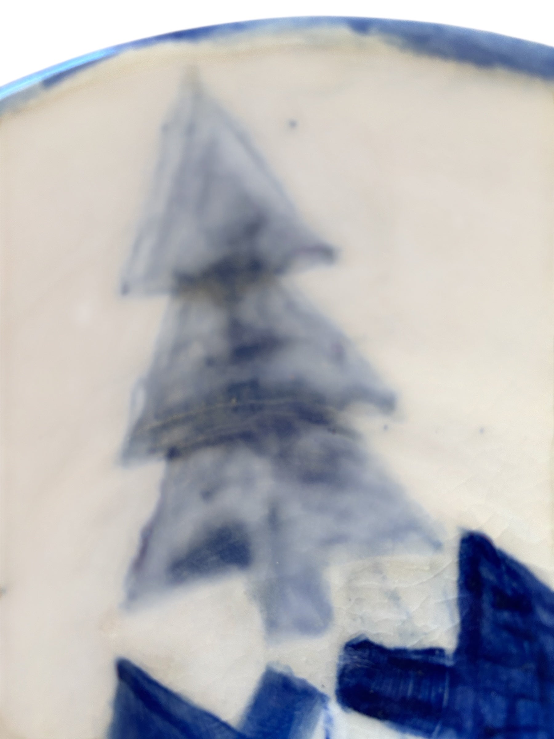 Medium wheel-thrown general-purpose bowl, perfect for a bag of clementines, grapes, apples or pears. Inside is decorated with three handpainted and stylized evergreen trees in three shades of blue set upon a snowy white background. Rolled rim. Food, dishwasher, and microwave safe.
