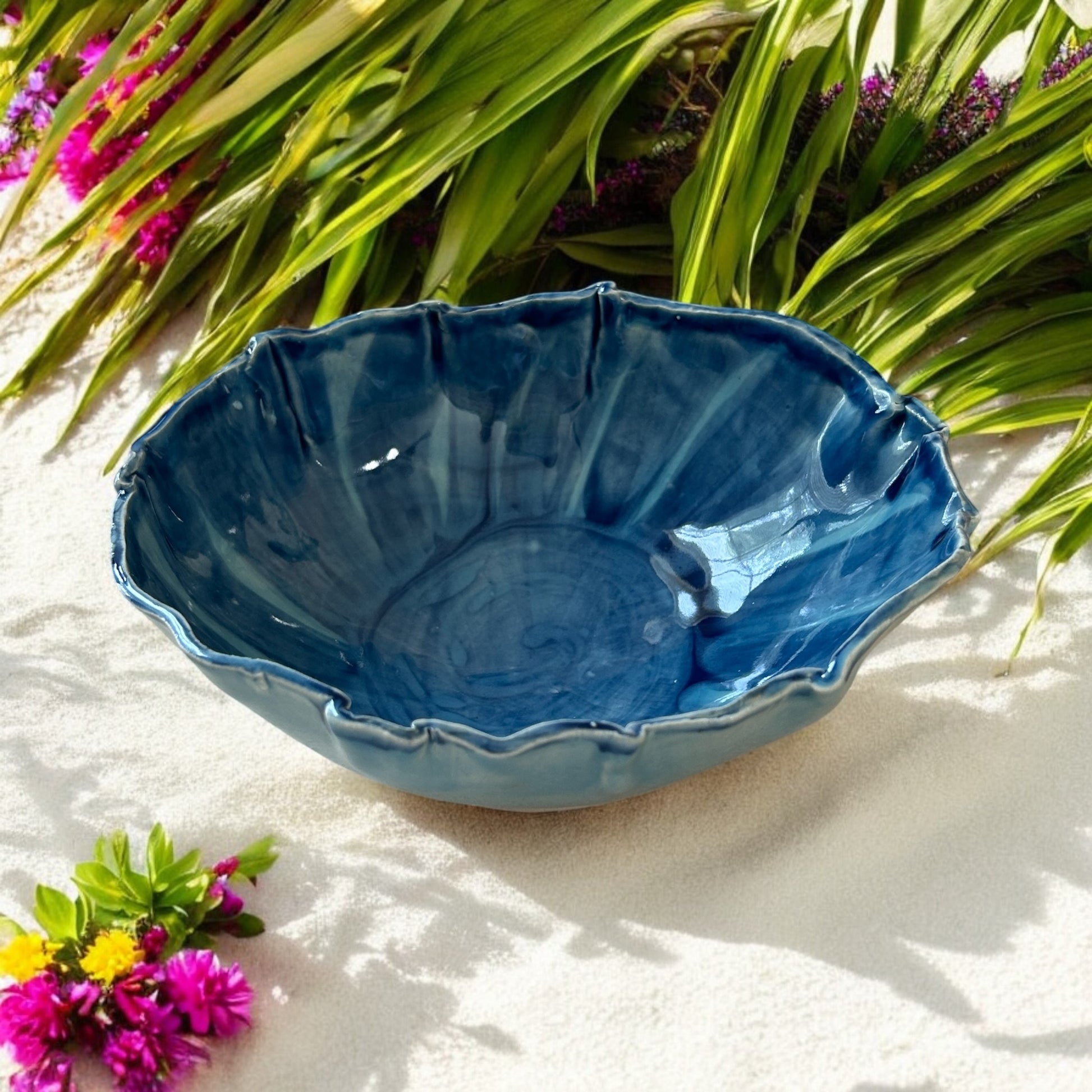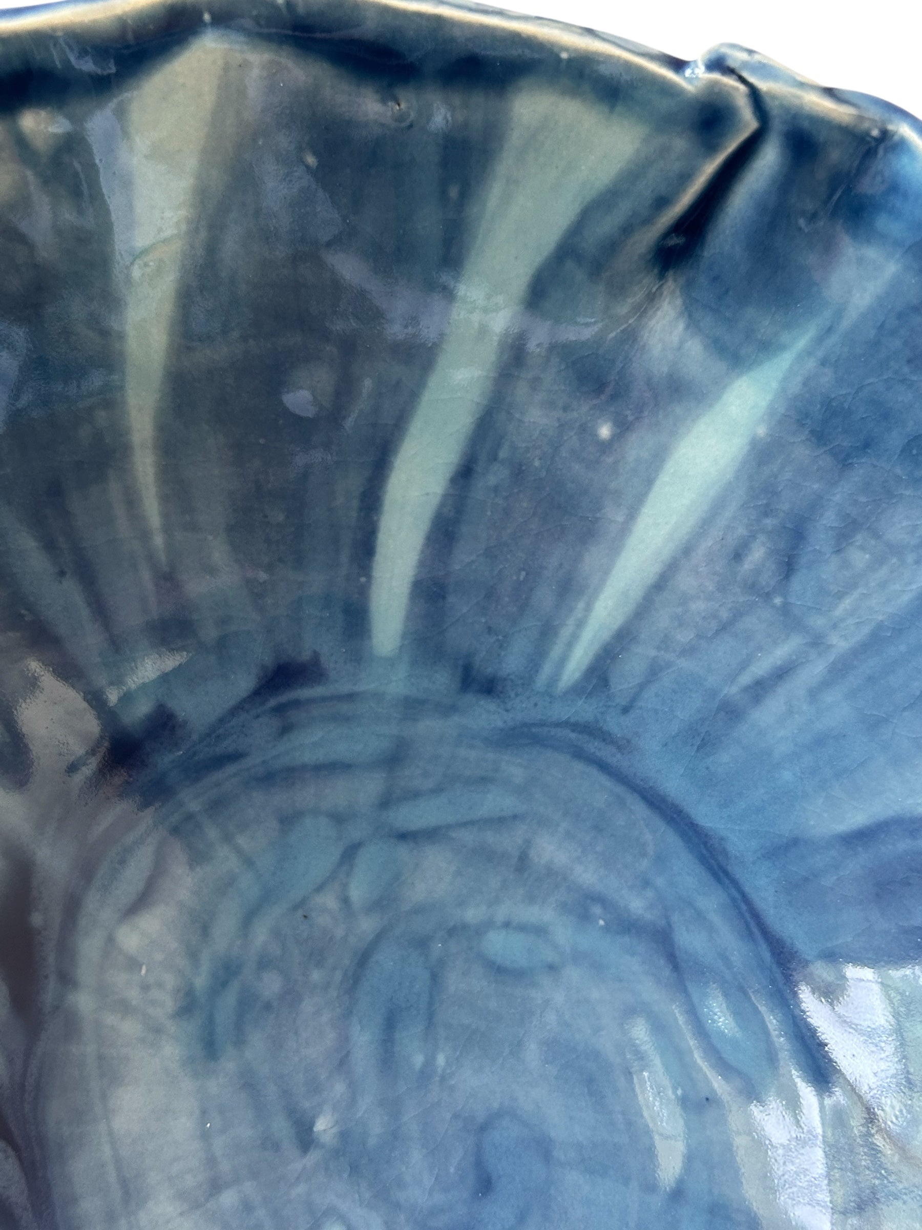 Medium-size side dish bowl with freeform rim and stylized sun or flower design in ocean blue celadon colors. Round foot attached. Perfect for serving large side dishes or individual dinner-size salads.