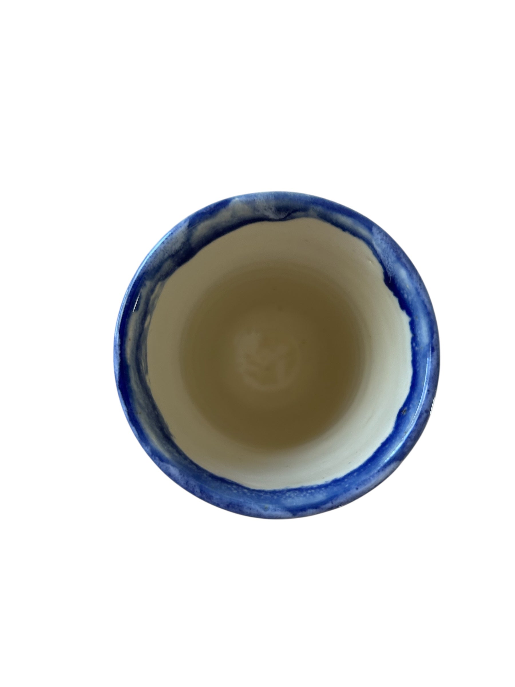 Monoprint juice cup with log cabin and snowy mountains in the background. Wheel-thrown construction. Rim and inside of cup are glazed with food safe glazes. Bottom of exterior has applied monoprint and is not glazed for textural contrast. Perfect size for your morning orange juice. Please note this is a small cup, so to avoid confusion, check the measurements below to make sure it will suit your purpose.
