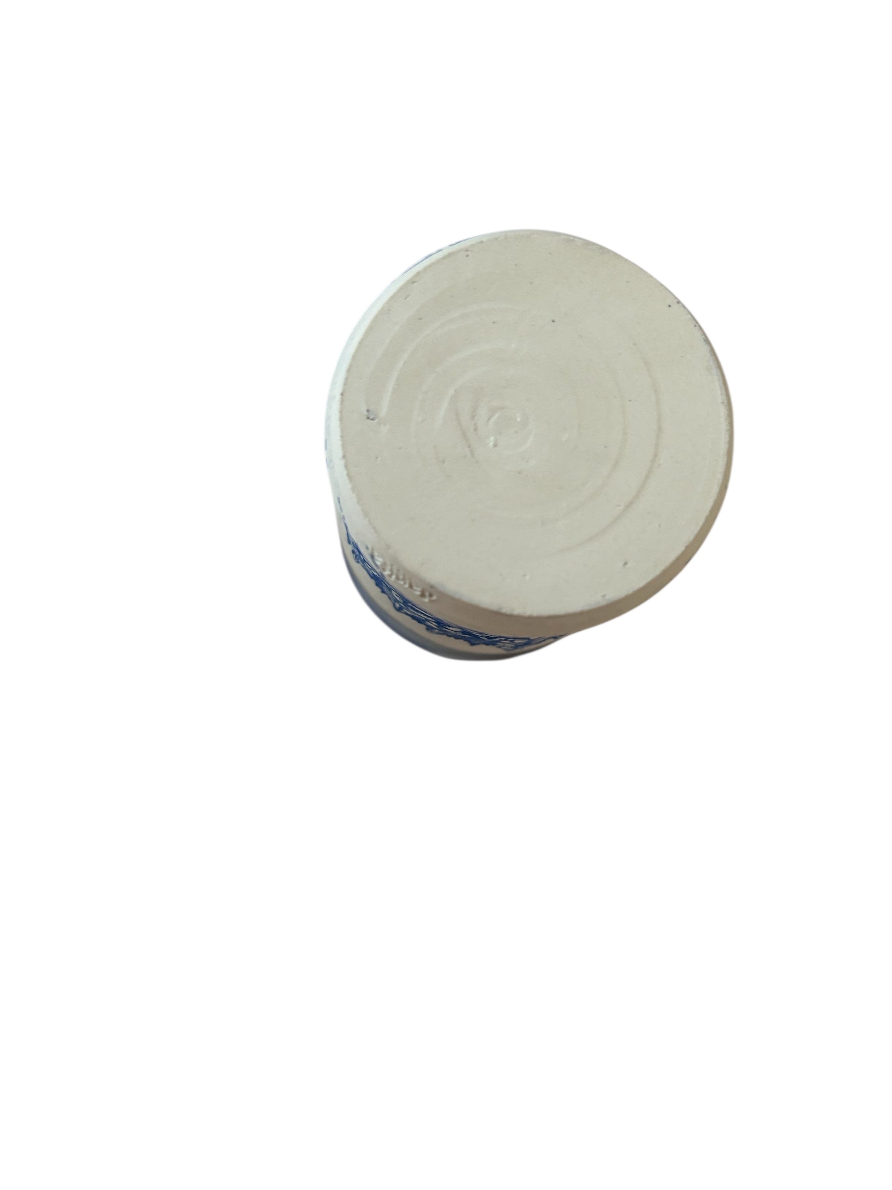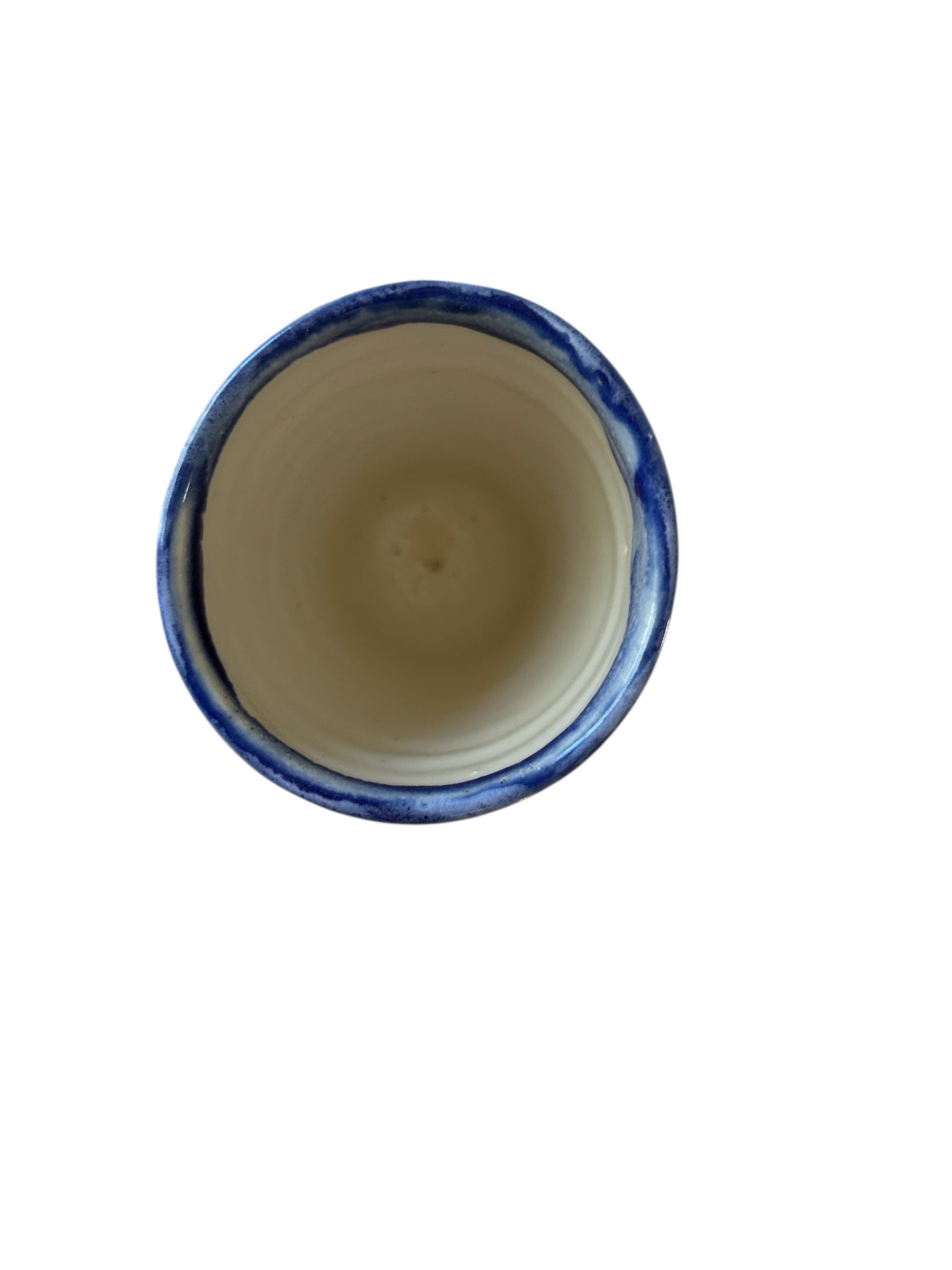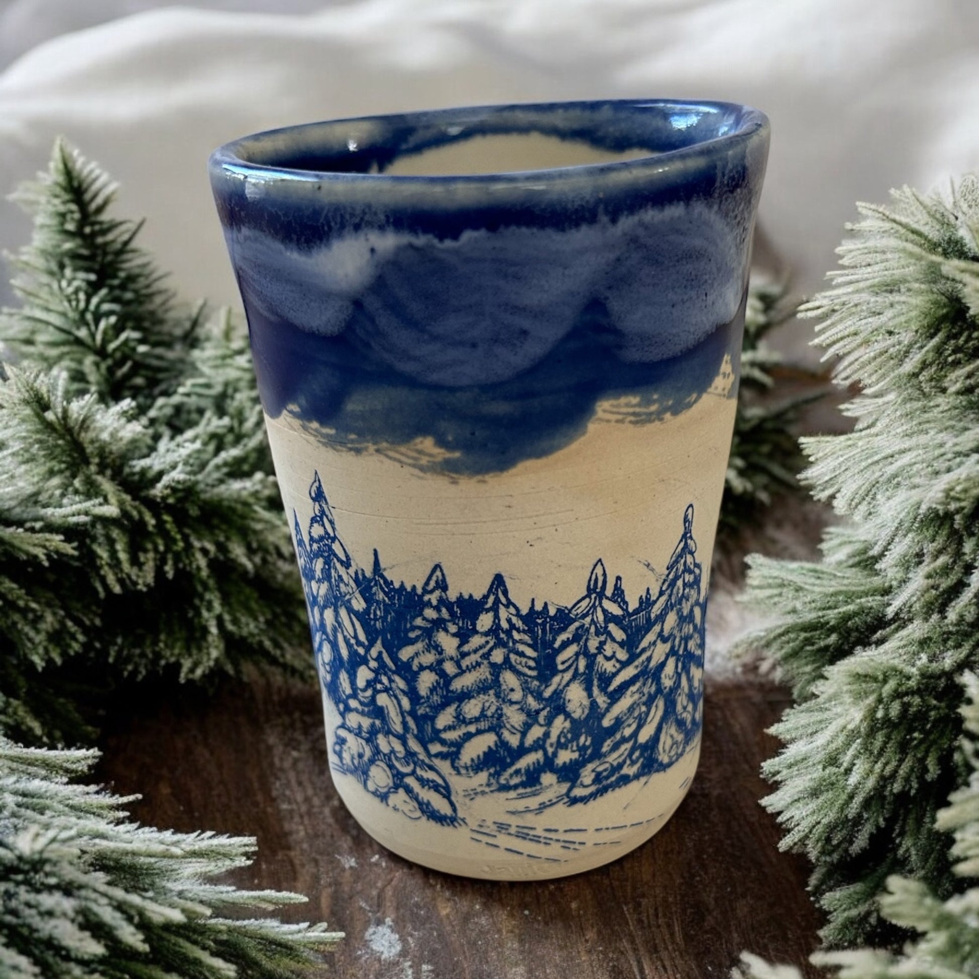 Monoprint juice cup with snowy evergreens in the background. Wheel-thrown construction. Rim and inside of cup are glazed with food safe glazes. Bottom of exterior has applied monoprint and is not glazed for textural contrast. Perfect size for your morning orange juice. Please note this is a small cup, so to avoid confusion, check the measurements below to make sure it will suit your purpose.