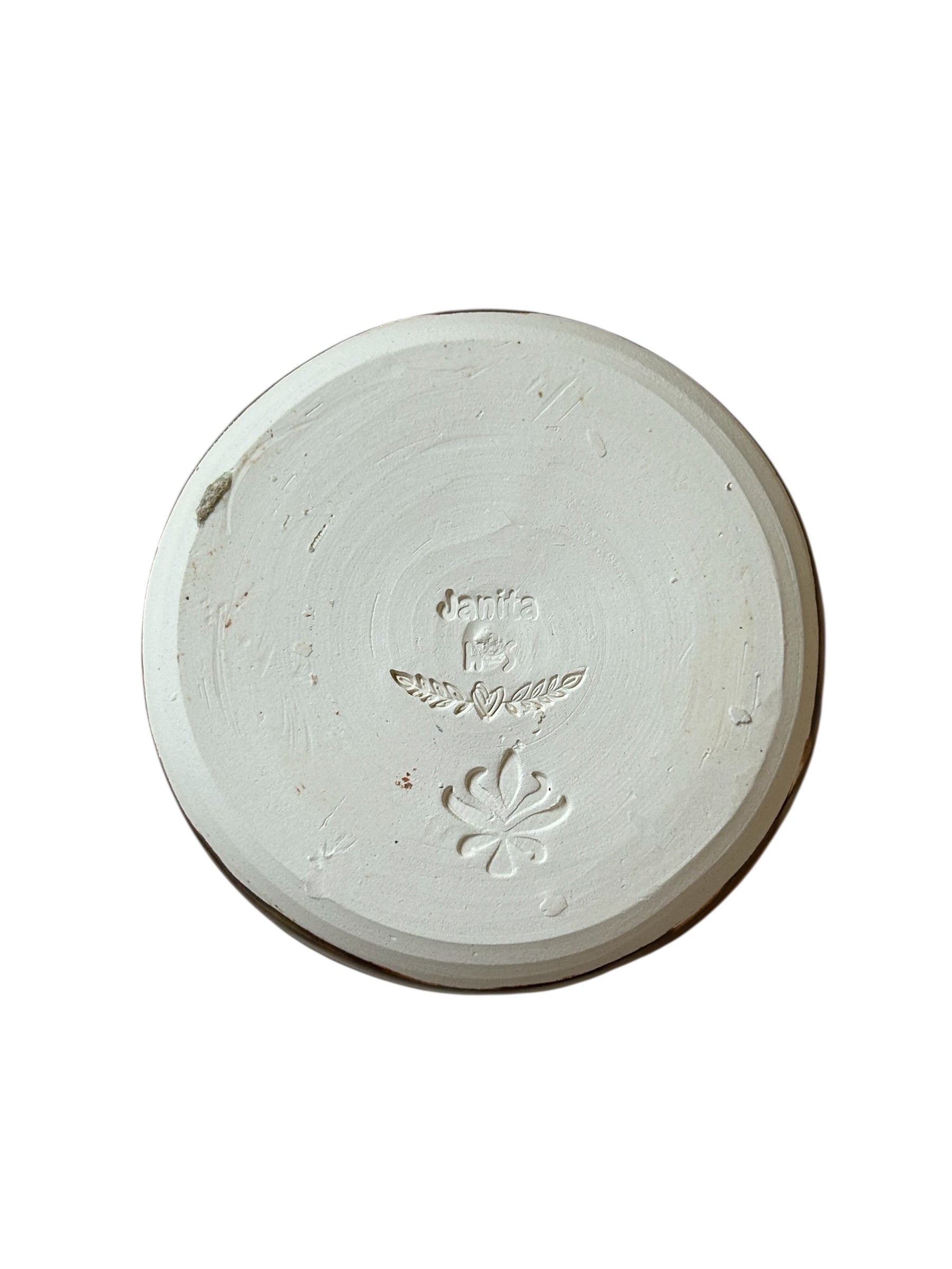 Minature wheel-thrown jar with lid. Lid and jar were thrown at the same time, then cut and shaped later for a perfect fit. Glazed in opal green food-safe glaze that breaks reddish brown over texture. Made to hold small items. Perfect for Japanese-style interiors.