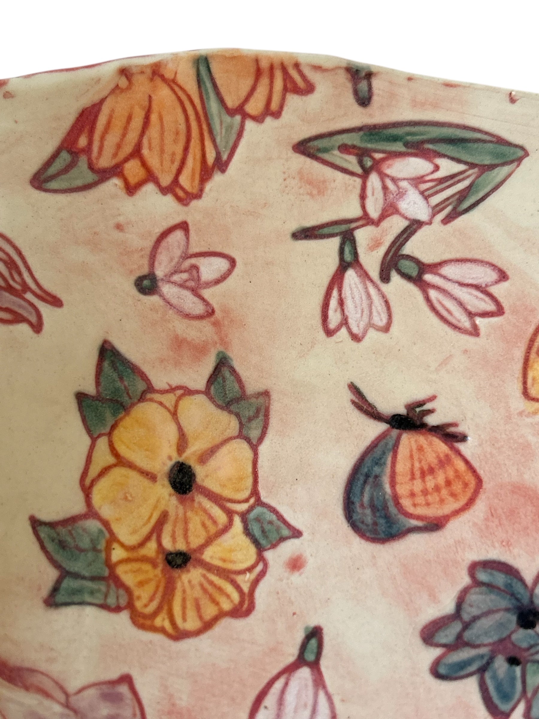 Medium origami-style bowl with freeform rim and handpainted spring flowers and butterflies in pink, peach, lilac, white, and green. Shaping method is handbuilding. Has a footed rim on bottom.