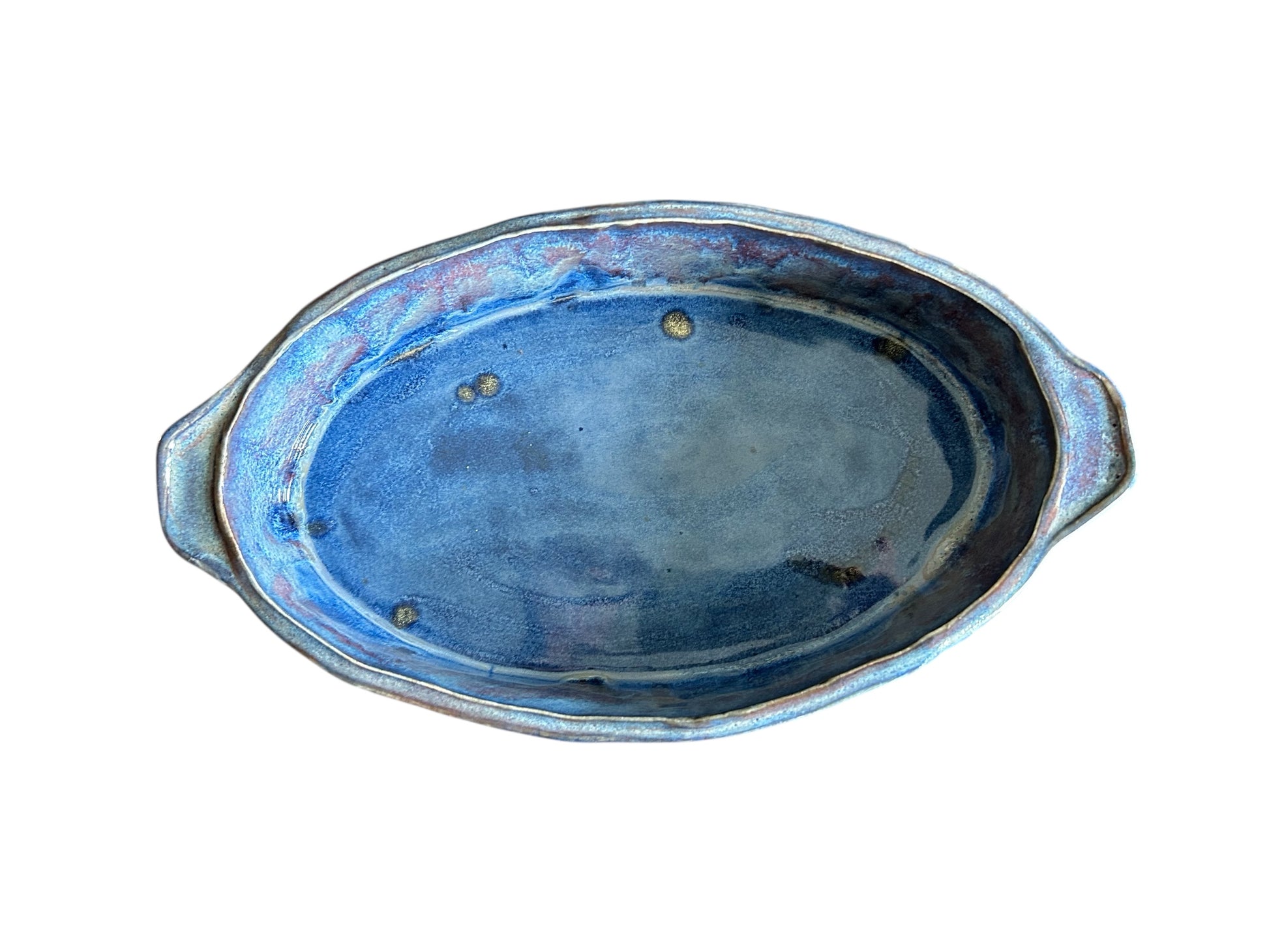 All elements of this casserole were extruded: base, rim, walls, and handles. Covered in food-safe glazes. Oven-safe up to 400 deg. F. Microwave and dishwasher safe.