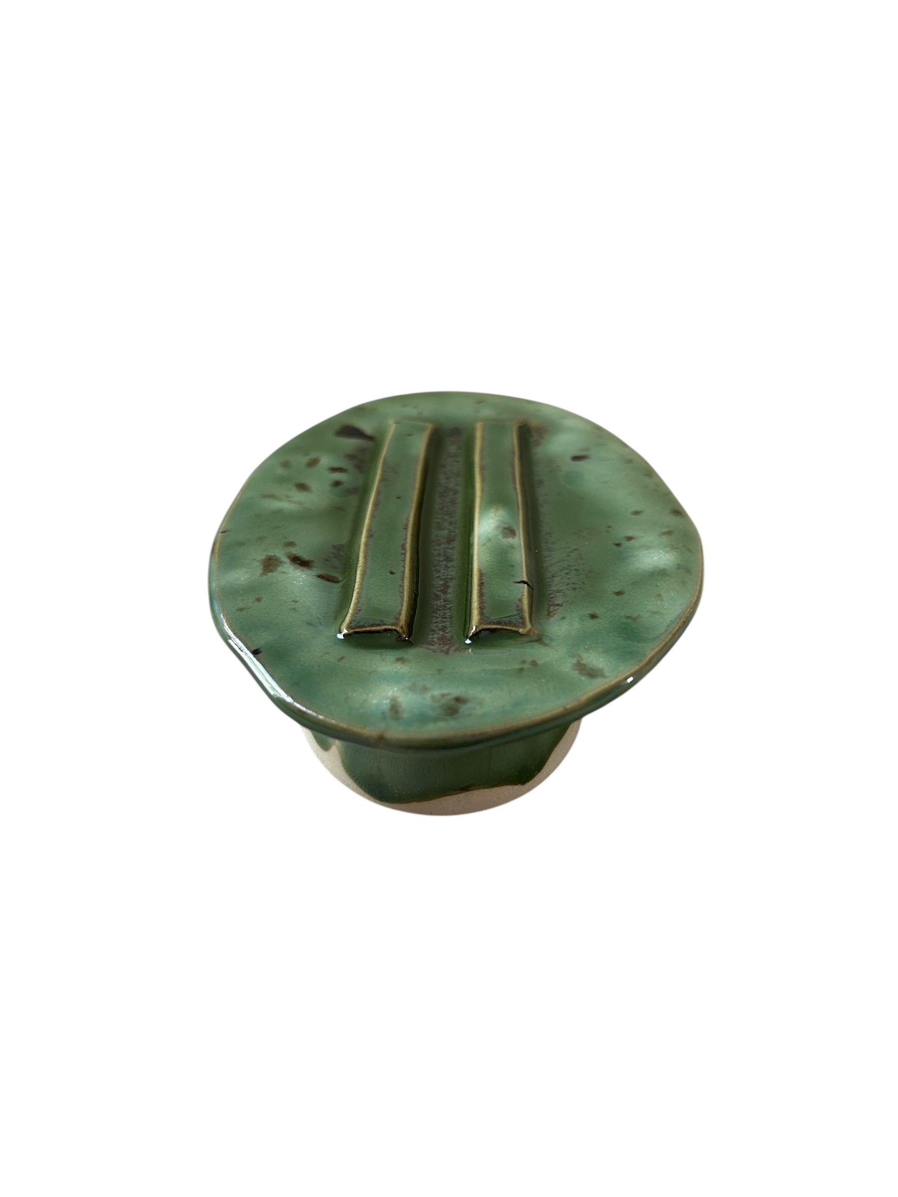 Pedestal-style soap dish in Aspen green. Covered with food-safe glaze. Slab construction. Food, dishwasher, and microwave safe.