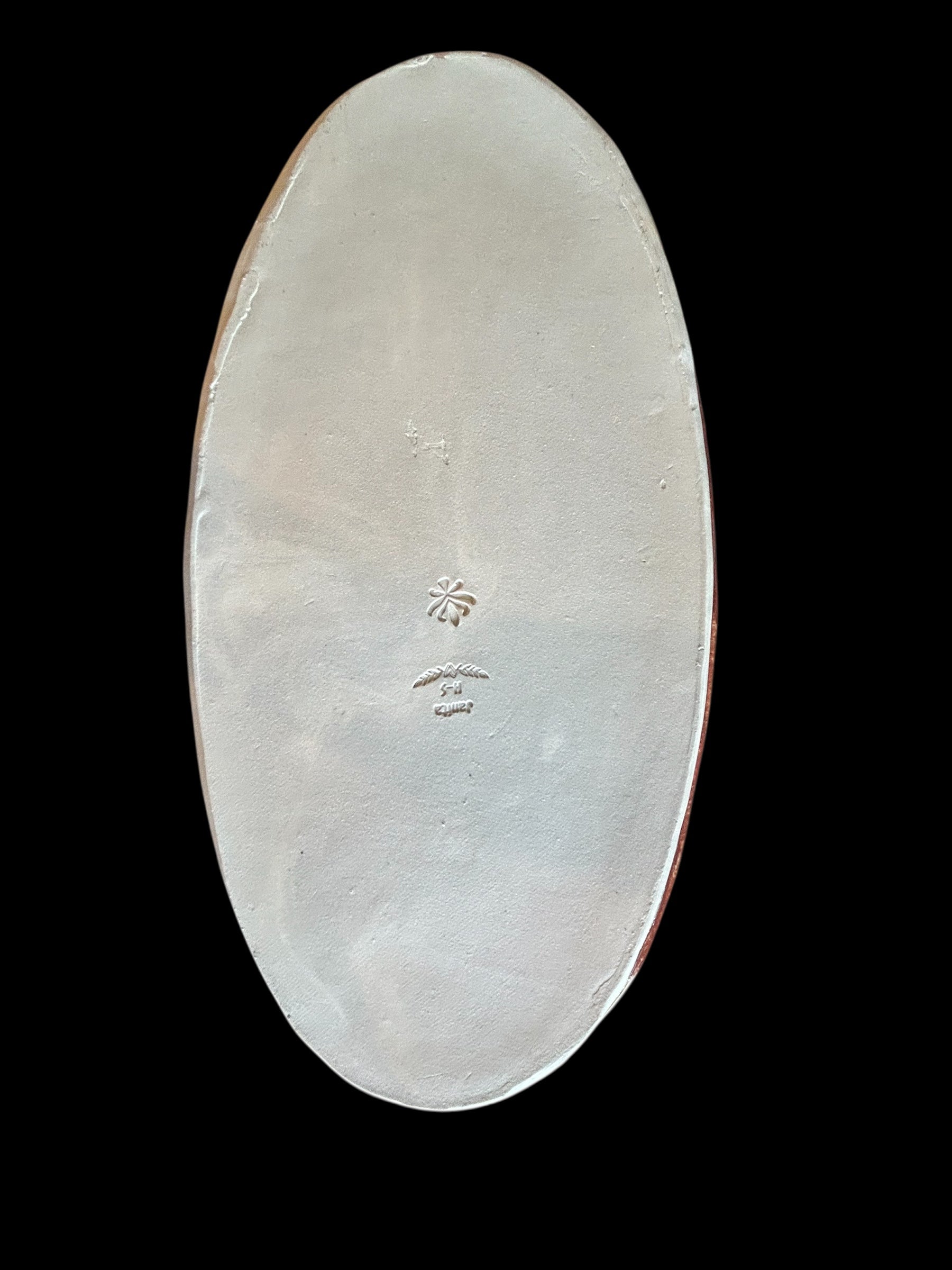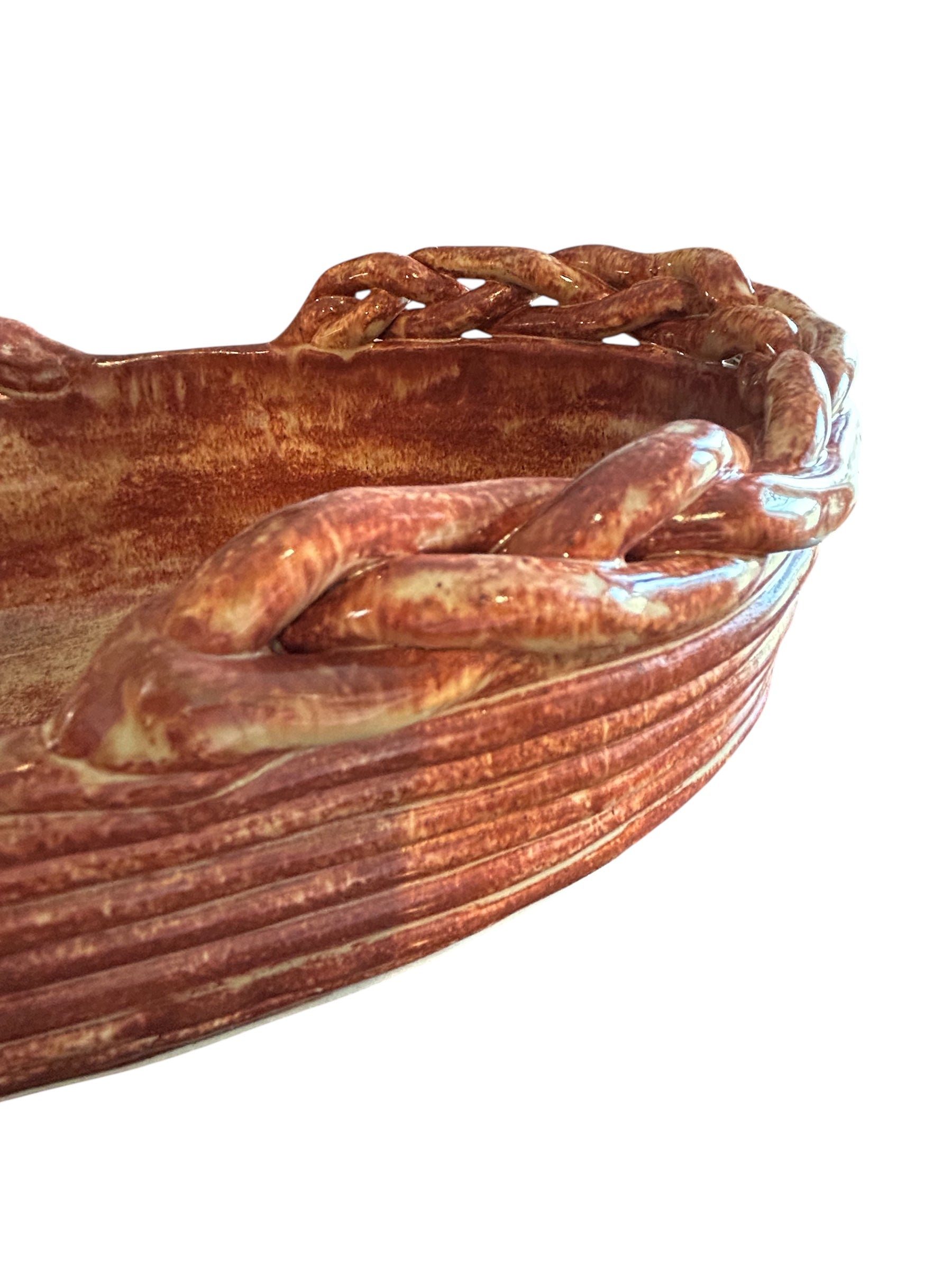 Substantial oval-shaped bread basket made from coiled stoneware clay. This is an extra-large bread basket, the kind you see on restaurant buffets that holds homemade rolls and muffins. It is covered with my favorite food-safe glaze called Albany slip brown, which has a warm brown foundation that breaks to a lovely yellow-beige over textured surfaces. This would make a perfect addition to your next large gathering during the upcoming holiday season.