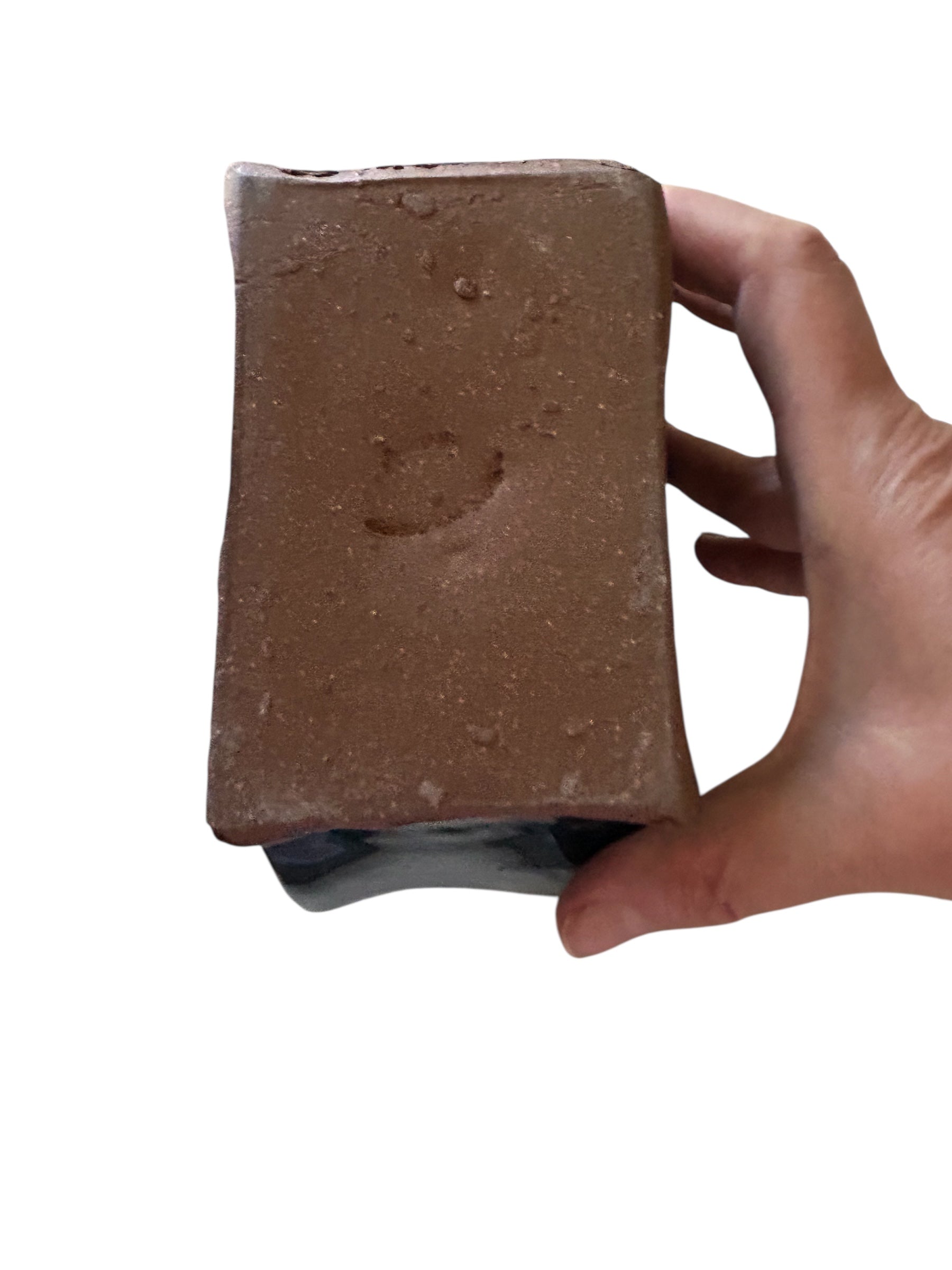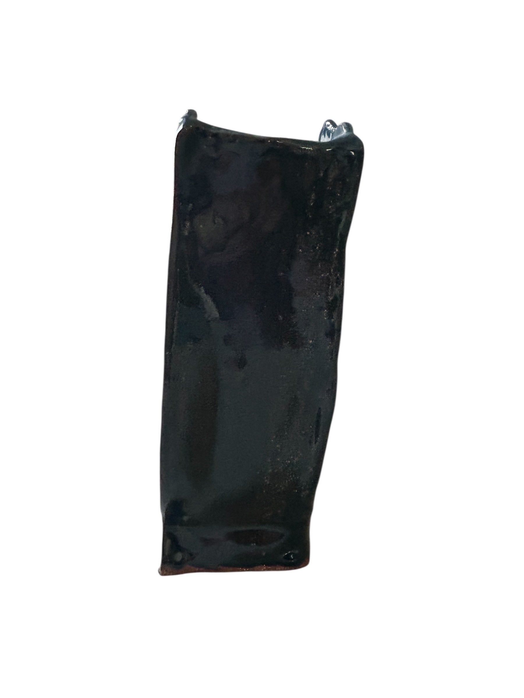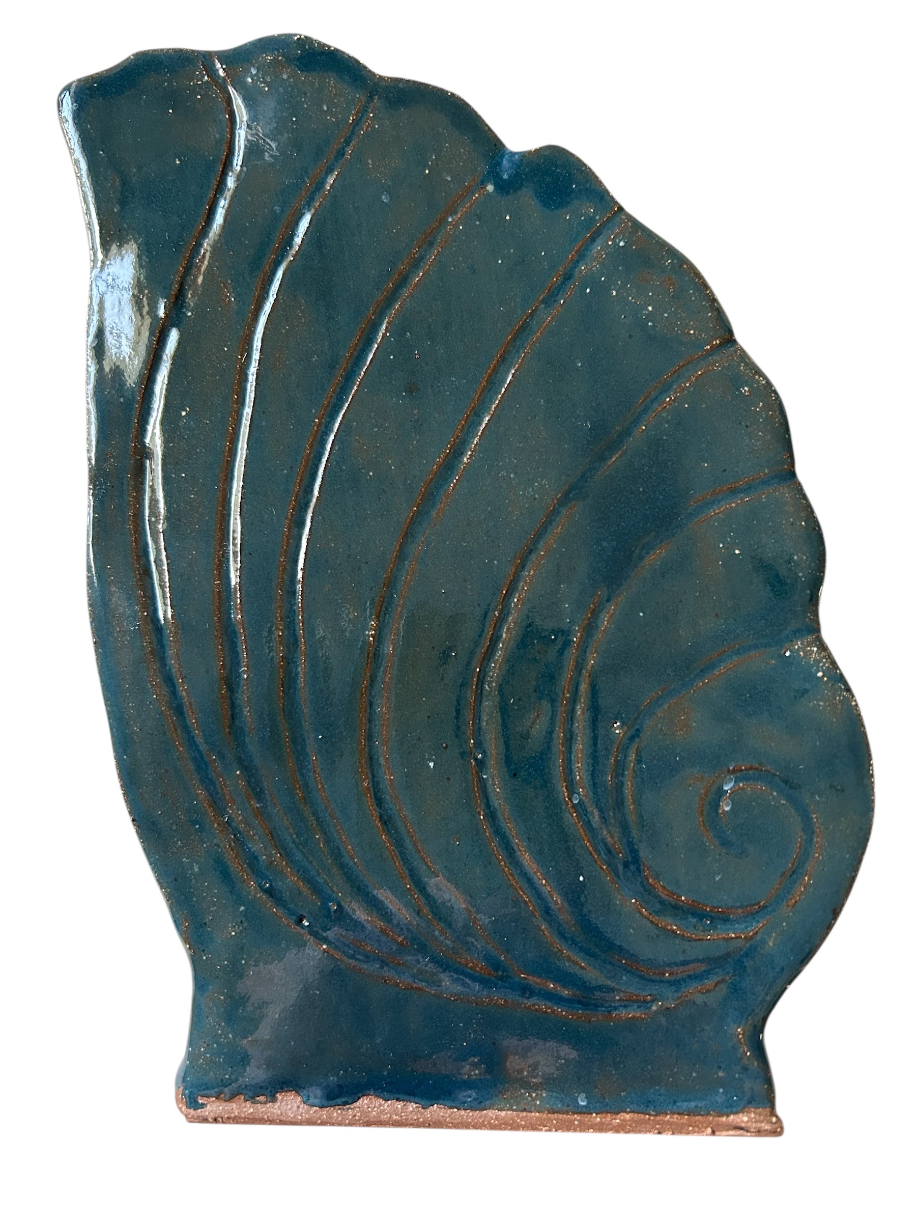 Handbuilt from large slab of dark chocolate clay. Based on the 1920s pottery made by Camark of Arkansas called "Nautilus." Carved shell design and covered with deep sea blue glaze. Can be used as a vase or a planter.