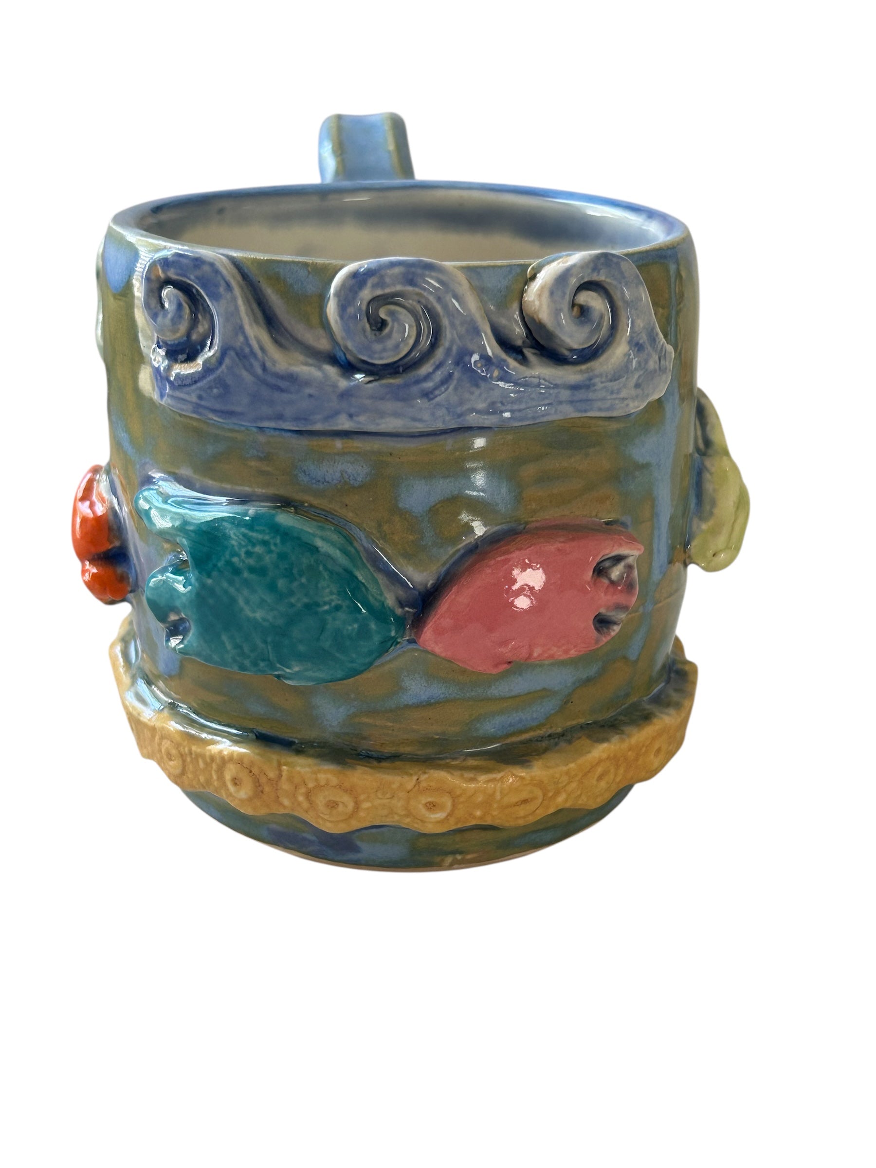 Wheel-thrown mug with sprigged and sculpted fish, coral, and waves. Food-safe, microwave safe, and dishwasher safe.