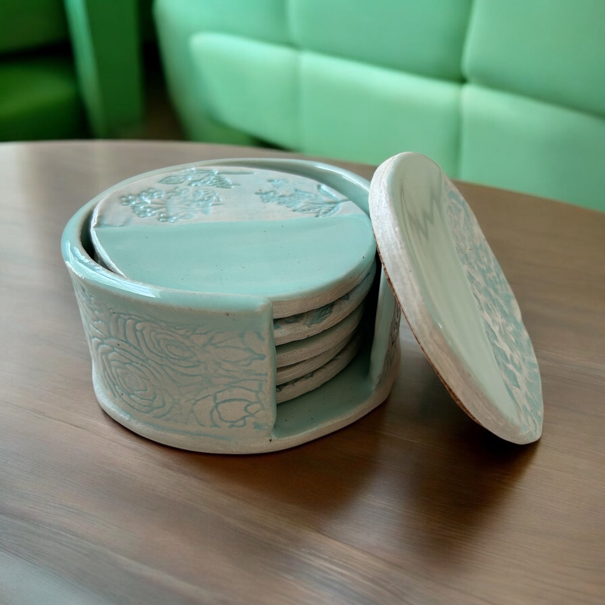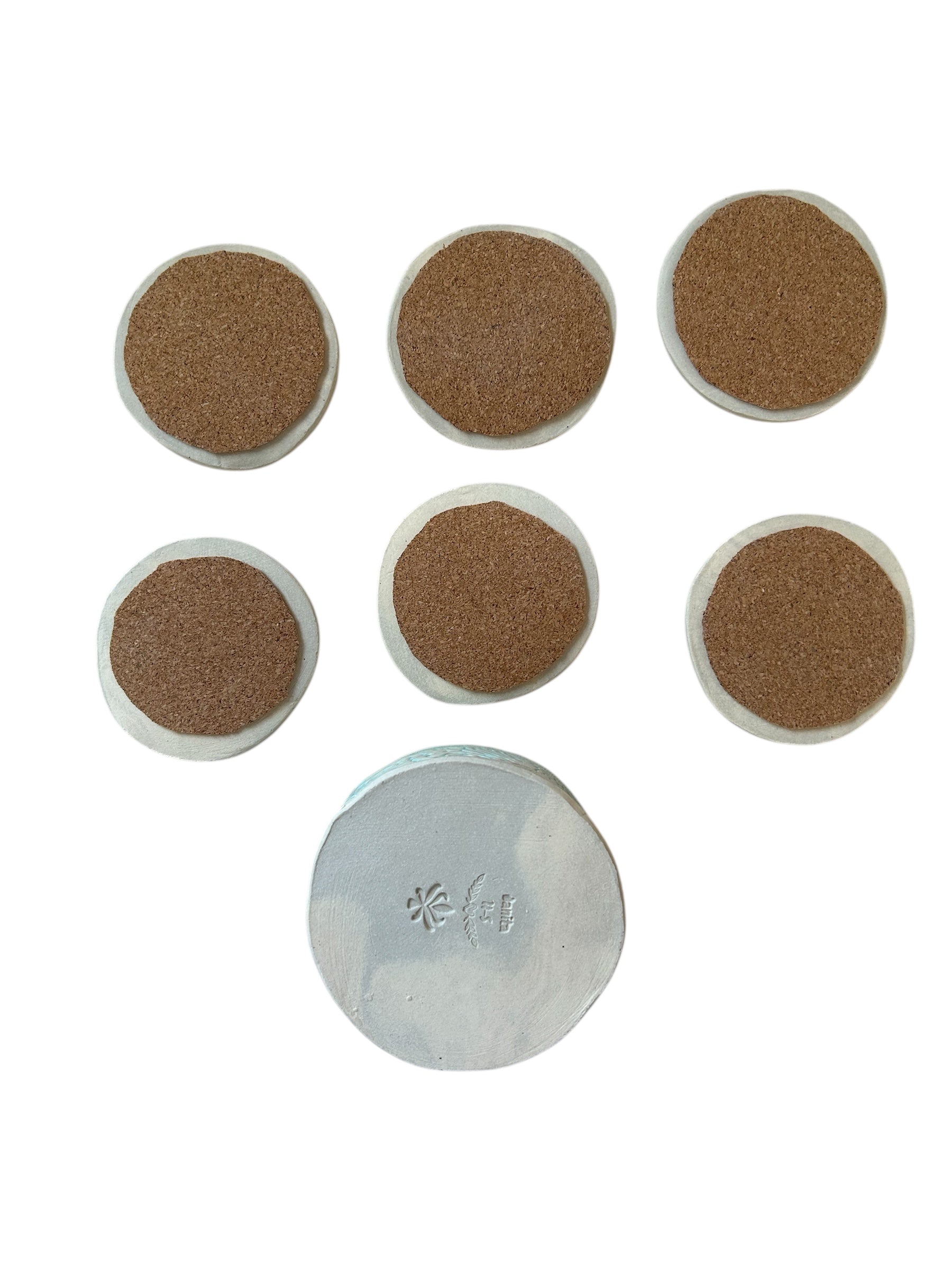 Set of six (6) coasters to protect your furniture from water marks. Handbuilt shaping method. Bottoms are covered with natural cork for extra protection against moisture and skid marks.