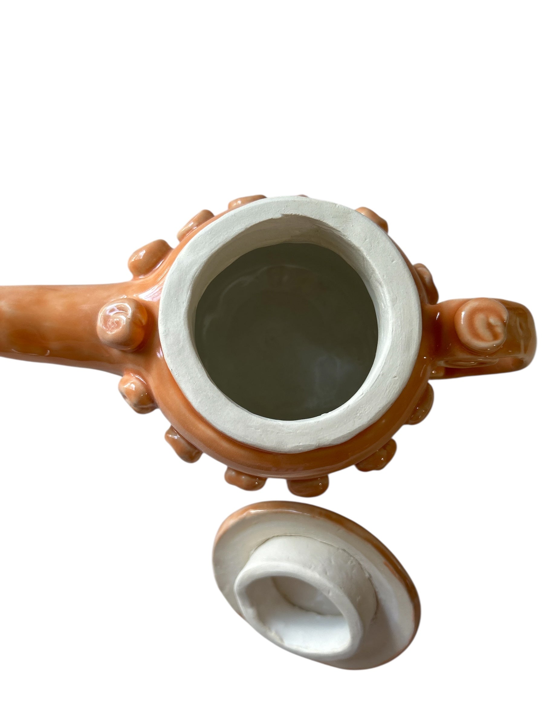 Set of teapot and two tea cups with saucers glazed in tangerine orange. Surface is decorated with whimsical spirals and a curly handle. Interior surface is glazed with a white liner glaze.