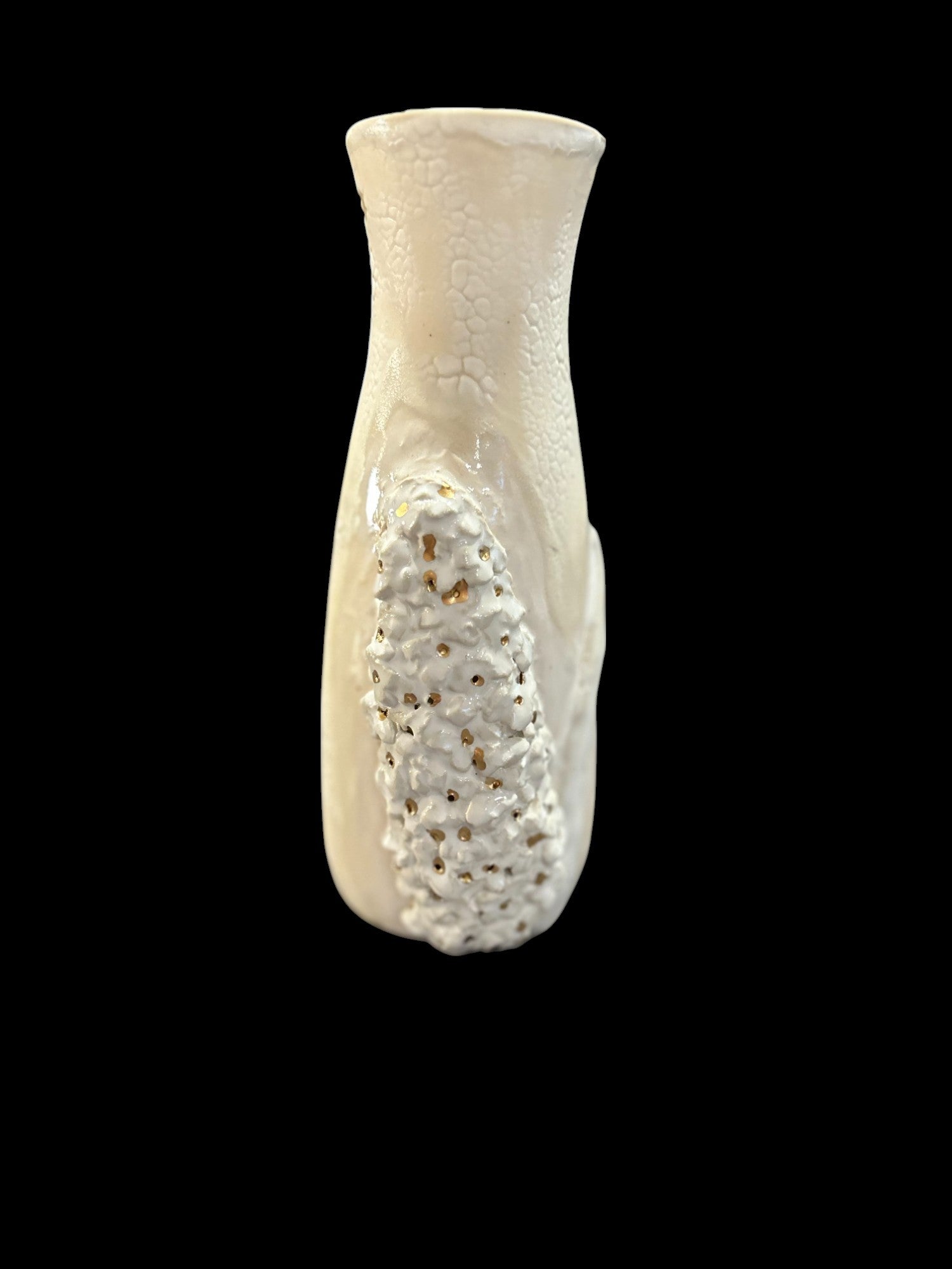 DISCLAIMER: This vase will hold liquid, but it is not food, dishwasher, or food safe due to the gold leaf accents. Careful handwashing is recommended, if needed.