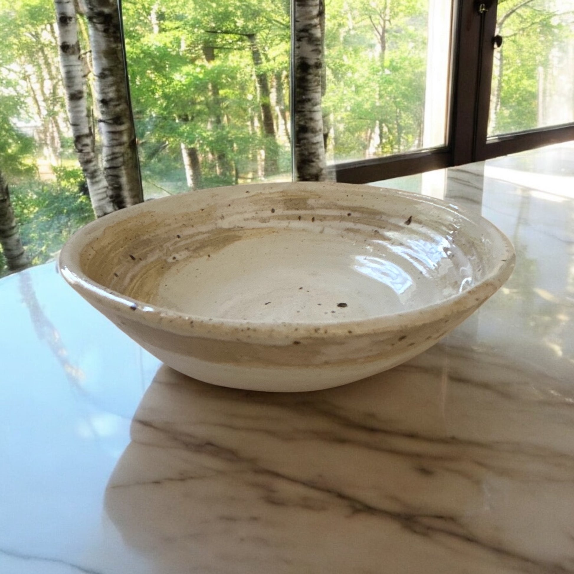 Small snack bowl perfect for serving small snacks, such as nuts or candies. Holds approximately 1 1/2 cups of small snacks. Glazed with food-safe flux glaze in river birch and snowy white, reminiscent of the Aspen trees in Colorado. Wheel-thrown shaping method. White stoneware clay was used.