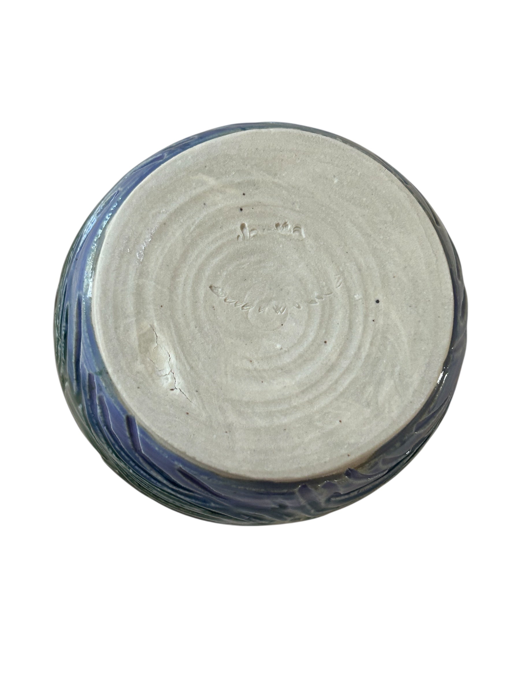 Small cup with carved sunset designs. Inside is glazed in a smoky merlot, and the outside is glazed with various rainbow colors. Food, dishwasher, and microwave safe.