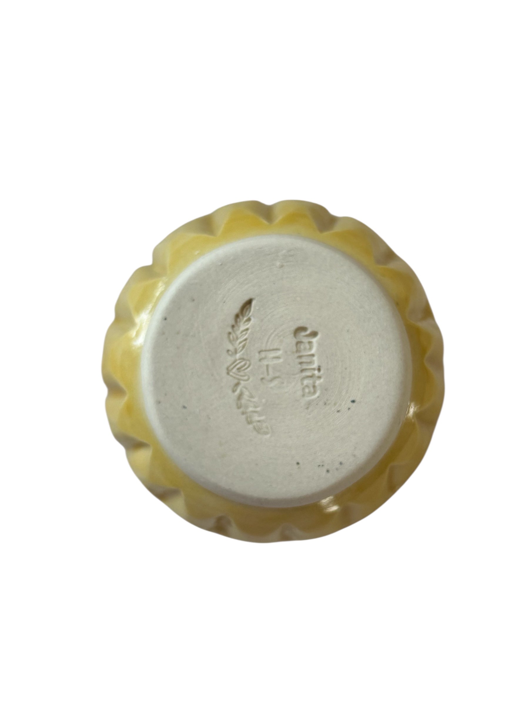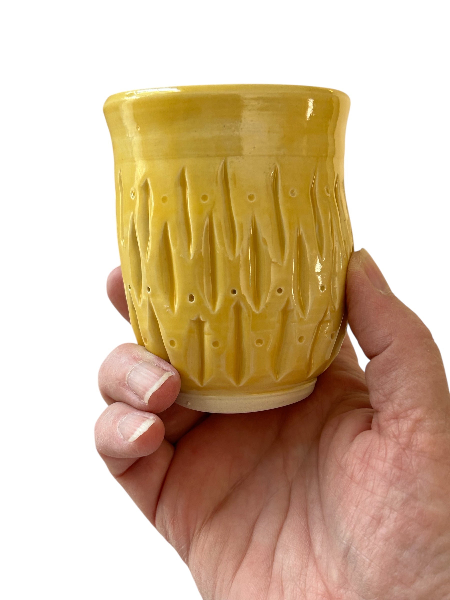 Small fluted cup glazed with translucent daffodil yellow on the outside and marigold yellow on the inside. Holds approximately 4 ounces of liquid. Please note this is a small cup, so check the measurements below to make sure it will serve your purposes. I use mine of this size in the bathroom for rinsing after brushing.