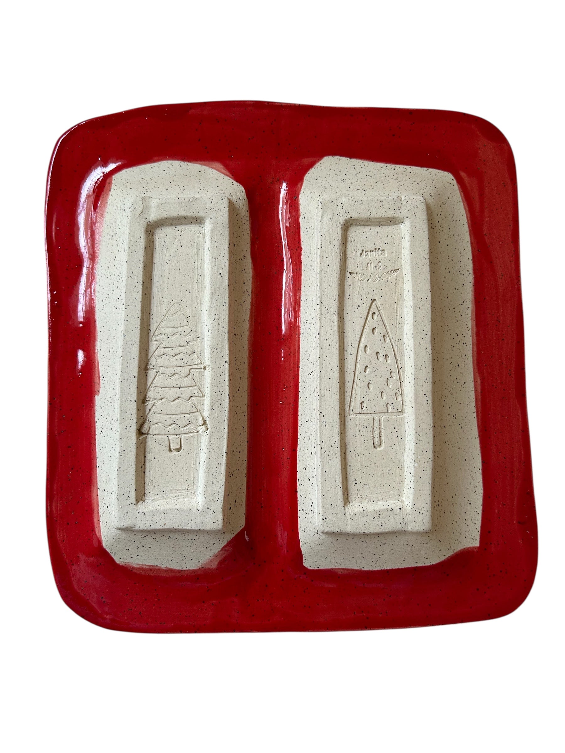 Small two-section holiday tray with cute monoprint Santa designs. Designed to hold a roll of crackers and a block of cheese or a dip. Slab construction. Food, microwave, and dishwasher safe.