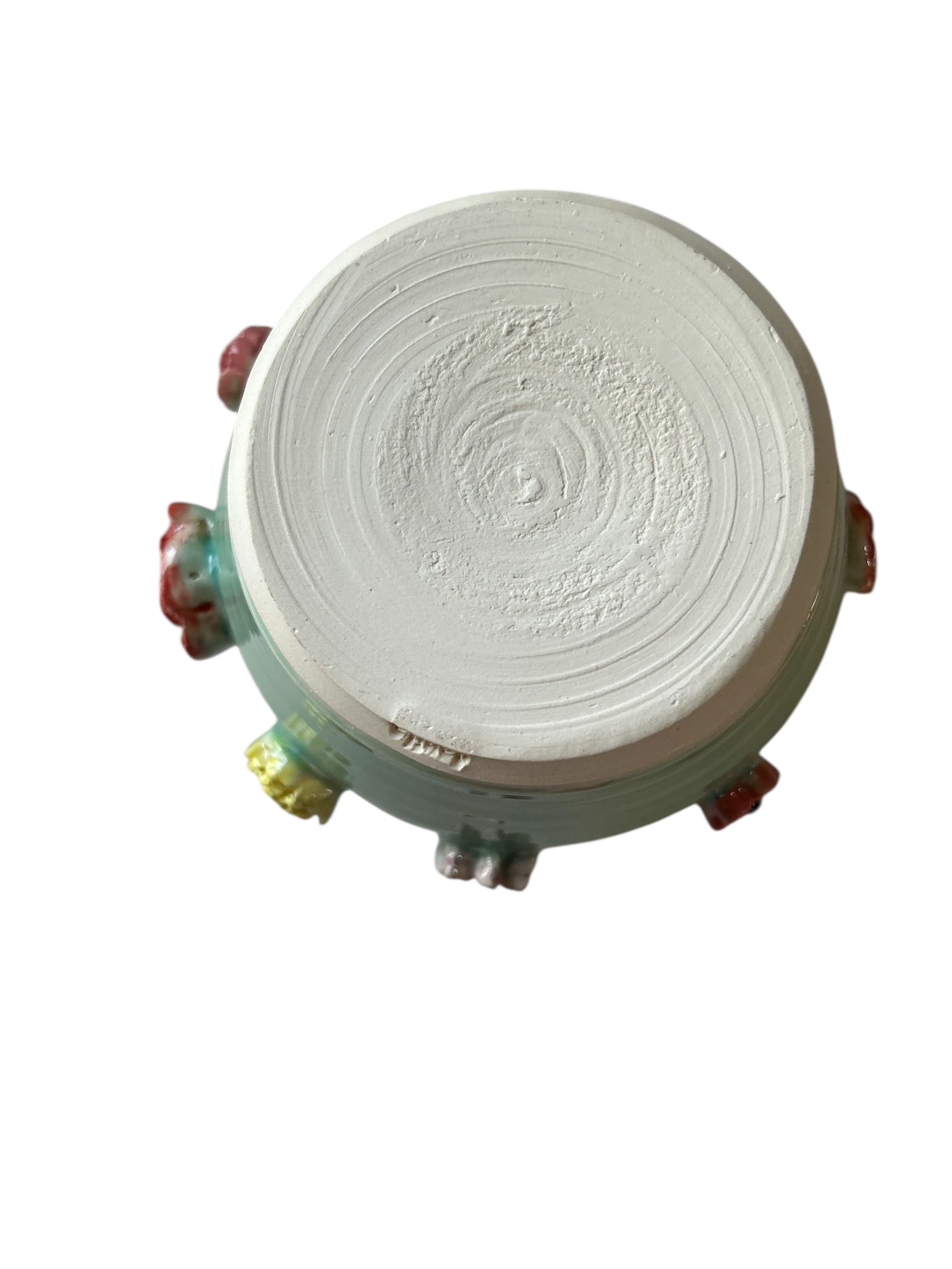 Small wheel-thrown planter in mint green flux glaze over succulent green base. Sprigged roses, daisies, carnations, and peonies adorn the surface. Perfect size for a succulent or baby airplane/spider plant. No drainage holes.