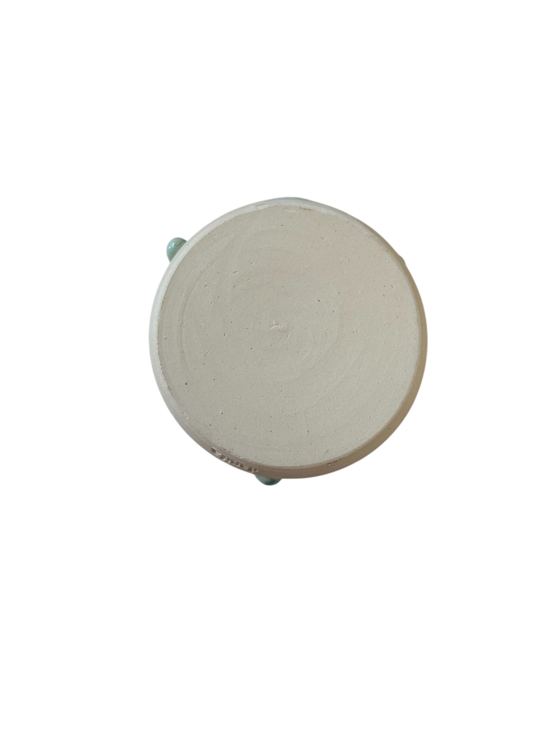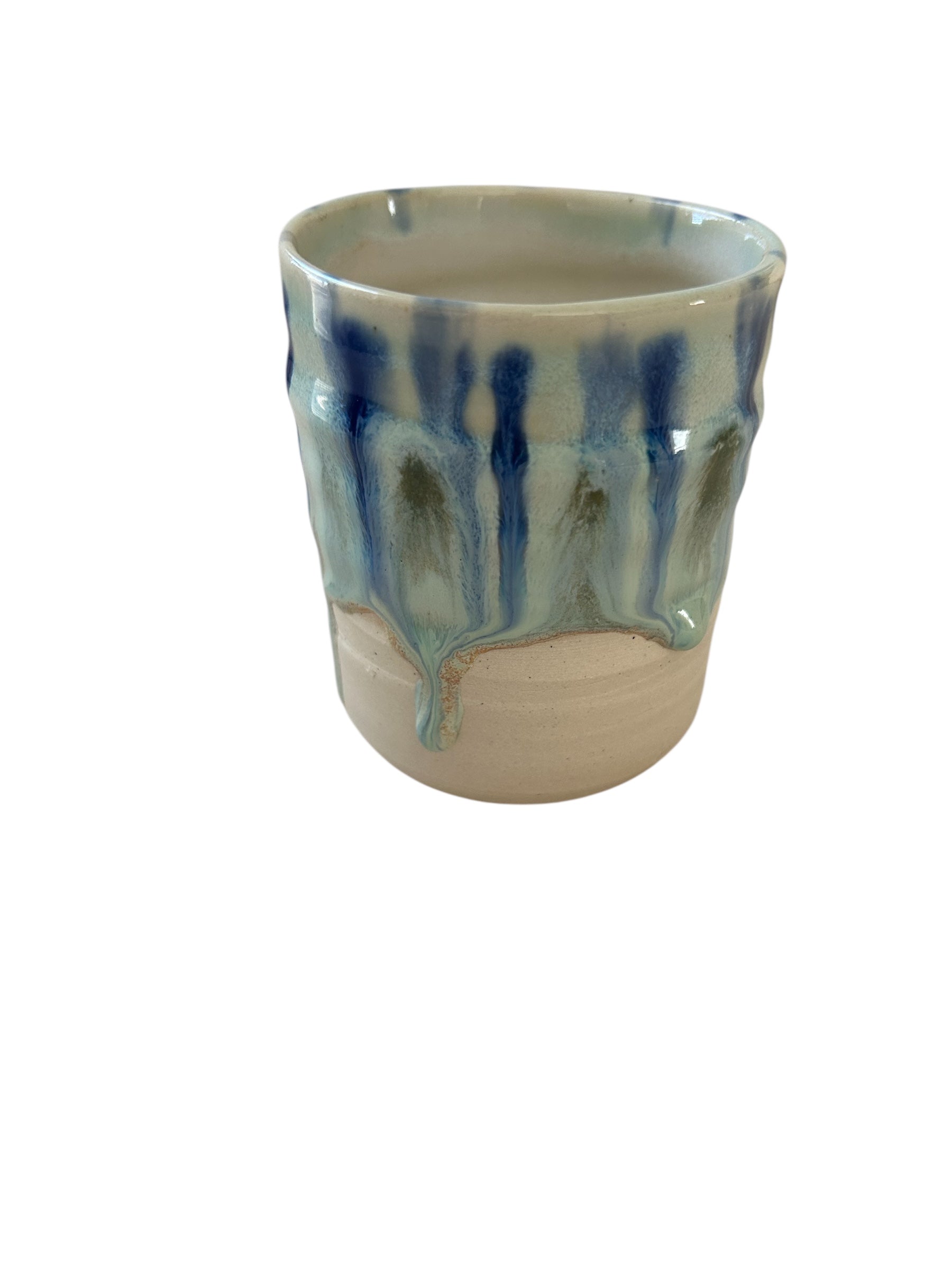 Small wheel-thrown tumbler that displays the peacock glazing method. Glaze is dripped from the rim or lip, and the bottom portion of the cup is unglazed for a textural contrast. This is a small cup (see product dimensions below). I use mine of this size as a juice cup in the morning, but it could work equally well as handle-free tea cup. Food, microwave, and dishwasher safe.