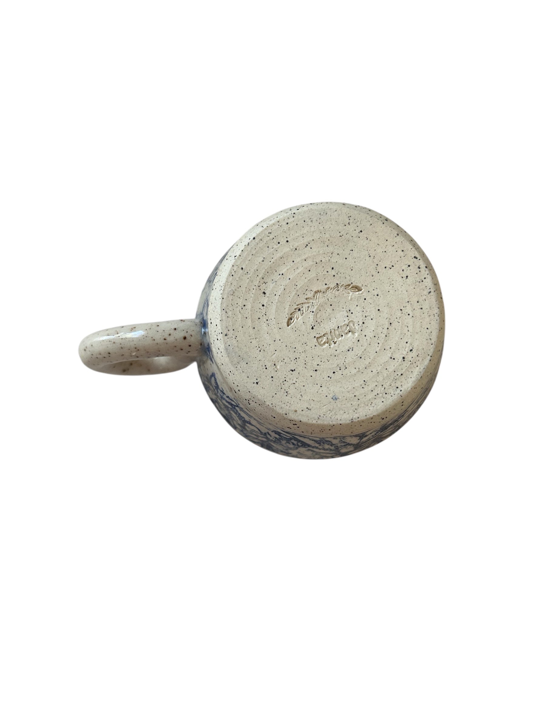Small wheel-thrown mug with monoprint snowy evergreen trees designs. Wheel-thrown construction. Speckled clay. Food, dishwasher, and microwave safe.