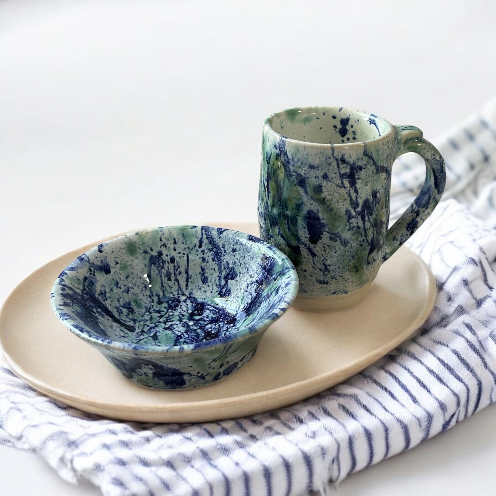 Set of mug and small general-purpose bowl with splatter designs in white, blue, and green. Mug will hold approximately 12 ounces of liquid, and bowl is the perfect size for single serving oatmeal or yogurt, or to catch the crumblies from your breakfast muffin. Wheel-thrown construction. All glazes are food safe, microwave safe, and dishwasher safe.