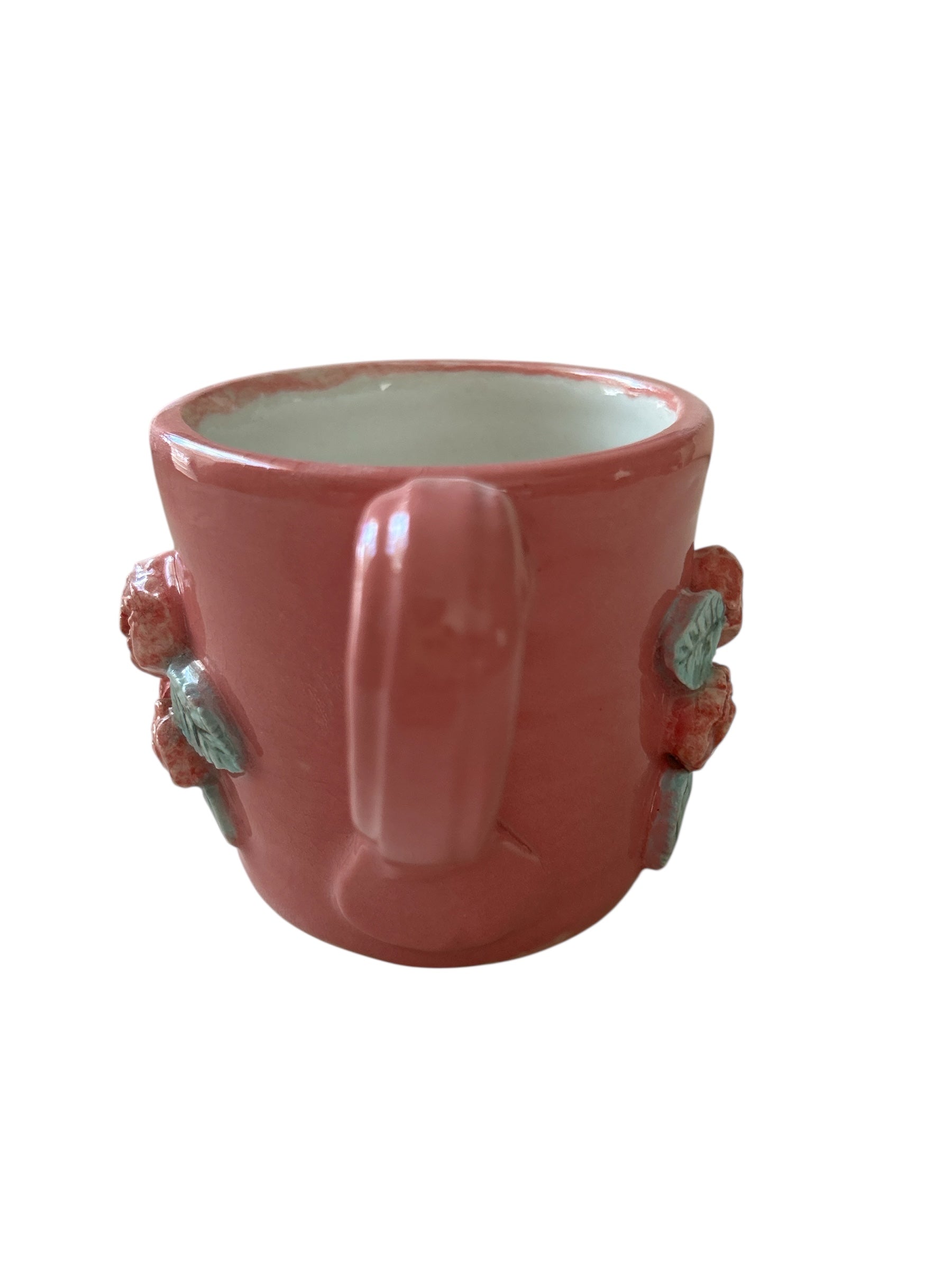 Prigged 8-ounce mug with red roses in relief from its pink surface.