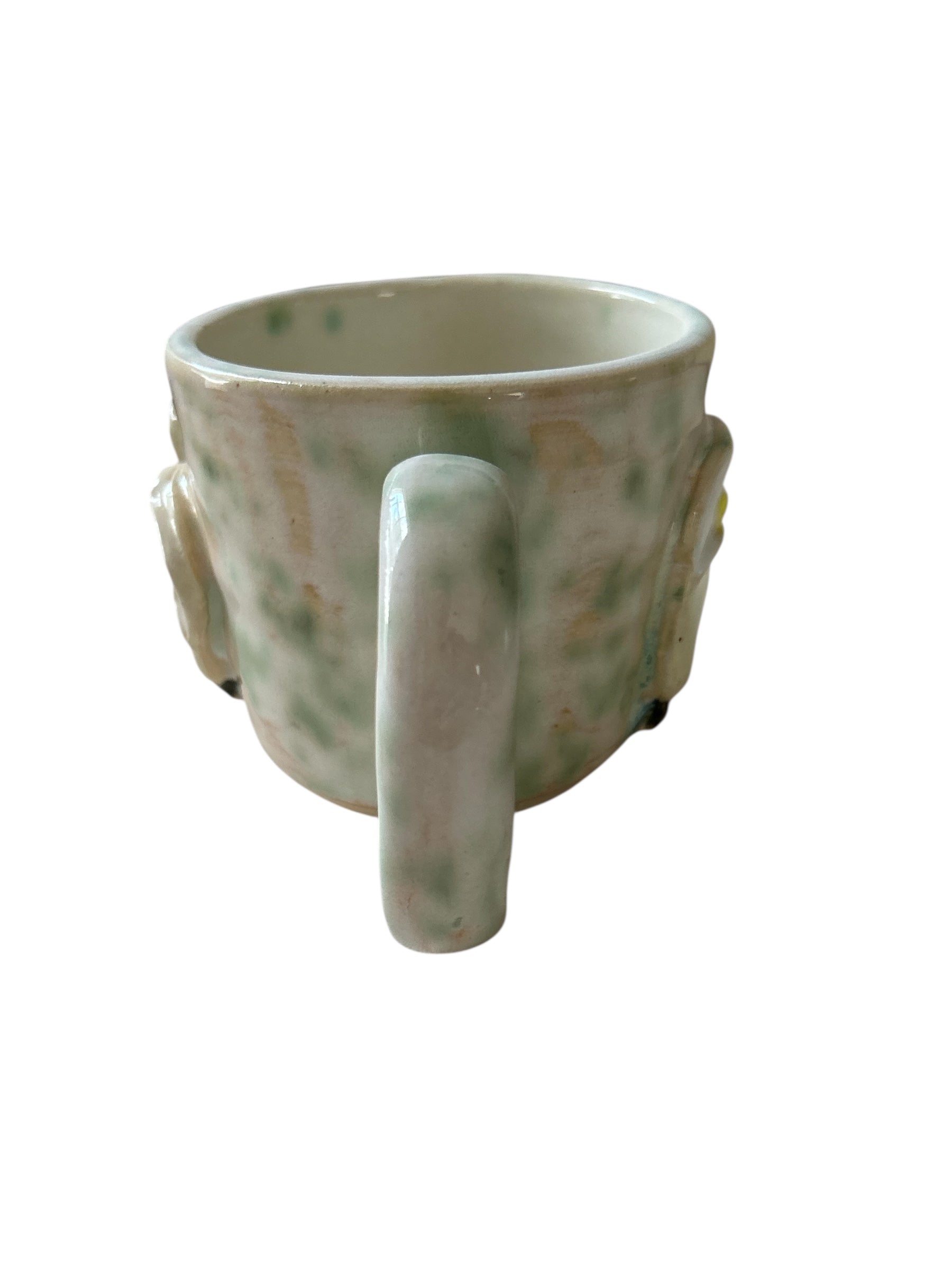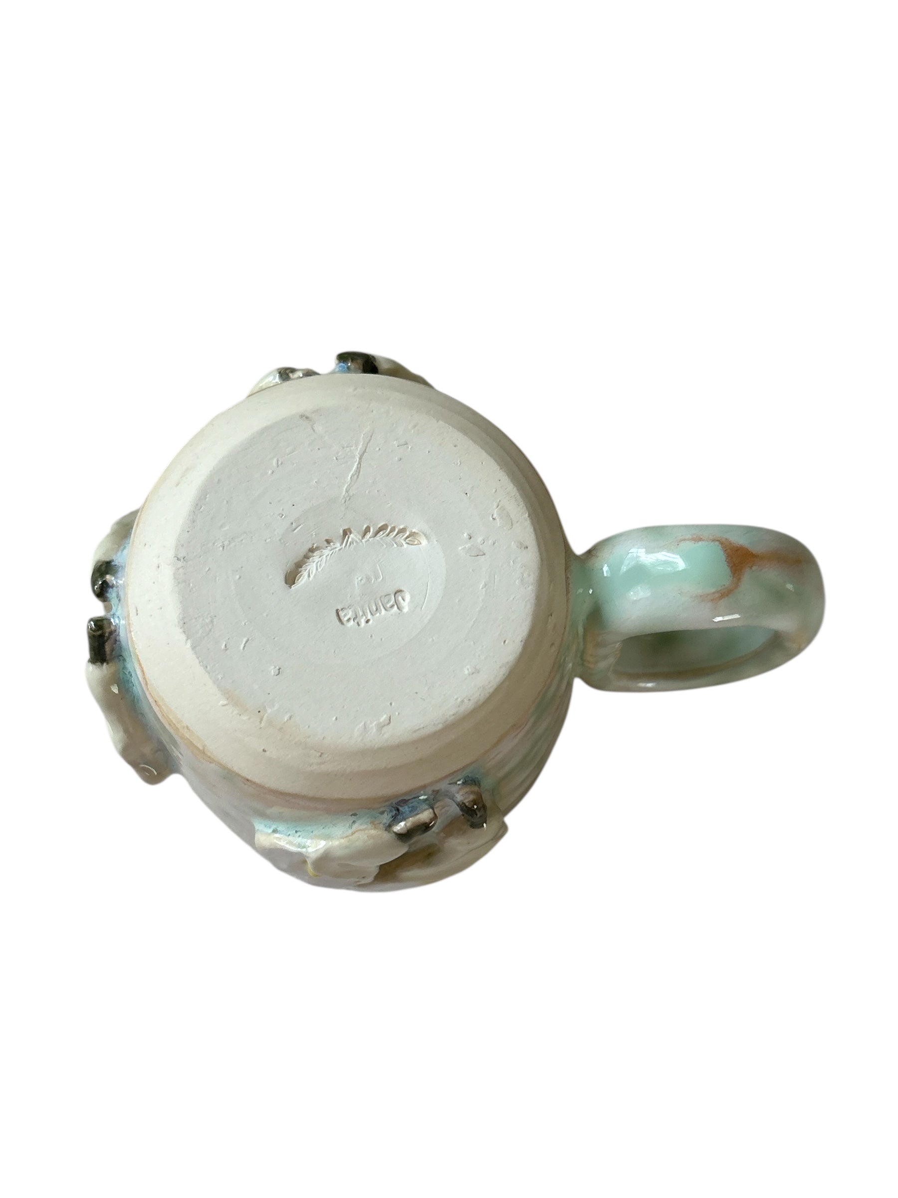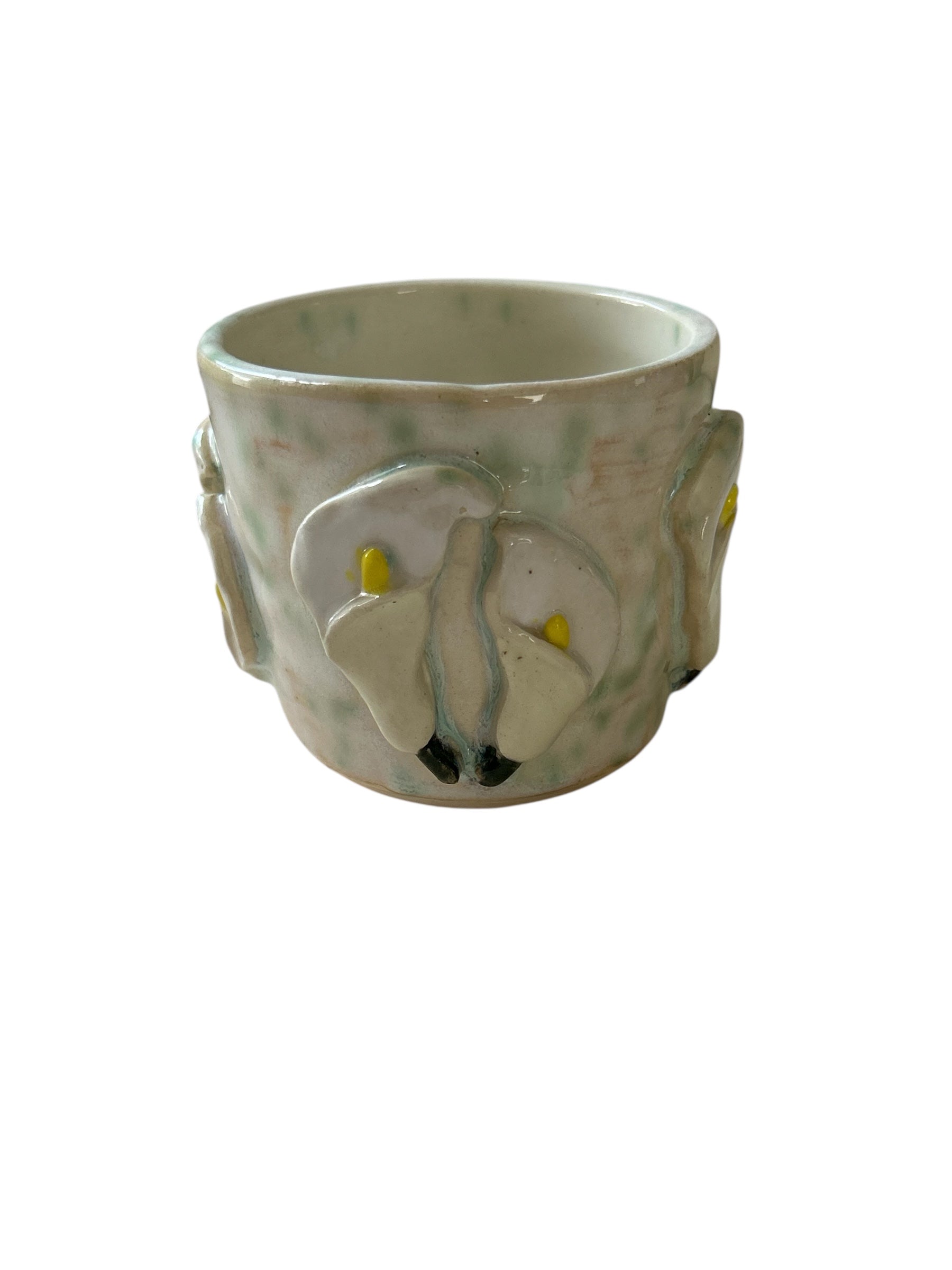 Wheel-thrown mug with sprigged white calla lilies set upon a drippy moss green mist flux glaze.