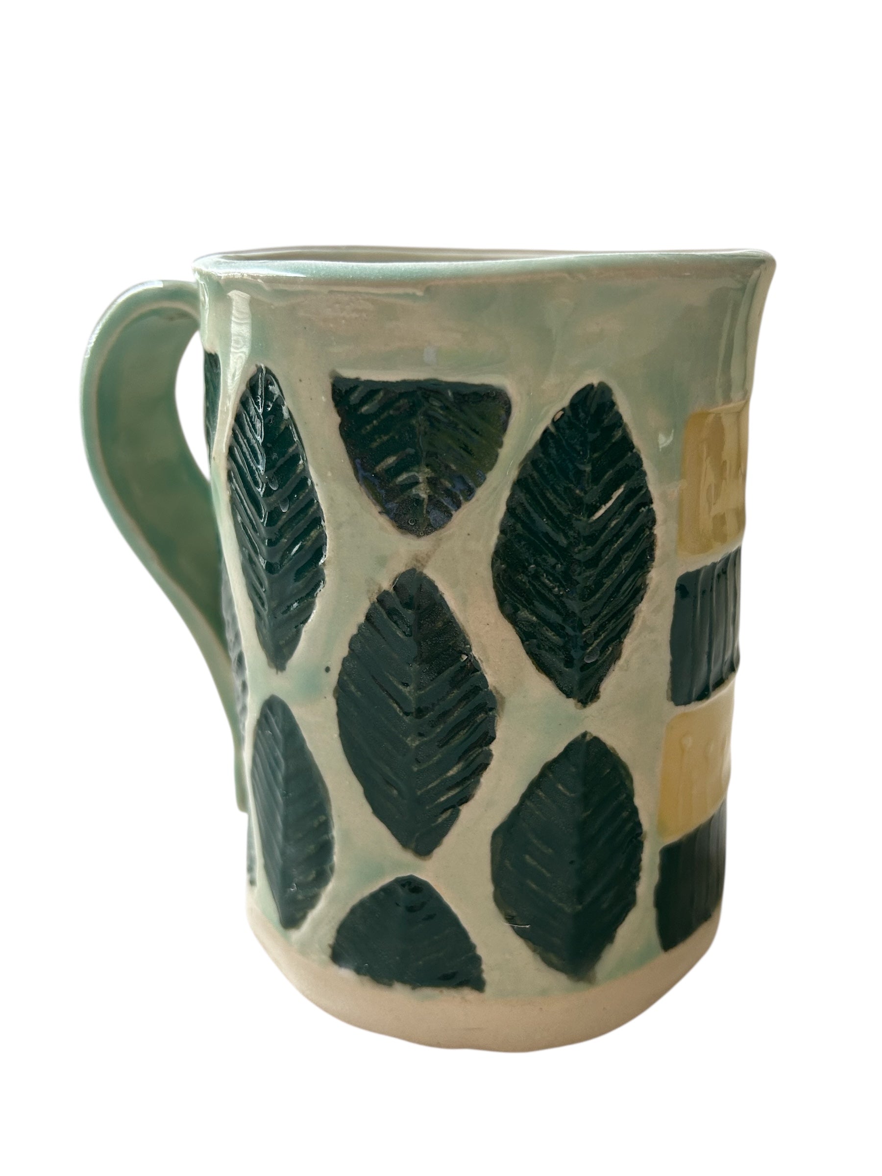 Stamped Leaf and Flower Mug #30 in Yellow and Dark Green