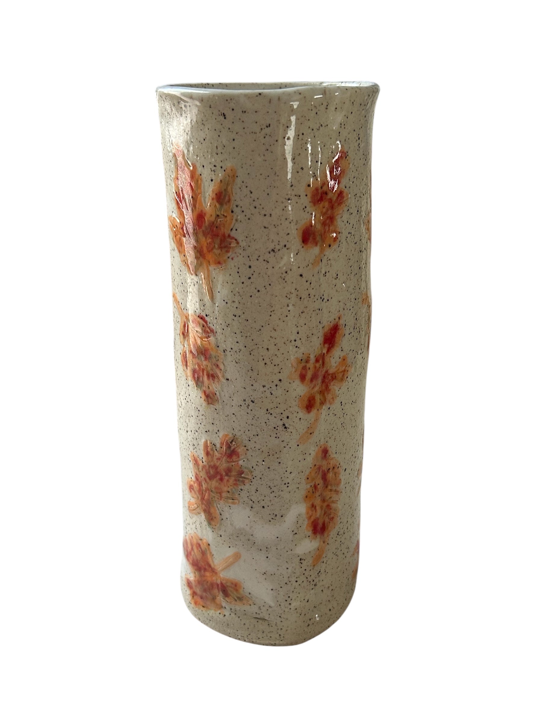 Tall Cylinder Vase #22 with Multicolored Fall Leaves on Speckled Clay