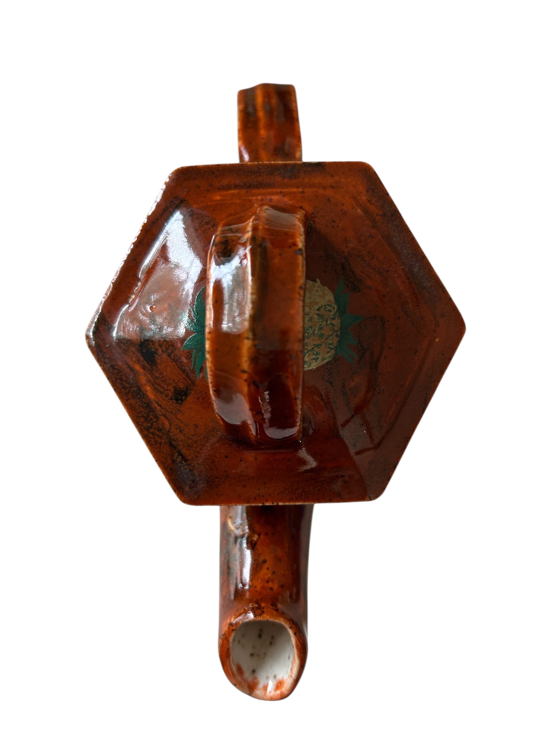 Tall extruded teapot with various "welcome" symbols from different cultures: apple, pineapples, and (fittingly) a brewed pot of tea. Symbols are ceramic decals that have been fired into the surface in a separate third firing, making them a permanent surface decoration. Vessel was extruded from a wall-mounted extruder using speckled stoneware clay. Teapot is glazed overall with food-safe glazes in deep sienna speckle, splattered black, and clear. It is food safe, but like all items with fired-on decals, handwashing is recommended.