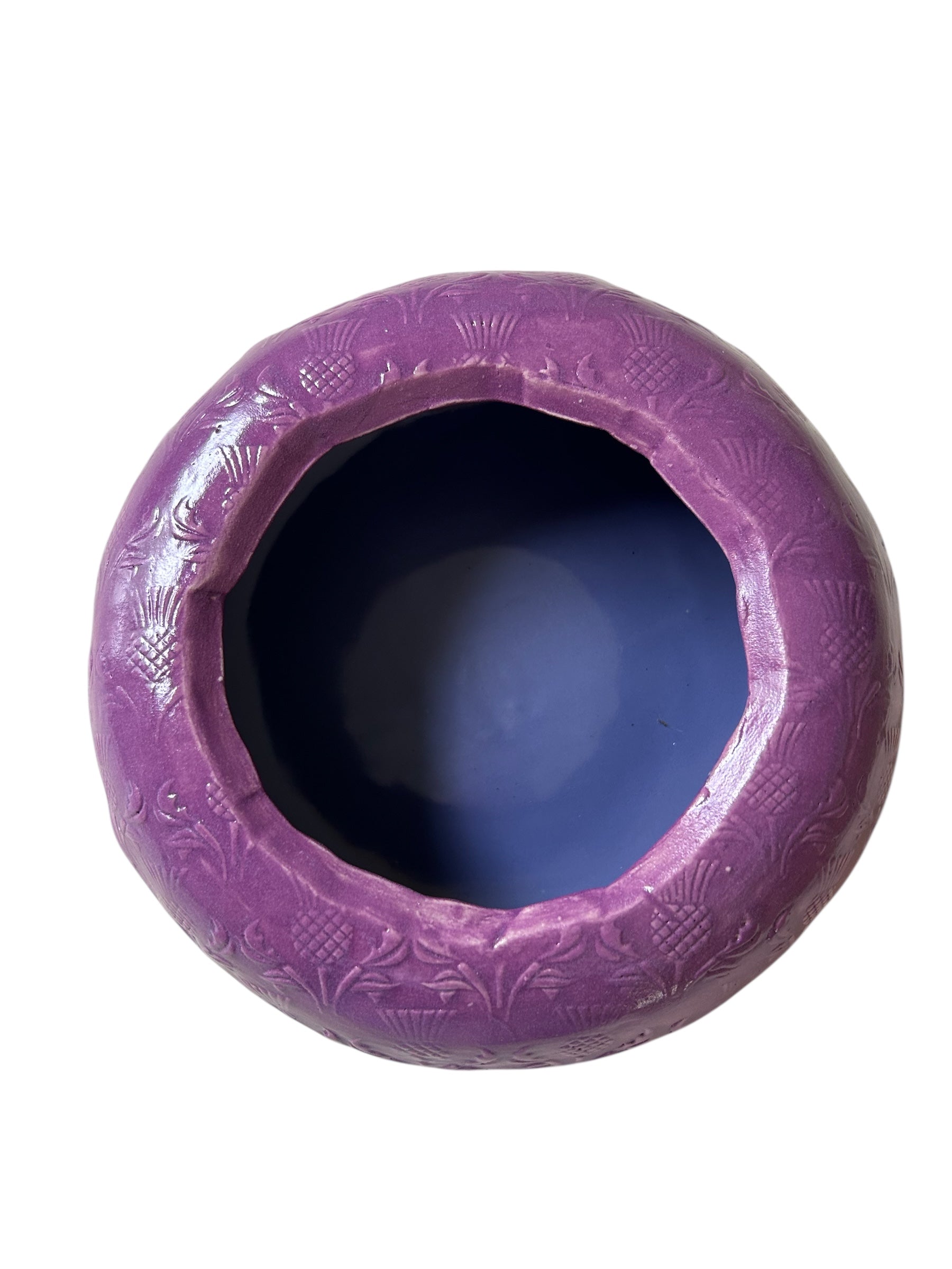 Puffy jar, sometimes called a flat moon jar, textured with the national flower of Scotland (my father's ancestry), the thistle. Handbuilt construction. Glazed inside and out with two tones of purple. Top has a sculpted thistle and leaves for easy lifting. Although it can be used to store or serve food, it was designed as a decorative piece or something to hold your special treasures.